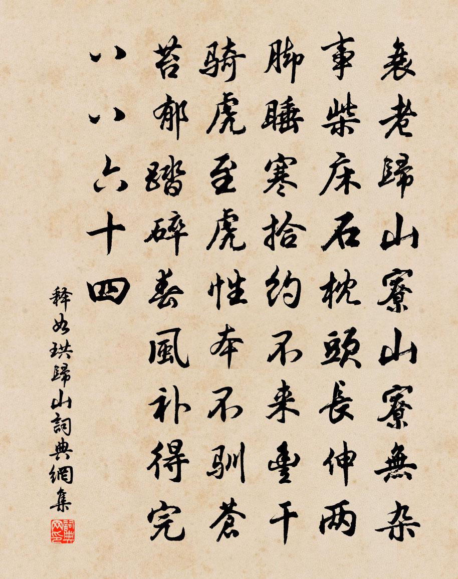 詩詞名句歷史字典書法欣賞書法字典國語詞典說文解字康熙字典古漢語字典標 題 作 者 詩 句 歸山作者:釋如珙 朝代:宋代歸山原文衰老歸山寮,山寮無雜事。柴床石枕頭,長伸兩腳睡。寒拾約不來,豐乾騎虎至。虎性本不馴,蒼苔郁踏碎。春風補得完,八八六十四。詩詞問答問:歸山的作者是誰?答:釋如珙問:歸山寫於哪個朝代?答:宋代釋如珙歸山書法欣賞歸山書法作品詩詞推薦水龍吟·載學士院有之辛棄疾〔宋代〕倚欄看碧成朱,等閒褪了香袍粉。上林高選,匆匆又換,紫雲衣潤。幾許春風,朝薰暮染,為花忙損。笑舊家桃李寄汴州令狐楚相公姚合〔唐代〕汴水從今不復渾,秋風鼙鼓動城根。梁園台館關東少,相府旌旗天下尊。詩好四方誰敢和,政成三郡自無冤。幾時女墳湖(即吳王葬女之所)皮日休〔唐代〕萬貴千奢已寂寥,可憐幽憤為誰嬌。須知韓重相思骨,直在芙蓉向下消。感舊絕句陸游〔宋代〕鴨翎堠前山簇馬,雞蹤橋下水連天。金丹煉成不肯服,且戲人間五百年。和子瞻監試舉人蘇轍〔宋代〕登科歲雲徂,舊學日將落。外遭饑寒侵,內苦憂患鑠。傳家足墳史,遺說本精約。群言久紛盪,開卷每驚矍。居官秋夜雨(客有道秋夜雨古詞,因用其韻,而不知角之為閣也。並付一笑)吳潛〔宋代〕雲頭電掣如金索。須臾天盡幃幕。一涼恩到骨,正驟雨、盆傾檐角。桃笙今夜難禁也,賴醉鄉、情分非薄。清夢何點絳唇向滈〔宋代〕屈指新冬,肅霜天氣重陽後。授衣時候。蘭菊香盈袖。此日生申,維岳鍾神秀。傾名酎。篆添金獸。共祝如椿壽。南都遇前嘉魚劉令,言游閩嶺,作此與之徐鉉〔唐代〕我持使節經韶石,君作閒遊過武夷。兩地山光成獨賞,隔年鄉思暗相知。洪厓壇上長岑寂,孺子亭前自別離。珍重太后閣春帖子趙湘〔唐代〕玉律生陽早,金鋪上日遲。枝間雙鵲語,應是報春祺。寄陳伯璣金陵王士禎〔清代〕東風作意吹楊柳,綠到蕪城第幾橋?欲折一枝寄相憶,隔江殘笛雨蕭蕭。和枯崖悟上人韻胡仲弓〔宋代〕相逢疑夙昔,不擬定交初。饋我詩盈軸,知君腹有書。空門容不得,吟屬問何如。雲是湯休輩,毋令相見疎。鶴鳴亭獨飲辛棄疾〔宋代〕小亭獨酌興悠哉,忽有清愁到酒杯。四面青山圍欲合,不知愁自那邊來。寄劉逸士尚顏〔唐代〕無愁無累者,偶向市朝游。此後乘孤艇,依前入亂流。高眠歌聖日,下釣坐清秋。道不離方寸,而能混俗求。和尚書詠煙徐夤〔唐代〕無根無蒂結還融,曾觸嵐光徹底空。不散幾知離畢雨,欲飛須待落花風。玲瓏薄展蛟綃片,冪歷輕含鳳竹叢。瓊什戲詠閒適陸游〔宋代〕涉世心知百不能,閉門嬾出病相仍。簞瓢味美如烹鼎,鄰曲人淳近結繩。半顆鴉殘牆外杏,一枯鵲裊澗邊藤。蕭然小毖佚名〔先秦〕予其懲,而毖後患。莫予荓蜂,自求辛螫。肇允彼桃蟲,拚飛維鳥。未堪家多難,予又集於蓼。題請息齋六言范成大〔宋代〕見影蜮猶鉍鉍,聞聲厖尚狺狺。問誰毛生名紙,知我角出車輪。野步晚歸陸游〔宋代〕江村十日喜霜晴,草死泥乾拄杖輕。溝港淺來無鷺下,郊原暖處有牛耕。賓士久厭兒童戲,淪落偏知世俗情。欲向浣溪沙程大昌〔宋代〕始待空冬歲不華。還教呈瑞怨貧家。若為高下總無嗟。日照華檐晴後雨,風吹飛絮臘前花。天公何事不由他。和薛仲止漁村雜詩十首劉黻〔宋代〕情性常嗤俗者勞,世間何處免風濤。小舟泊向荷花盪,一個漁翁熟睡高。名句推薦濁酒一杯家萬里,燕然未勒歸無計。范仲淹《漁家傲·秋思》 人間萬事,毫髮常重泰山輕。辛棄疾《水調歌頭·壬子三山被召陳端仁給事飲餞席上作》 已訴徵求貧到骨,正思戎馬淚盈巾。杜甫《又呈吳郎》 張翰江東去,正值秋風時。李白《送張舍人之江東》 天與火,同人;君子以類族辨物。佚名《易傳·象傳上·同人》 詩言志,歌永言佚名《尚書·虞書·舜典》 使君憐小阮,應念倚門愁。李嘉祐《送王牧往吉州謁王使君叔》 夫魚食其餌,乃牽於緡;人食其祿,乃服於君。姜子牙《六韜·文韜·文師》 秋聲萬戶竹,寒色五陵松。李頎《望秦川》 上無威,下生亂。來俊臣《羅織經·治下卷第三》