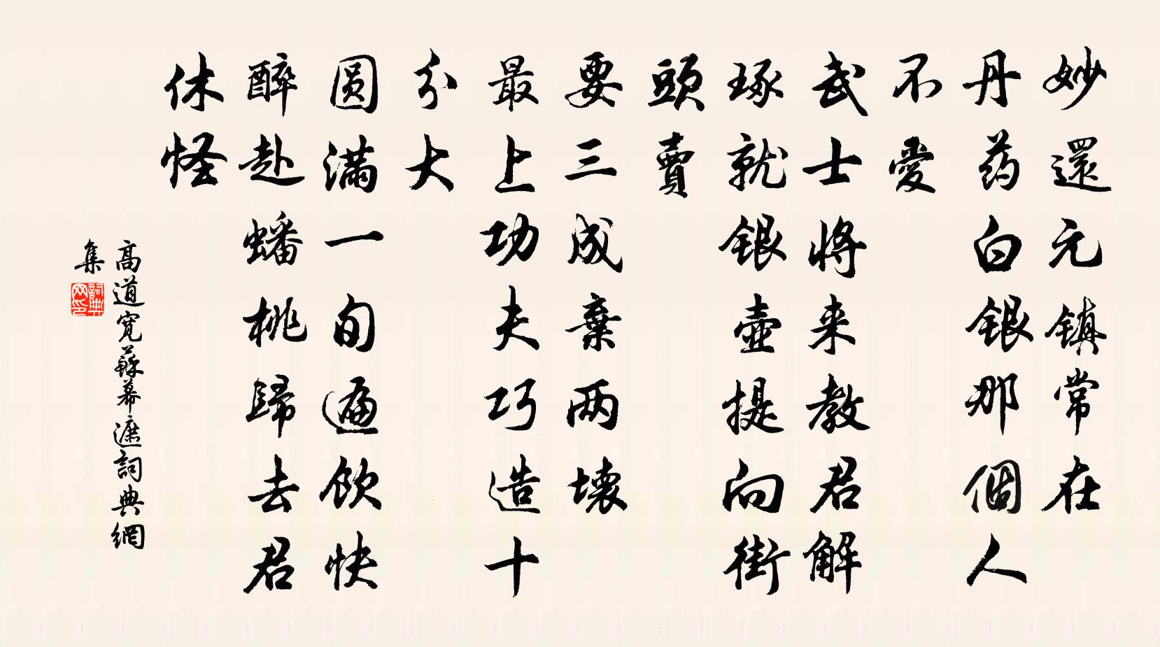 詩詞名句歷史字典書法欣賞書法字典國語詞典說文解字康熙字典古漢語字典標 題 作 者 詩 句 蘇幕遮作者:高道寬 朝代:元代蘇幕遮原文妙還元,鎮常在。丹藥白銀,那個人不愛。武士將來教君解。琢就銀壺,提向街頭賣。要三成,棄兩壞。最上功夫,巧造十分大。圓滿一旬遍飲快。醉赴蟠桃,歸去君休怪。詩詞問答問:蘇幕遮的作者是誰?答:高道寬問:蘇幕遮寫於哪個朝代?答:元代問:蘇幕遮是什麼體裁?答:詞高道寬蘇幕遮書法欣賞蘇幕遮書法作品詩詞推薦體齋詩為梁溪馮季求作敖陶孫〔宋代〕口復不自主,來吟體齋詩。三肅齋中人,問體安措辭。體卑語近拘,體高語近欺。耳目口鼻形,人各師其師。要之古樂府白紵四時歌黃庭堅〔宋代〕桃李欲開風雨多,籠弦束管奈春何。風休雨靜花滿地,時節去我如驚波。少年志願不成就,日月星辰役昏晝。俟河團垸俞大夫釋紹曇〔宋代〕貫鳳團花巧施設,黑漫漫地轉希奇。做教底板堅賓著,自有傍人彩畫伊。新晴西園散步四首楊萬里〔宋代〕池水初生蓋玉沙,雨余碧草臥堤斜。日搖波影纏橋柱,繡出欒枝遍地花。和博古直五首蒲壽宬〔宋代〕少壯能幾時,轉盼成白首。俯仰百年中,蠅營復狗苟。規規一世士,禮法自繩糾。不趁蟻磨旋,空嗟兔株守。杞菊初冬偶作寄南陽潤卿皮日休〔唐代〕寓居無事入清冬,雖設樽罍酒半空。白菊為霜翻帶紫,蒼苔因雨卻成紅。迎潮預遣收魚笱,防雪先教蓋鶴籠。唯待蝶戀花秦觀〔宋代〕紫燕雙飛深院靜。簟枕紗廚,睡起嬌如病。一線碧煙縈藻井。小鬟茶進龍香餅。拂拭菱花看寶鏡。玉指纖纖,捻唾郊廟歌辭。祀九宮貴神樂章。雍和佚名〔唐代〕俎豆有踐,黃流在尊。九宮之祀,三代莫存。樂變六宮,壇開八門。聖皇昭對,祐我黎元。偈頌十八首釋如淨〔宋代〕萬派朝宗一派收,揚清激濁幾經秋。忽然到底都乾卻,露柱燈籠笑不休。【南呂】一枝花_平林暮靄收奧敦周卿〔元代〕平林暮靄收,遠樹殘霞斂。疏星明碧漢,新月轉虛檐。院宇深嚴,人寂靜門初掩,控金鉤垂繡簾。噴寶獸香篆初殘和明遠喜雨作鄧肅〔宋代〕絳狗鳴空朱虎攫,神焦鬼爛不堪虐。自嗟筆力無韓豪,不敢讒風乾鼎鑊。聞說祥符物外臣,能將念力蘇罷民。挽出得兩金鋪乃秦漢門物以充水滴因作歌釋文珦〔宋代〕弁翁挽我入吟廬,示以秦漢雙金鋪。摩挲已覺銅腥盡,色如硃砂工模糊。翁說多年棄中野,野人視之猶土苴。我心驀山溪(墨梅、荊楚間鴛鴦梅、賦此)周純〔宋代〕江南春信,望斷人千里。魂夢入花枝,染相思、同心並蒂。鴛鴦名字,贏得一雙雙,無限意。凝煙水。念遠教誰寄柳梢青(壬子莆陽壺山閣)趙師俠〔宋代〕暑懷煩郁。危欄徙倚,凝情獨立。榕葉連陰,橫罔接秀,壺峰凝碧。海山雲樹微茫,更無數、歸帆暮集。卻憶瀟湘懷武夷紅石子二首貫休〔唐代〕常思紅石子,獨自住山椒。窗外猩猩語,爐中奼奼嬌。乳香諸洞滴,地秀眾峰朝。曾見奇人說,煙霞恨太遙。弋者送范漕子儀朱翌〔宋代〕乃公乃祖帝王師,勛在周家日月旗。德盛固宜長有後,材高如此用何遲。五更雨腳方收絕,六月雲峰正出奇。好去次韻酬答陳席慶伯見貽二首趙蕃〔宋代〕問君有賦敵相如,誰為君王誦子虛。去歲別家今未返,有親須養得安居。附名願見先友記,宣布曾傳太史書。清燕寓意十首次敬助韻 其一王冕〔元代〕元龍湖海豪,忘懷但高眠。淵明辟世士,素琴不張弦。古意各有適,薄俗空□妍。所以武陵翁,種桃竟忘年。聞鍾皎然〔唐代〕古寺寒山上,遠鍾揚好風。聲余月樹動,響盡霜天空。永夜一禪子,泠月丈心境中。午過橫林,回望惠山二首楊萬里〔宋代〕道是冰銷快水程,不知青女解藏冰。蘆花多處竹陰底,砌作瑤堤不計層。名句推薦倚闌凝望,獨立漁翁滿江雪。李綱《六么令·次韻和賀方回金陵懷古鄱陽席上作》 門外子規啼未休,山村落日夢悠悠。陳與義《送人歸京師》 更可惜,雪中高樹,香篝熏素被。周邦彥《花犯·小石梅花》 南國有佳人,容華若桃李。曹植《雜詩·南國有佳人》 還作江南會,翻疑夢裡逢。戴叔倫《客夜與故人偶集 / 江鄉故人偶集客舍》 川澤納污,所以成其深;山嶽藏疾,所以就其大。魏徵《隋書·列傳·卷十一》 桃花仙人種桃樹,又摘桃花換酒錢。唐寅《桃花庵歌》 一溪煙柳萬絲垂,無因系得蘭舟住。周紫芝《踏莎行·情似遊絲》 人悄悄,簾外月朧明。岳飛《小重山·昨夜寒蛩不住鳴》 一簞食,一瓢飲,在陋巷,人不堪其憂,回也不改其樂。賢哉,回也!孔子弟子《論語·雍也篇》
