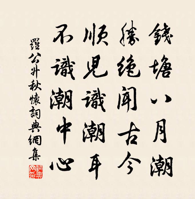 詩詞名句歷史字典書法欣賞書法字典國語詞典說文解字康熙字典古漢語字典標 題 作 者 詩 句 秋懷作者:羅公升 朝代:宋代秋懷原文錢塘八月潮,勝絕聞古今。順兒識潮耳,不識潮中心。詩詞問答問:秋懷的作者是誰?答:羅公升問:秋懷寫於哪個朝代?答:宋代問:秋懷是什麼體裁?答:五絕羅公升秋懷書法欣賞秋懷書法作品詩詞推薦題徐禮部家歸去來圖朱渙〔宋代〕古木參天叫杜鵑,春愁渾在夕陽邊。看君此畫還三嘆,憶得西江上水船。別董大二首高適〔唐代〕千里黃雲白日曛,北風吹雁雪紛紛。莫愁前路無知己,天下誰人不識君。六翮飄颻私自憐,一離京洛十餘年。丈夫勞山居寄呈吳處士皎然〔唐代〕官居鼎鼐古今無,名世才臣獨一餘。賢閣御題龍墨燦,詔歸補袞在須臾。寄永州徐三掾曹翁卷〔宋代〕聞說居官睡,千峰近九疑。合流皆楚水,高石半唐碑。香草寒猶錄,清猿夜更悲。其中多隱者,君去得逢誰。領客君子軒木芙蓉盛開分韻得紅字魏了翁〔宋代〕天公富萬有,盈宇何充充。秋風一搖落,所得緣手空。忽於臞悴中,睹此寒露叢。天然真富貴,送盡人間窮。雅傳鷓鴣天佚名〔宋代〕絳蠟銀台晃繡幃。一簾香霧擁金猊。人間歡會于飛宴,天上佳期乞巧時。傾合卺,醉淋漓。同心結了倍相宜。從今白雲林通〔宋代〕白雲亭構見浮圖,賢尹標名意有餘。閒抱石岩禪客座,影籠墨跡憲台書。玎璫玉溜無停響,瀟灑琅玕不用疏。登賞東園陸游〔宋代〕晨起東園去,消磨夏日長。隨鋤泉眼出,上爪藥苗香。琴掛山齋壁,龜搘道室床。始知彭澤令,真足傲羲皇。畫堂春佚名〔宋代〕畫堂當日誕今辰。慶門人降西真。一杯千歲祝遐齡。莫厭頻斟。不願頭白還黑,不願齒落重生。但容艷只如今。壽渾家門客聯句佚名〔唐代〕自與渾家鄰,馨香遂滿身。無心好清靜,人用去灰塵。 ——麻大終朝每去依煙火,春至還歸養子玉簪花鄭大惠〔宋代〕玉色瓷盆綠柄深,夜涼移向小窗陰。兒童莫訝心難展,未展心時玉似簪。呈沈同知白玉蟾〔宋代〕三面俱江一面湖,古今畫作水晶圖。門臨車馬紅塵道,身在冰霜碧玉壺。何道兩山俱翠紫,霅苕二水合清污。岸頭二月一日郡圃尋春二首楊萬里〔宋代〕中和節里半春天,一拂清寒半點暄。憔悴不勝梅欲落,嬌饒無對杏初繁。句陳瓘〔宋代〕哲宗怒常立,時宰罵林自。偈頌一百二十三首釋崇岳〔宋代〕這僧不妨懵懂,白兆終是惺惺。不惺惺,藥因救病出金瓶。酬薛員外誼苦熱行見寄皎然〔唐代〕六月金數伏,茲辰日在庚。炎曦爍肌膚,毒霧昏性情。安得奮輕翮,超遙出雲征。不知天地心,如何匠生成。火德次韻董伯和鐙夕有感二首陳著〔宋代〕數枝鐙火古祠門,妝點山中一哄春。俚語為求蠶麥福,隊游多是布荊人。強隨戲鼓看狂舞,忍聽嘶鼙入小顰。見說送中上人游天台陳允平〔宋代〕師作天台去,長亭復短亭。焚香參祖塔,振錫動山靈。石罅移菖歜,松根斸茯苓。何時白雲下,相與話青青。採桑子(一名醜奴兒、羅敷媚、羅敷艷歌)李煜〔唐代〕轆轤金井梧桐晚,幾樹驚秋。晝雨如愁,百尺蝦須上玉鉤。瓊窗春斷雙蛾皺,回首邊頭。欲寄鱗游,九曲寒波不溯天竺道中顧逢〔宋代〕沖開秋色去,深入萬松間。風月無邊樂,乾坤幾個閒。斷雲難掩日,急水不流山。樹杪忽然響,斜飛過白鷳。名句推薦不見年年遼海上,文章何處哭秋風?李賀《南園十三首》 梅子金黃杏子肥,麥花雪白菜花稀。范成大《四時田園雜興·其二》 上馬擊狂胡,下馬草軍書。陸游《觀大散關圖有感》 青春須早為,豈能長少年。孟郊《勸學》 無那塵緣容易絕,燕子依然,軟踏簾鉤說。納蘭性德《蝶戀花·辛苦最憐天上月》 三日柴門擁不開,階平庭滿白皚皚。柳宗元《酬王二十舍人雪中見寄》 不看僧面看佛面。吳承恩《西遊記·第三十一回》 心以啟智,智以啟財,財以啟眾,眾以啟賢,賢之有啟,以王天下。姜子牙《六韜·武韜·三疑》 花徑不曾緣客掃,蓬門今始為君開。杜甫《客至》 見性志誠,念念回首處,即是靈山。吳承恩《西遊記·第二十四回》