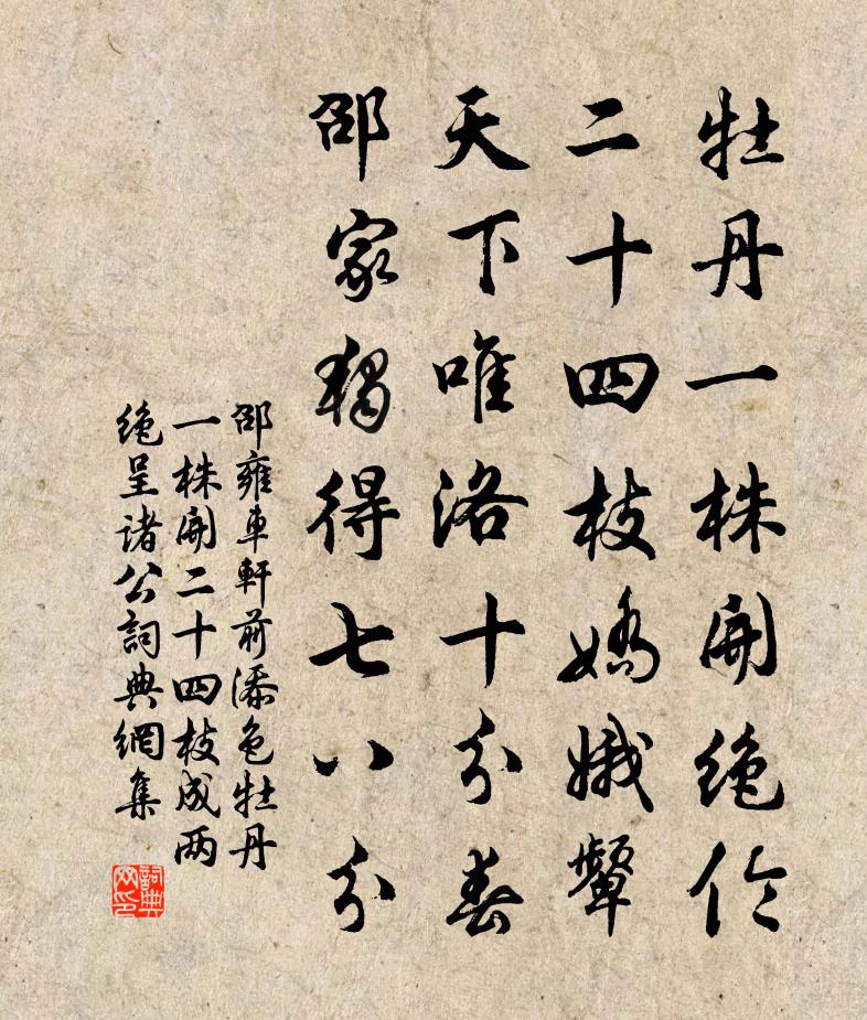 詩詞名句歷史字典書法欣賞書法字典國語詞典說文解字康熙字典古漢語字典標 題 作 者 詩 句 車軒前添色牡丹一株開二十四枝成兩絕呈諸公作者:邵雍 朝代:宋代原文牡丹一株開絕倫,二十四枝嬌娥顰。天下唯洛十分春,邵家獨得七八分。詩詞問答問:《車軒前添色牡丹一株開二十四枝成兩絕呈諸公》的作者是誰?答:邵雍問:該詩寫於哪個朝代?答:宋代書法欣賞車軒前添色牡丹一株開二十四枝成兩絕呈諸公書法作品詩詞推薦久雨五首劉克莊〔宋代〕久斷過從客,尤妨刈獲夫。羲和應爛醉,晨起失金烏。西江月馬鈺〔元代〕守拙宜乎寧耐。曾分秀氣三台。龍吟虎嘯去還來。明月清風自在。五道霞光覆載。神珠養就辭胎。一聲霹靂洞門開仲鹹見予一百六十韻賦詩相贈因以四韻答之王禹偁〔宋代〕勞將詩什比兵權,兵數雖多氣不全。烏合師徒空百萬,虎賁精銳只三千。楊鑣正突漁陽騎,避箭甘回赤壁船。若許七月初七夜渡黃河汪元量〔宋代〕長河界破東南天,怒濤日夜如奔川。此行適逢七月夕,妖氛散作空中煙。牛郎織女涉清淺,支機石上今何年。揚帆臨江仙山主〔元代〕幻化有人權積聚,緣生性本元無。飄飄身似畫檐蛛。懸絲一命,萬巧到頭虛。妄執情雲迷覺路,興衰往復還殊。風夜泛西湖五絕蘇軾〔宋代〕蒼龍已沒牛斗橫,東方芒角升長庚。漁人收筒及未曉,船過惟有菰蒲聲。到官病倦未嘗會客毛正仲惠茶乃以端午小集石蘇軾〔宋代〕我生亦何須,一飽萬想滅。胡為設方丈,養此膚寸舌。爾來又衰病,過午食輒噎。繆為淮海帥,每愧廚傳缺。爨無家園即事十三首鄭清之〔宋代〕樹底鳴鳩相唯諾,花間飛蝶自綢繆。二蟲得失聊堪笑,鴻鵠誰能問弈秋。送考訂朱夫子赴天台陳邦鑰〔宋代〕羸馬踏殘月,荷策登泮宮。入門見先生,先生何從容。循循善誘能啟下,青蒿因得附長松。短檠相對三百六十夜,黃超然參議和拙者去郡十五絕又以詩見寄屬痰吳芾〔宋代〕三復詩翁白雪篇,渴塵俄得醉心泉。高人固已追摩詰,好句還應壓玉川。快似涼風來木末,清如皓月出雲邊。呼兒幽居陸游〔宋代〕面面秋山擁翠屏,天留三畝著雲扃。迎霜南阜楓林赤,飽雨西村菜甲青。散策人驚衰後健,浩歌自覺醉中醒。凌煙詩二首宋高宗〔宋代〕隨宜飲酒聊充腹,取次衣裘亦暖身。未必得年非瘦薄,無妨長福是單貧。老龜豈羨犧牲飽,蟠木寧爭桃李春。隨分偈釋守芝〔宋代〕翠岩路嶮巇,舉步涉千溪。更有洪源水,滔滔在嶺西。問鼠劉黻〔宋代〕隻影投荒閱兩秋,汝曹何苦侮畸囚。詩書盡齧從誰愬,冠履俱傷重我羞。相國溷人寧處垢,永州某氏未輕投。翻盆蝶戀花楊 * 〔宋代〕百卉千花都綻後。浥露依風,翠影籠芳牖。杏臉桃腮勻著酒。青紅相映如攜手。一段簾絲風約透。妝點亭台,表里官舍早梅張謂〔唐代〕階下雙梅樹,春來畫不成。晚時花未落,陰處葉難生。摘子防人到,攀枝畏鳥驚。風光先占得,桃李莫相輕。和過尉氏林香陂韻強至〔宋代〕長年京洛事塵埃,懷抱那能一日開。魚鳥宿心聊此得,江湖清興劃然回。天園野色鱗鱗合,風獵林香滾滾來。漸有二年三月五日齋畢開素當食偶吟贈妻弘農郡君白居易〔唐代〕睡足肢體暢,晨起開中堂。初旭泛簾幕,微風拂衣裳。二婢扶盥櫛,雙童舁簟床。庭東有茂樹,其下多陰涼。前月偈頌一百五十首釋心月〔宋代〕一句如鐵橛子,少室秤提不起,曹溪搖感不動。有伎倆者一任左扶右持,無伎倆者不妨全體受用。巴蓬集壁,去天唐多令(中秋)魏了翁〔宋代〕輕露濯秋風,新樓插太空。更遭逢、解事天公。為喚羲和驅六馬,將杲日、掛簾櫳。日影正沈紅。須臾月在東。百名句推薦朝見馬嶺黃沙合,夕望龍城陣雲起。盧思道《從軍行》 黃金燃桂盡,壯志逐年衰。孟浩然《秦中感秋寄遠上人 / 秦中寄遠上人》 萬里悲秋常作客,百年多病獨登台。杜甫《登高》 今日俸錢過十萬,與君營奠復營齋。元稹《遣悲懷三首·其一》 功名富貴逐世轉移,而氣節千載一時。洪應明《菜根譚·概論》 使人有乍交之歡,不若使人無久處之厭。陳繼儒《小窗幽記·集醒篇》 桃花落,閒池閣。山盟雖在,錦書難托。陸游《釵頭鳳·紅酥手》 貧者士之常也,死者人之終也,處常得終,當何憂哉?列子及其弟子《列子·天瑞》 野蔬充膳甘長藿,落葉添薪仰古槐。元稹《遣悲懷三首·其一》 尋尋覓覓,冷冷清清,淒悽慘慘戚戚。李清照《聲聲慢·尋尋覓覓》