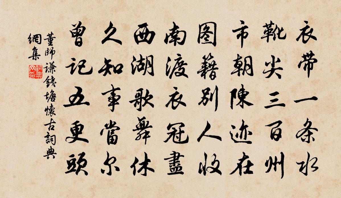詩詞名句歷史字典書法欣賞書法字典國語詞典說文解字康熙字典古漢語字典標 題 作 者 詩 句 錢塘懷古作者:董師謙 朝代:宋代錢塘懷古原文衣帶一條水,靴尖三百州。市朝陳跡在,圖籍別人收。南渡衣冠盡,西湖歌舞休。久知事當爾,曾記五更頭。詩詞問答問:錢塘懷古的作者是誰?答:董師謙問:錢塘懷古寫於哪個朝代?答:宋代董師謙錢塘懷古書法欣賞錢塘懷古書法作品詩詞推薦木蘭花/玉樓春晏幾道〔宋代〕風簾向曉寒成陣。來報東風訊息近。試從梅蒂紫邊尋,更繞柳枝柔處問。來遲不是春無信。開晚卻疑花有恨。又應苦熱二首宋祁〔宋代〕秋陽晝長不可度,身被單葛如重裘。何當急雨洗天地,坐使清風還九州。余襄公祠楊蟠〔宋代〕或業終令萬古傳,豈惟文采動當年。曲江相繼成雙廟,慶厲同稱有四賢。頌古二十七首釋雲賁〔宋代〕兩手擎來教放下,空身立地更疑猜。根塵識界無尋處,多謝春風爛漫開。即事舒岳祥〔宋代〕二月東風始見梅,山童折得數枝來。銅瓶棐幾修清供,香鼎中間易卷開。歲莫官舍書懷二首王炎〔宋代〕九霄側目不飛揚,落在荊湖又一霜。寒日無輝溪水凍,春風有信野梅香。少年豪氣今揫斂,小隱生涯尚渺茫。嘆息驀山溪晁端禮〔宋代〕廣寒宮殿,千里同雲曉。飛雪滿空來,翦雲英、群仙齊到。亂飄僧舍,密處灑歌樓,閒日少。風光好。且共賓朋笑傷春華岳〔宋代〕衣袂 * ,春在江南岸。我意正傷春,復被春縈絆。一雨胭脂濕,萬壑冰澌泮。撩我惜春心,與春傷爛漫。柳垂暮春雜詠八首曾協〔宋代〕目斷江頭樹,襟被海上風。荷鋤偕婦子,擲釣共兒童。晚筀關心碧,秋蓮滿意紅。歌聲何處起,舞手為年豐。明發祈門悟法寺,溪行險絕六首楊萬里〔宋代〕山不人煙水不橋,溪聲浩浩雨蕭蕭。何須雙鷺相溫暖,鷺過還教轉寂寥。贈王尊師劉得仁〔唐代〕為道常日損,尊師修此心。掛肩黃布被,穿發白蒿簪。符札靈砂字,弦彈古素琴。囊中曾有藥,點土亦成金。和吳沖卿鴉鳴樹石屏王安石〔宋代〕寒林昏鴉相與還,下有跂石蒼孱顏。曾於古圖見彷佛,已怪刀筆非人間。君家石屏誰為寫,古圖所傳無似者。鴉飛寄題蘇子美滄浪亭韓維〔宋代〕聞君買宅洞庭傍,白水千畦插稻身。生事已能支伏臘,歲華全得屬文章。騫飛靈鳳知何暮,蟠蟄蛟龍未可量。莫以江城子(三之三)秦觀〔宋代〕棗花金釧約柔荑。昔曾攜。事難期。咫尺玉顏,和淚鎖春閨。恰似小園桃與李,雖同處,不同枝。玉笙初度顫鸞篦余以前年五月八日到官今年又於此日去郡同僚吳芾〔宋代〕來守江山恰二年,同僚何幸得諸賢。屢邀風月供吟筆,幾度江山棹酒船。自分衰頹今老矣,可堪離索更悽然。青雲十五日再登祝融峰用台字韻林用中〔宋代〕惆悵獨徘徊,晴嵐繞古台。日從東海上,人自北山回。峰老曾經雪,天寒不放梅。野僧憐我倦,相觀酒盈杯。次韻恢大山擬古三首方回〔宋代〕六度莫先慧,三風尤惡頑。此心朗如鏡,磨盡青銅斑。微利毫髮計,虛名分寸攀。朝市多此人,平地劍門關。老夫經夫差廟陳羽〔唐代〕姑蘇城畔千年木,刻作夫差廟裡神。冠蓋寂寥塵滿室,不知簫鼓樂何人。漁父詞佚名〔宋代〕江渚春風淡盪時。斜陽芳草鷓鴣飛。蓴菜滑,白魚肥。浮家泛宅不曾歸。道過京師二首曹勛〔宋代〕離離禾黍滿東郊,秋入鴉聲處處嬌。敗壁斷垣成悵望,一鞭又過懊來橋。名句推薦若順吾皇意,即無臣子心。棲蟾《送遷客》 但存方寸地,留與子孫耕。馮夢龍《喻世明言·卷二十二》 夫有尤物,足以移人左丘明《左傳·昭公·昭公二十八年》 稻根科斗行如塊,田水今年一尺寬。范成大《夏日田園雜興》 即從巴峽穿巫峽,便下襄陽向洛陽。杜甫《聞官軍收河南河北》 雖然不如延年妹,亦是當時絕世人。李白《中山孺子妾歌》 賈生年少虛垂淚,王粲春來更遠遊。李商隱《安定城樓》 去年米貴闕軍食,今年米賤大傷農。杜甫《歲晏行》 候館梅殘,溪橋柳細。歐陽修《踏莎行·候館梅殘》 故人在其下,塵土相豗蹴。蘇軾《送頓起》