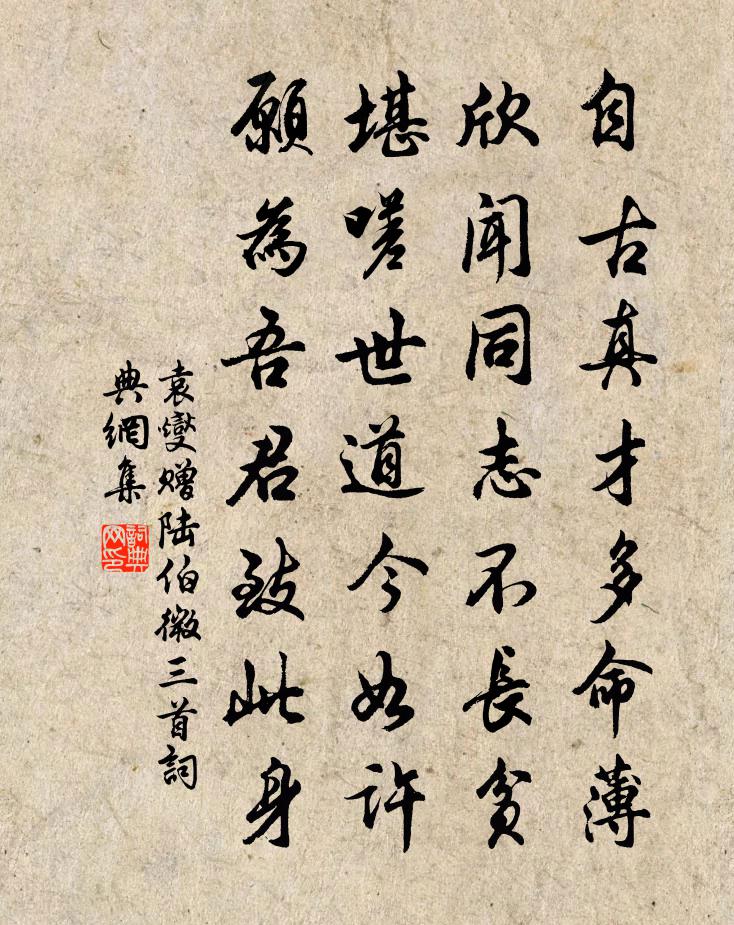 詩詞名句歷史字典書法欣賞書法字典國語詞典說文解字康熙字典古漢語字典標 題 作 者 詩 句 贈陸伯微三首作者:袁燮 朝代:宋代贈陸伯微三首原文自古真才多命薄,欣聞同志不長貧,堪嗟世道今如許,願為吾君致此身。詩詞問答問:贈陸伯微三首的作者是誰?答:袁燮問:贈陸伯微三首寫於哪個朝代?答:宋代袁燮贈陸伯微三首書法欣賞贈陸伯微三首書法作品詩詞推薦江行夜宿龍吼灘,臨眺思峨眉隱者,兼寄幕中岑參〔唐代〕官舍臨江口,灘聲入慣聞。水煙晴吐月,山火夜燒雲。且欲尋方士,無心戀使君。異鄉何可住,況復久離群。水龍吟(夜宿化城,得張安國長短句,戲用其韻)韓元吉〔宋代〕五溪深鎖煙霞,定知不是人間世。軒然九老,排雲一笑,蒼顏相對。星斗垂空,月華隨步,酒醒無寐。□廣寒已近偶成衛宗武〔宋代〕平生夢不遇邯鄲,學道求仙興已闌。旋改詩編入新刻,重尋琴譜發清彈。不慚晚境為寒峻,翻笑當年慕勢官。志業張持道生辰三首郭印〔宋代〕幾下陳番榻,常窺孔氏牆。玄通融釋老,廓落傲羲皇。永祝千齡壽,從今一瓣香。玉枝長不汗,莫問鬢邊霜。鷓鴣天李清照〔宋代〕暗淡輕黃體性柔,情疏跡遠只香留。何須淺碧深紅色,自是花中第一流。梅定妒,菊應羞,畫欄開處冠中秋。騷人和子由記園中草木十一首蘇軾〔宋代〕芎窮生蜀道,白芷來江南。漂流到關輔,猶不失芳甘。濯濯翠莖滿,愔愔清露涵。及其未花實,可以資筐藍。秋節秋暑極熾而雨作涼氣翛然舒邦佐〔宋代〕日輪停午汗珠融,簾箔都無半點風。喚起睡龍行一雨,病身移入水晶宮。湘中別成威闍黎李群玉〔唐代〕至哉彼上人,冰霜凜規則。游心杳何境,宴坐入冥默。解空與密行,名臘信崇德。吐論駕秋濤,龍宮發胸臆。群迷題陳毅甫家壁戴復古〔宋代〕朱門金叵羅,九醖葡萄春。酌貴不酌賤,酌富不酌貧。君家破茅屋,飄搖河水濱。中有一樽淥,醉盡天下人。論詩寄碩父五首趙蕃〔宋代〕溧陽罕賢才,兩沈好兄弟。讀書不求功,其涯未可既。古人豈難到,顧我力行爾。茲道果何如,在此不在彼。次梧州卻寄永州使君周朴〔唐代〕隨風身不定,今夜在蒼梧。客淚有時有,猿聲無處無。潮添瘴海闊,煙拂粵山孤。卻憶零陵住,吟詩半玉壺。送周尚書弘正詩 一庾信〔南北朝〕交河望合浦。玄菟想朱鳶。共此無期別。知應復幾年。和文與可洋州園亭三十詠其十五無言亭蘇轍〔宋代〕處世欲無言,事至或未可。唯有此亭空,宴坐聊從我。檳榔鄭域〔宋代〕海角人煙百萬家,蠻風未變事堪嗟。果堆羊豕烏青欖,菜飣丁香紫白茄。楊棗實酸薄納子,山荼無葉木棉花。一般秦淮歌乾隆〔清代〕祖龍東巡壓王氣,通淮鑿斷方山埭。痴心慮後五百年,詎知亡秦在二世。長源因此名秦淮,縈紆建業達水隈。時塞劍門周敦頤〔宋代〕劍立溪峰信險深,吾皇大道正天心。百年外戶都無閉,空有關名點貢琛。楊劉王安石〔宋代〕人各有是非,犯時為患害。唯詩以譎諫,言者得無悔。汾王昔監謗,變雅今尚載。末俗忌諱繁,此理寧復在。南山南樓中望所遲客謝靈運〔南北朝〕杳杳日西頹,漫漫長路迫。登樓為誰思?臨江遲來客。與我別所期,期在三五夕。圓景早已滿,佳人猶未適。即事挽趙秋曉羅附鳳〔宋代〕發軔功名發未華,轉頭世事已堪嗟。晚栽栗里歸田菊,早看長安得意花。空憶去鴻留爪跡,只今舊燕傍誰家。重尋辛丑十一月十九日既與子由別於鄭州西門之外蘇軾〔宋代〕不飲胡為醉兀兀,此心已逐歸鞍發。歸人猶自念庭闈,今我何以慰寂寞。登高回首坡壠隔,惟見烏帽出復沒。苦寒名句推薦苦心中常得悅心之趣;得意時便一失意之悲。洪應明《菜根譚·概論》 橫眉冷對千夫指,俯首甘為孺子牛。魯迅《自嘲》 瑤池阿母綺窗開,黃竹歌聲動地哀李商隱《瑤池》 雨窗和淚搖湘管。意長箋短。許棐《後庭花·一春不識西湖面》 憑誰問,廉頗老矣,尚能飯否?辛棄疾《永遇樂·京口北固亭懷古》 不見穿針婦,空懷故國樓。孟浩然《他鄉七夕》 已駕七香車,心心待曉霞。李商隱《壬申七夕》 任賢勿貳,去邪勿疑。佚名《尚書·虞書·大禹謨》 不見南師久,謾說北群空。陳亮《水調歌頭·送章德茂大卿使虜》 人生百年有幾,念良辰美景,休放虛過。元好問《驟雨打新荷》