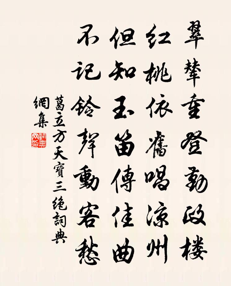 詩詞名句歷史字典書法欣賞書法字典國語詞典說文解字康熙字典古漢語字典標 題 作 者 詩 句 天寶三絕作者:葛立方 朝代:宋代天寶三絕原文翠輦重登勤政樓,紅桃依舊唱涼州。但知玉笛傳佳曲,不記鈴聲動客愁。詩詞問答問:天寶三絕的作者是誰?答:葛立方問:天寶三絕寫於哪個朝代?答:宋代葛立方天寶三絕書法欣賞天寶三絕書法作品詩詞推薦與潘王二丈同游南康郡圃致爽亭陳宓〔宋代〕瀑秩秩而可聞,山靡靡而旁繞。待皓月於台端,睇明河於木杪。古意梅堯臣〔宋代〕故人留雅曲,今與新 * 。新人聽不足,復使後人歡。張伯修令君賦詩同韻稱慶程公許〔宋代〕玉節何如素節高,歸來喜氣溢東皋。存耕元自有餘地,嘉植何曾生不毛。採石勛名須世濟,陵陽今昔幾人豪。含飴贈山人二首趙文〔宋代〕谷陵岸谷本何常,儘是盤龍夢裡岡。欲買一丘埋渾沌,卻教世上再曦黃。戲作樓鑰〔宋代〕二子為丞分越邑,女兒隨婿過江南。莫言屋裡成岑寂,匹似當初只住庵。奉陪武相公西亭夜宴陸郎中佚名〔唐代〕仙郎膺上才,夜宴接三台。燭引銀河轉,花連錦帳開。靜看歌扇舉,不覺舞腰回。寥落東方曙,無辭盡玉杯。次何子應登賦樓韻王灼〔宋代〕使君來作牧,眾若倚南山。時節當授衣,已念赤子寒。駕言出登眺,豈為景趣繁。民風指顧中,惠術良欲殫。紓懷答子勉三首黃庭堅〔宋代〕君不登郎省,還應上諫坡。才高殊未識,歲晚幸無他。櫪馬羸難出,鄰雞凍不歌。寒爐余幾火,灰里撥陰何。驚人滿江紅 復用前韻有懷西溪梁園之游王惲〔元代〕書劍梁園,憶曾是、青*遊客。宮苑廢、三山依約,綠雲紅雪。好在西溪王老子,留連醉盡花時節。記尊前、金縷西歸贊釋智遇〔宋代〕壁觀九年,葫蘆按水。無計脫身,強分皮髓。只履棲棲何處歸。月明後夜思熊耳。蘇端林亭對酒喜雨錢起〔唐代〕小雨飛林頂,浮涼入晚多。能知留客處,偏與好風過。濯錦翻紅蕊,跳珠亂碧荷。芳尊深幾許,此興可酣歌。次韻送張文煥方回〔宋代〕廊廟端非岩壑姿,慵庵未是可慵時。浮榮故自無心向,素抱其如有己知。天上要途終一武,江南絕景已千詩。欲從衡門釋文珦〔宋代〕衡門隨我分,可是賤儒冠。任性中腸樂,遠營夢境安。澗聲暗後響,山氣夜深寒。活計何勞問,薇生采不難。景禪人求頌釋正覺〔宋代〕混處還須轉側看,底時妙在一絲端。閒雲卷雨秋空闊,明月流輝夜水寒。棹破波光華細碎,夢驚蓬曉影團圞。真機上巳賜宴瓊林與二府諸公游水心憩於西軒晏殊〔宋代〕三月楊花飛似雪,內園桂樹綠成陰。何妨寫盡憑高意,十步虹橋徹水心。和范景仁王景彝殿中雜題三十八首並次韻其二梅堯臣〔宋代〕授經聞漢帝,嘗此講秦余。一日承丹詔,同時見子虛。來游瓊閣外,閒傍藥欄初。柳絮輕黏履,薇條澀惹裾。解歸寄題蜀李氏義概堂樓鑰〔宋代〕養氣非為俠,輕財弗市恩。仁聲高月旦,義概徹天閽。稱美推賢嗣,揚名有順孫。活人幾百萬,何止駟容門。長思仙侯善淵〔元代〕修行事,謹推尋。無生無滅道相任。易晴空,識本心。明動靜,定浮沉。玉嬰常守滿壺金。彩霞輝,散寶岑。枯桑白居易〔唐代〕道傍老枯樹,枯來非一朝。皮黃外尚活,心黑中先焦。有似多憂者,非因外火燒。以昌黎驗長常攜尺為韻賦筍五首舒邦佐〔宋代〕前晚尚錐鋒,昨日突鎗劍。今朝又稍長,吾曾刻竹驗。名句推薦朔吹飄夜香,繁霜滋曉白。柳宗元《早梅》 雲中君不見,竟夕自悲秋。馬戴《楚江懷古三首·其一》 德不優者,不能懷遠,才不大者,不能博見。王充《論衡·卷十三·別通篇》 瓜熟蒂落,水到渠成。佚名《增廣賢文·下集》 陽月南飛雁,傳聞至此回。宋之問《題大庾嶺北驛》 獨抱濃愁無好夢,夜闌猶剪燈花弄。李清照《蝶戀花·暖雨晴風初破凍》 且趁閒身未老,盡放我、些子疏狂。蘇軾《滿庭芳·蝸角虛名》 兒童相見不相識,笑問客從何處來。賀知章《回鄉偶書二首·其一》 明月出海底,一朝開光曜。李白《古風·齊有倜儻生》 其身正,不令而行;其身不正,雖令不從。孔子弟子《論語·子路篇》