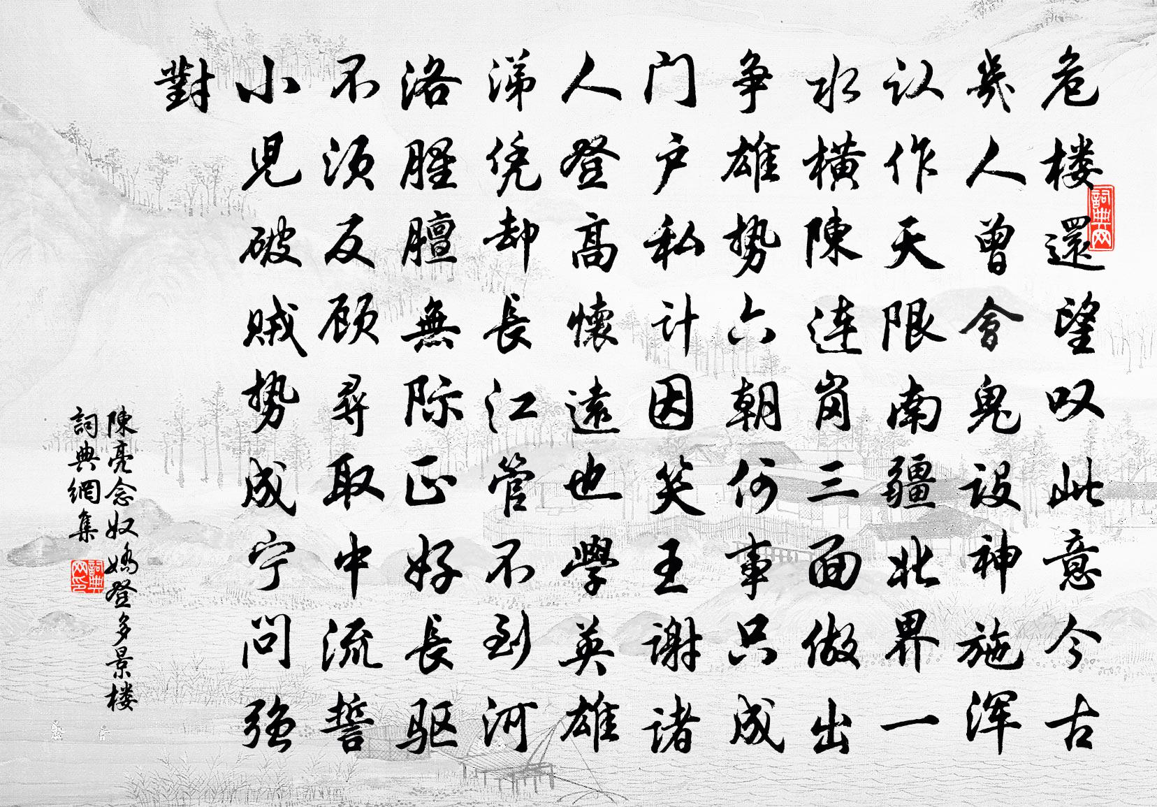 這是一首借古論今之作。多景樓,在鎮江北固山上甘露寺內,北臨長江。這首詞的寫作背景是孝宗淳熙十五年春天,陳亮到建康和鎮江考察形勢,準備向朝廷陳述北伐的策略。詞的內容以議論形勢、陳述政見為主,正是與此行目的息息相通的。