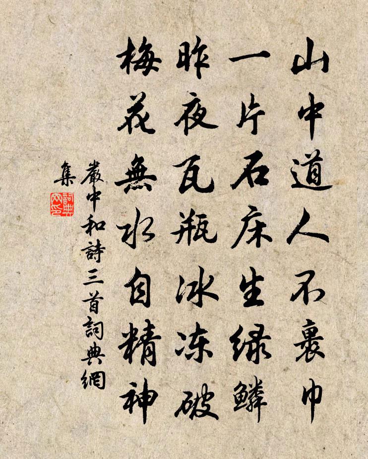 詩詞名句歷史字典書法欣賞書法字典國語詞典說文解字康熙字典古漢語字典標 題 作 者 詩 句 詩三首作者:嚴中和 朝代:宋代詩三首原文山中道人不裹巾,一片石床生綠鱗。昨夜瓦瓶冰凍破,梅花無水自精神。詩詞問答問:詩三首的作者是誰?答:嚴中和問:詩三首寫於哪個朝代?答:宋代嚴中和詩三首書法欣賞詩三首書法作品詩詞推薦西園劉得仁〔唐代〕夏圃秋涼入,樹低逢幘欹。水聲翻敗堰,山翠濕疏籬。綠滑莎藏徑,紅連果壓枝。幽人更何事,旦夕與僧期。次韻和劉夔判官對雪范仲淹〔宋代〕蔌蔌樓台外,新輝溢四遐。雲中凋玉葉,星際落榆花。岳色參差露,松聲彷佛加。風流裁賦苑,清苦讀書家。霜女送榷院侄之官陳宓〔宋代〕積善門逢八十春,慈兄蘊德復溫醇。舊恩未報乾坤大,新渥仍沾雨露勻。博洽始能為國計,清忠方不負廷紳。我今古風其四十六李白〔唐代〕一百四十年。國容何赫然。隱隱五鳳樓。峨峨橫三川。王侯象星月。賓客如雲煙。( 以上六句一作帝京信佳麗。赤甲杜甫〔唐代〕卜居赤甲遷居新,兩見巫山楚水春。炙背可以獻天子,美芹由來知野人。荊州鄭薛寄書近,蜀客郗岑非我鄰。笑接桃園憶故人 重陽全真集卷之三王哲〔元代〕琉璃枝上瓊花*。蓓蕾間成瑪瑙。烏玉葉兒偏好。四件誰能討。靜中認得真家寶。艷彩誠非草草。唯有個人知道。丁丑歲旦於石〔宋代〕不寫桃符換舊詩,辛盤竹爆付兒嬉。山深未見新年曆,只記梅花春早遲。三教陳藻〔宋代〕枉費工夫是學仙,聖門妙處與僧傳。百年合死千年贅,一物都無萬物全。挽張雅州李流謙〔宋代〕三年流落塞垣春,雪屋冰廬樂藻芹。司業頗知憐鄭老,薛宣能不吏朱雲。鶚牋重剡新如昨,蟻壤高眠喚不聞。一掬四時般若釋法泰〔宋代〕日暖風和天地春,野華方草一翻新。靈山佳致依然在,誰是當年微笑人。白溝河許及之〔宋代〕藝祖懷柔不耀兵,白溝如帶作長城。太平自是難忘戰,休恨中間太太平。北戶趙師秀〔宋代〕曉開北戶得新晴,木末猶橫一兩星。滿地綠苔看不見,細花如雪落冬青。水調歌頭(趙可大生日)王千秋〔宋代〕披錦泛江客,橫槊賦詩人。氣吞宇宙,當擁千騎靜胡塵。何事折腰執版,久在泛蓮幕府,深覺負平生。踉蹡眾人底送劉茂村主簿之官理定楊萬里〔宋代〕陸機二十作文賦,劉君二十詣大常。桃花浪險阿香怒,點破龍額歸西江。平津六十策第一,劉君五十賜袍笏。一官北平家傳成馬廷鸞〔宋代〕三百年間事屢危,降之人傑豈中衰。巍巍祖烈將千歲,赫赫元功彼一時。起義堂碑雲漢麗,凌煙閣像日星垂。藏山再次韻答節推司理陳造〔宋代〕人生行樂當及時,底用躭古仍癖詩。老子平日汗牛載,五窮追逐不得辭。羅幃圍香擊鼉鼓,食填巨壑酒如雨。君看羅浮山佚名〔唐代〕四百餘峰海上排,根連蓬島蔭天台。百靈若為移中土,蒿華都為一小堆。仲一以詩來用韻奉答陳傅良〔宋代〕陪侍經幃涉歲年,亦嘗尚論鞠衣賢。如今三嗅馨香泣,惟恐將詩去浪傳。山居雜詩九十首曹勛〔宋代〕栽竹勿傍牆,種蕉莫近砌。頃之根蔓延,寢乃壞階戹。持疏宛成趣,茂密相映蔽。操刀時遣獠,洗削去蓊翳。八月四日仁甫行韓淲〔宋代〕投老不堪別,莫雲師友情。當時建陽聚,何日上饒行。舊事消除盡,新愁積漸生。酒杯無浪與,醉醒是秋聲。名句推薦一月可曾閒幾日,百年難得閏中秋。慧霖《閏中秋玩月》 花門樓前見秋草,豈能貧賤相看老。岑參《涼州館中與諸判官夜集》 槐陰別院宜清晝,入座春風秀。美人圖子阿誰留。元好問《虞美人·槐陰別院宜清晝》 胡風吹代馬,北擁魯陽關。李白《豫章行》 小不忍,則亂大謀。孔子弟子《論語·衛靈公篇》 山高必有怪,嶺峻卻生精。吳承恩《西遊記·第二十七回》 子規啼,不如歸,道是春歸人未歸。關漢卿《大德歌·春》 相逢秋月滿,更值夜螢飛。王績《秋夜喜遇王處士》 青溪水,流得到紅橋。張景祁《小重山·幾點疏雅謄柳條》 明月樓高休獨倚。酒入愁腸,化作相思淚。范仲淹《蘇幕遮·懷舊》
