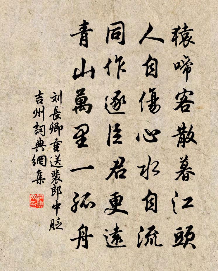 第二句“人自傷心水自流”,切合規定情景中的地點“江頭”,這就越發顯出上下兩句有水 * 融之妙。此時日暮客散,友人遠去,自己還留在江頭,更感到一種難堪的孤獨,只好獨自傷心了,而無情的流水卻只管載著離人不停地流去。兩個“自”字,使各不相干的“傷心”與“水流”聯繫到了一起,以無情水流反襯人之“傷心”,以自流之水極寫無可奈何的傷心之情。