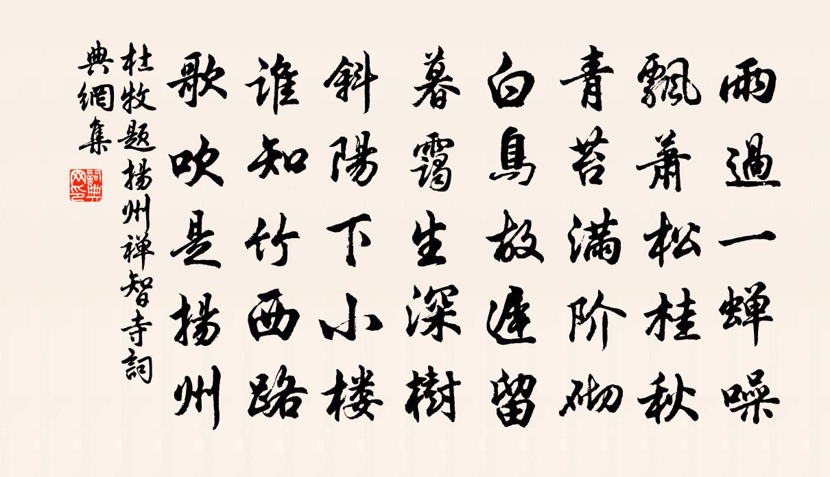 “雨過一蟬噪,飄蕭松桂秋。”從“蟬”和“秋”這兩個字來看,其時當為初秋,那時蟬噪本已嘶啞,“一蟬噪”,就更使人覺得音色的淒咽;在風中搖曳的松枝、桂樹也露出了蕭瑟秋意。詩人在表現這一耳聞目睹的景象時,用意遣詞都十分精細。“蟬噪”反襯出禪智寺的靜,靜中見鬧,鬧中見靜。秋雨秋風則烘托出禪智寺的冷寂。