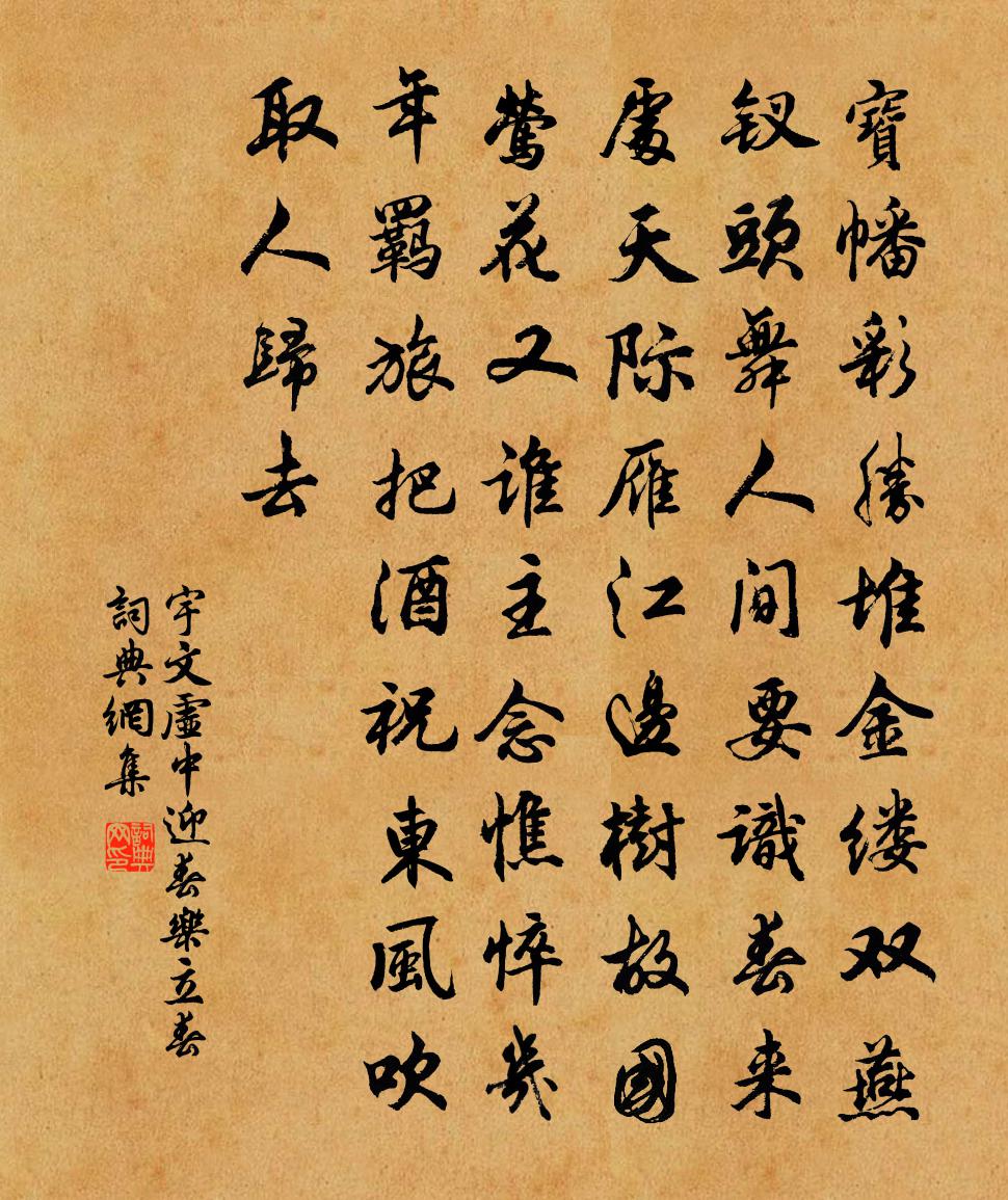 冬去春來,大自然的萬紫千紅是不管人世間的刀光劍影、血雨腥風,執著地要向南疆北國、千山萬水奮力進軍的,立春,是春天的華誕。若在和平時期,人們總要盡情慶祝一番,因為它孕育著一年的豐收和希望。中國唐宋以來,每逢立春日,民間以小紙幡戴在頭上或系在花下,慶祝春之來臨。宋孟元老《東京夢華錄》“立春”條載:“春日,宰扶親王百官皆賜金銀幡勝,入賀訖,戴歸私第”一時間寶幡彩勝,招搖過市,有金質的、金裹銀的、羅帛作的,委實是堆金堆縷,流光溢彩。無論是風雨飄搖中的北宋朝廷,還是偏安一隅的南宋當權者,都頗有一點及時行樂、不見棺材不掉淚的“涵養”。民間自當別論。老百姓含辛茹苦,總是熱切地祈求和平,祈求春光永駐。他們“春播雪柳,各相獻遺”(《東京夢華錄·立春》)的那情景,恰如辛棄疾所形容,“蛾兒黃金縷”(《青玉案》),十分樸素、融和。至於民間女子,更是別出心裁,“立春月,悉剪彩為燕以戴之”(《荊楚歲時記》),好一番“共喜釵頭燕已來”(歐陽修《春日帖子》)的動人情致。這一切,對於宇文虛中說來,俱成已往。立春,帶給也們的只是加倍為心靈苦寒和酸痛。遙望故園、故國,他們越發珍借昔日的春光春色,越發思念那金的、銀的、紙的、絹的交相錯雜、光彩迷離、共慶“春日載陽”的一片喧騰。美好的記憶的餘溫,溫暖著失群孤雁的冷得發顫的心。很自然,此詞開首便推出了熱熱鬧鬧的兩句:“寶幡彩勝堆金縷,雙燕釵頭舞。”