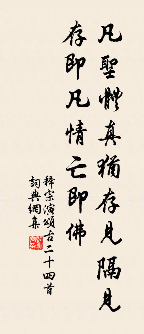 詩詞名句歷史字典書法欣賞書法字典國語詞典說文解字康熙字典古漢語字典標 題 作 者 詩 句 頌古二十四首作者:釋宗演 朝代:宋代頌古二十四首原文凡聖體真,猶存見隔。見存即凡,情亡即佛。詩詞問答問:頌古二十四首的作者是誰?答:釋宗演問:頌古二十四首寫於哪個朝代?答:宋代釋宗演頌古二十四首書法欣賞頌古二十四首書法作品詩詞推薦雪後書北台壁二首蘇軾〔宋代〕黃昏猶作雨纖纖,夜靜無風勢轉嚴。但覺衾裯如潑水,不知庭院已堆鹽。五更曉色來書幌,半夜寒聲落畫檐。試掃春日陳與義〔宋代〕憶看梅雪縞中庭,轉眼桃梢無數青。萬事一身雙鬢髮,竹床欹臥數窗欞。雜曲歌辭楊柳枝李商隱〔唐代〕暫憑樽酒送無憀,莫損愁眉與細腰。人世死前唯有別,春風爭擬惜長條。含煙惹霧每依依,萬緒千條拂落暉。為報臥病累日羸甚偶復小健戲作陸游〔宋代〕病忽迨旬日,衰如增十年。難求秦緩藥,空負宋清錢。微火秋先跨,閒房晝亦眠。偶賒書鬼錄,遇酒又陶然。京師逢賣梅花五首梅堯臣〔宋代〕憶在鄱君舊國傍,馬穿修竹忽聞香。偶將眼趁蝴蝶去,隔水深深幾樹芳。醉落魄/一斛珠黃庭堅〔宋代〕蒼顏華發。故山歸計無因得。舊交新貴音書絕。惟有家人,猶作殷勤別。離亭欲去歌聲咽。瀟瀟細雨涼生頰。淚珠雜曲歌辭。古別離王縉〔唐代〕下階欲離別,相對映蘭叢。含辭未及吐,淚落蘭叢中。高堂靜秋日,羅衣飄暮風。誰能待明月,回首見床空。和中丞晏尚書觀上御青城案警場宋庠〔宋代〕崔嵬繒闕倚雲梯,三疊鳴笳引夕鼙。使范雄嚴天意悅,瑞氛斜日紫垣西。和岷公送李評事往宜春齊己〔唐代〕兵火銷鄰境,龍沙有去人。江潭牽興遠,風物入題新。雪湛將殘臘,霞明向早春。郡侯開宴處,桃李照歌塵。思山居一十首春日獨坐思歸李德裕〔唐代〕壯齡心已盡,孤賞意猶存。豈望圖麟閣,惟思臥鹿門。無謀堪適野,何力可拘原。只有容身去,幽山自灌園。會老堂歐陽修〔宋代〕古來交道愧難終,此會今時豈易逢。出處三朝俱白首,凋零萬木見青松。公能不遠來千里,我病猶堪釂一鍾。已勝宋借南苑孫元晏〔唐代〕人主詞應不偶然,幾人曾說笑掀天。不知南苑今何在,借與張公三百年。霓裳中序第一·茉莉詠尹煥〔宋代〕青顰粲素靨。海國仙人偏耐熱。餐盡香風露屑。便萬里凌空,肯憑蓮葉。盈盈步月。悄似憐、輕去瑤闕。人何在,偈二十二首釋洵〔宋代〕髑髏捻碎眼睛寒,便把南辰對北看。無限風流慵賣弄,乘時推倒鐵圍山。聞虞參政至玉屏山晁公溯〔宋代〕宣室思賢久,鋒車促召還。去調金鉉鼎,來別玉屏山。拱木雨露下,豐碑天地閒。九原凜如在,想足慰慈顏。偈頌三十六首釋如珙〔宋代〕群陰欲去未去之際,一陽欲來未來之時。樓上鐘鳴,堂前鼓響,凡聖交參,一期事畢。某介直寡合為邑亡狀而杜兄一見過愛作詩稱許強至〔宋代〕平生懷古哲,所趣背時人。餓死不巧宦,力行惟庇民。風波方滿眼,霄漢欲謀身。山水得一縣,松筠為四鄰。分安次韻王適元日並示曹煥二首蘇轍〔宋代〕井底屠酥浸舊方,床頭冬釀壓瓊漿。舊來喜與門前客,終日同為酒後狂。老大心情今已盡,塵埃鬚髮亦無光。江南贈東鄰鄭少府錢起〔唐代〕一聞白雪唱,願見清揚久。誰謂結綬來,得陪趨府後。小邑藍溪上,卑棲愜所偶。忘言復連牆,片月亦攜手。草色句曹緯〔宋代〕孤芳高節共亭亭。名句推薦貧而無諂,富而無驕孔子弟子《論語·學而篇》 茅檐人靜,蓬窗燈暗,春晚連江風雨。陸游《鵲橋仙·夜聞杜鵑》 願將腰下劍,直為斬樓蘭。李白《塞下曲六首》 孤燈寒照雨,濕竹暗浮煙。司空曙《雲陽館與韓紳宿別》 壯心未與年俱老,死去猶能作鬼雄。陸游《書憤五首·其二》 信,國之寶也,民之所庇也左丘明《左傳·僖公·僖公二十五年》 知一切法無我。得成於忍。鳩摩羅什譯《金剛經·不受不貪》 至今不會天中事,應是嫦娥擲與人。皮日休《天竺寺八月十五日夜桂子》 千里澄江似練,翠峰如簇。王安石《桂枝香·登臨送目》 露從今夜白,月是故鄉明。杜甫《月夜憶舍弟》
