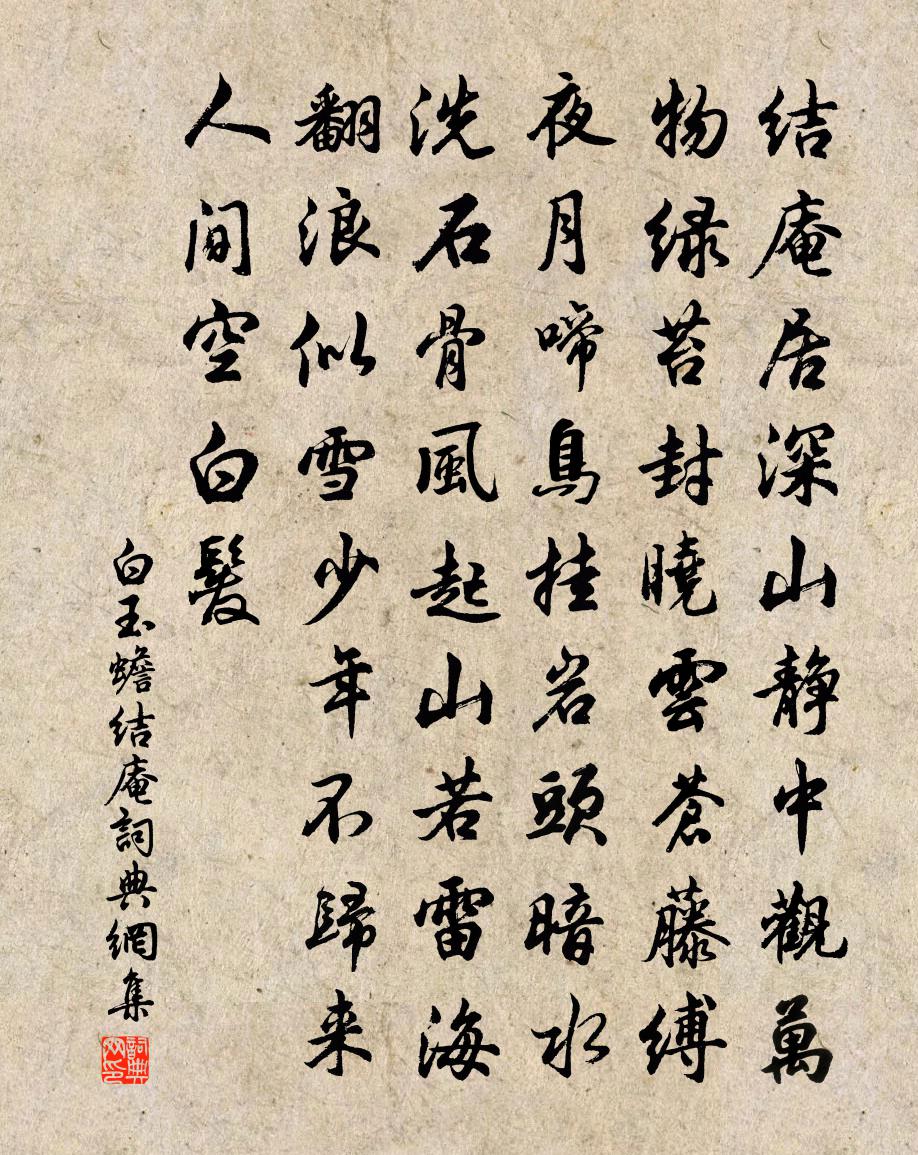 詩詞名句歷史字典書法欣賞書法字典國語詞典說文解字康熙字典古漢語字典標 題 作 者 詩 句 結庵作者:白玉蟾 朝代:宋代結庵原文結庵居深山,靜中觀萬物。綠苔封曉雲,蒼藤縛夜月。啼鳥掛岩頭,暗水洗石骨。風起山若雷,海翻浪似雪。少年不歸來,人間空白髮。詩詞問答問:結庵的作者是誰?答:白玉蟾問:結庵寫於哪個朝代?答:宋代問:結庵是什麼體裁?答:五古白玉蟾結庵書法欣賞結庵書法作品詩詞推薦絕境羅隱〔唐代〕絕境非身事,流年但物華。水梳苔發直,風引蕙心斜。凡客從題鳳,膚音未勝蛙。小船兼有槳,始與問漁家。次弟觀似單君范陳著〔宋代〕可人忽相訪,恰恰應鐙花。古話達時樣,霜毛感歲華。雨中書枕榻,山下菜羹家。一笑君聽取,歸期待白鴉。豐城道中鄧深〔宋代〕西風著衣袂,涼意曉來加。宿露眩光彩,朝陽濕精華。人煙互疏密,物色興嘆嗟。喧囂鴨子市,蕭索漁人家。皂裙借明秀軒韻送趙推入幕二首劉宰〔宋代〕七澤波濤筆下吞,相逢曉日上天門。祗今出處難同調,慚愧高軒幾訪存。復留侯從效問南漢劉岩改名龑字音義詹敦仁〔唐代〕伏羲初畫卦,蒼氏乃制字。點畫有偏旁,陰陽貴協比。古者不嫌名,周公始稱諱。始諱猶未酷,後習轉多忌。或援杏園徐夤〔唐代〕杏苑簫聲好醉鄉,春風嘉宴更無雙。憑誰為謔穆天子,莫把瑤池並曲江。用尊字韻寄胡約之汪晫〔宋代〕芙蓉經晚對高軒,何日論文共一尊。祗作古詩十九首,不消柱史五千言。一聲南雁霜華重,連夜西風不葉翻。自嘆是日大雨水漲方回〔宋代〕三橋北畔清湖水,雙塔西邊曉日樓。展轉愈知吾事拙,因循復作半年留。海風石首隨潮上,梅雨航船入市浮。時節梅花(二首)錢澄之〔清代〕何處花先放?向南三兩村。未春天似夢,徹夜月無言。且喜昏鴉散,毋嫌翠羽喧。眾芳久寂寞,賴汝照乾坤。離離觀拔河俗戲李隆基〔唐代〕壯徒恆賈勇,拔拒抵長河。欲練英雄志,須明勝負多。噪齊山岌嶪,氣作水騰波。預期年歲稔,先此樂時和。相和歌辭子夜春歌王翰〔唐代〕第二十一卷春氣滿林香,春遊不可忘。落花吹欲盡,垂柳折還長。桑女淮南曲,金鞍塞北裝。行行小垂手,日暮渭行香子劉志淵〔元代〕妄認苦蘊。汩礙胸中。逐緣生、分別匆匆。好將萬境,同攝心宮。泯迷蹤,知諸相,體皆空。照見空宗。有用真空謝岳大用提舉郎中寄茶果藥物三首紫團參楊萬里〔宋代〕新羅上黨各宗枝,有兩曾參果是非。入手截來花暈紫,聞香已覺玉池肥。舊傅飲子安心妙,新搗珠塵看雲飛。珍重和漁具十絕牟巘五〔宋代〕買得五瀉舟,江硝落我手。呼兒下笥去,此事渠能了。送辯光大師(師以草書應制)羅隱〔唐代〕禹祠分首戴灣逢,健筆尋知達九重。聖主賜衣憐絕藝,侍臣摛藻許高蹤。寧親久別街西寺,待詔初離海上峰。一種喜與楊六侍御同宿白居易〔唐代〕岸幘花靜言明月花夜,匡花閒臥花落花朝。二三月里饒春睡,七八年來不早朝。濁水清塵難會合,高鵬低鷃各逍遙失調名利登〔宋代〕花外潮回,劍邊虹去,撫寒江千里。句釋淨照〔宋代〕盤饌春多筍,廚薪涇帶苔。憶秦娥楊冠卿〔宋代〕雲垂幕。江天雪似楊花落。楊花落。翠衾不暖,曉寒偏覺。起來獨倚西樓角。客懷無耐傷離索。傷離索。蠻箋欲寄次韻承甫兄重陽項安世〔宋代〕露入楓林葉未黃,風將花信到南陽。一年好處詠九日,四海幾人雕寸腸。偶爾至今成故事,亦須隨分擊萸囊。陶生名句推薦兒童相見不相識,笑問客從何處來。賀知章《回鄉偶書二首·其一》 哀莫大於心死。莊子《莊子·外篇·田子方》 鶯初解語,最是一年春好處。蘇軾《減字木蘭花·鶯初解語》 念蘭堂紅燭,心長焰短,向人垂淚。晏殊《撼庭秋·別來音信千里》 秋花冒綠水,密葉羅青煙。李白《古風·其五十九》 佳人獨立相思苦。薄袖欺寒脩竹暮。劉鎮《玉樓春·東山探梅》 濃霧知秋晨氣潤,薄雲遮日午陰涼,不須飛蓋護戎裝。范成大《浣溪沙·江村道中》 順風而呼,聲非加疾也,而聞者彰。荀子《勸學》 竹外一枝斜,想佳人,天寒日暮。曹組《驀山溪·梅》 年年歲歲望中秋,歲歲年年霧雨愁。曾幾《癸未八月十四日至十六夜月色皆佳》