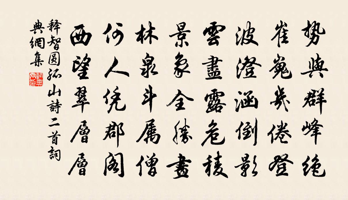 詩詞名句歷史字典書法欣賞書法字典國語詞典說文解字康熙字典古漢語字典標 題 作 者 詩 句 孤山詩二首作者:釋智圓 朝代:宋代孤山詩二首原文勢與群峰絕,崔嵬幾倦登。波澄涵倒影,雲盡露危稜。景象全勝畫,林泉斗屬僧。何人憑郡閣,西望翠層層。詩詞問答問:孤山詩二首的作者是誰?答:釋智圓問:孤山詩二首寫於哪個朝代?答:宋代釋智圓孤山詩二首書法欣賞孤山詩二首書法作品詩詞推薦早梅張謂〔唐代〕一樹寒梅白玉條,迥臨林村傍溪橋。不知近水花先發,疑是經春雪未銷。送盧虔端公守復州孟郊〔唐代〕師曠聽群木,自然識孤桐。正聲逢知音,願出大朴中。知音不韻俗,獨立占古風。忽掛觸邪冠,逮逐南飛鴻。肅肅懷玉山舊遊寄王彥博徐審知趙蕃〔宋代〕南山白塔高何許,弄日摩穹相與曾。放歌直下清溪去,落日半銜漁木燈。滿庭芳 贈濬州王三校尉譚處端〔元代〕蛾戀燈光,蜂貪花蜜,問君終久如何。欲成修煉,須出黑風波。慧劍攀緣割斷,離鄉土、趨卻娘哥。煙霞客,水去滿宮春許棐〔宋代〕懶摶香,慵弄粉。猶帶淺酲微困。金鞍何處掠新歡,偷倩燕尋鶯問。柳供愁,花獻恨。袞絮獵紅成陣。碧樓能有幾江城子尹志平〔元代〕法光普照道門昌。出天長。入龍陽。寶殿圓成,朝暮*心香。霞友雲朋休外覓,心地穩,是天堂。燕南河北好悲傷和南伯山行韻二首袁說友〔宋代〕日日登山復下山,崎嶇分寸絕難攀。已無魚腹江湖慮,肯怯羊腸道路彎。滿目詩材供各子,一杯醽醁染衰顏。四方判誤書紙背裴諝〔唐代〕這畔似那畔,那畔似這畔。我也不辭與你判,笑殺門前著靴漢。元信自當州遣朋尊以明徹冰壺名酒作二十八言鄭剛中〔宋代〕是翁明徹一塵無,養就江心秋月孤。自舊相從杯酒里,豈惟今日見冰壺。採蓮女李中〔唐代〕晚涼含笑上蘭舟,波底紅妝影欲浮。陌上少年休植足,荷香深處不回頭。始寒方回〔宋代〕與客觀棋日又晡,佯狂落魄老江湖。未妨行事諸兒笑,敢謂知心舉世無。幣竭並將空橐售,衾寒兼著破氈鋪。還家次韻傅茂元二絕劉子翬〔宋代〕酒興何如畢吏部,詩情已過鮑參軍。醉吟自足了一世,肯羨飄飄出岫雲。歲除自語二首錢時〔宋代〕盡道今年歲運惡,誰知最好是今年。夜光明月反散落,遺稿一朝成巨編。秋暑夜起追涼陸游〔宋代〕道士磯邊浪蹴天,郎官湖上月侵船。暮年自度無因到,且與沙鷗作後緣。宋嘉言雅善飛白一日書八字貺予因成長句謝之祖無擇〔宋代〕輕如浮霧重如雲,學到精微妙入神。奇蹟昔年傳堊帚,高名他日壓烏布。夸呈朋友防求副,留教兒孫恐失真。天子送丁子昭左司湖南運副李流謙〔宋代〕昔年九轉金精熒,鸞幢鵠節飛青冥。偶同雞犬舐殘粒,至今未脫塵中塵。平生不識紫芝面,邂逅天涯忻一見。安有祁門道中即事曹彥約〔宋代〕嶂疊巒層巧送青,一溪幽處小園亭。誰能換得王維手,洗我塵埃作畫屏。崑崙使者李賀〔唐代〕崑崙使者無訊息,茂陵煙樹生愁色。金盤玉露自淋漓,元氣茫茫收不得。麒麟背上石文裂,虬龍鱗下紅枝折。何處浣溪沙晏幾道〔宋代〕莫問逢春能幾回。能歌能笑是多才。露花猶有好枝開。綠鬢舊人皆老大,紅梁新燕又歸來。盡須珍重掌中杯。緣識宋太宗〔宋代〕識重隨緣喜,精心住處安。慈心常淡薄,人我定心難。名句推薦楊柳陰陰細雨晴,殘花落盡見流鶯。武元衡《春興》 不才明主棄,多病故人疏。孟浩然《歲暮歸南山 / 歸故園作 / 歸終南山》 有真性情,須有真涵養:有大識見,乃有大文章。王永彬《圍爐夜話·第一六二則》 徒把金戈挽落暉,南冠無奈北風吹。虞集《挽文丞相》 風蕭蕭而異響,雲漫漫而奇色。江淹《別賦》 常山臨代郡,亭障繞黃河。王褒《渡河北》 綠衣監使守宮門,一閉上陽多少春。白居易《上陽白髮人》 去年戰桑乾源,今年戰蔥河道。李白《戰城南》 威加海內兮歸故鄉,安得猛士兮守四方劉邦《大風歌》 東風漸綠西湖柳,雁已還、人未南歸。周密《高陽台·送陳君衡被召》