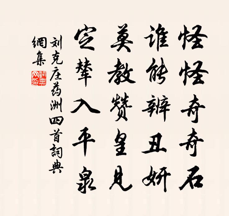 詩詞名句歷史字典書法欣賞書法字典國語詞典說文解字康熙字典古漢語字典標 題 作 者 詩 句 藥洲四首作者:劉克莊 朝代:宋代藥洲四首原文怪怪奇奇石,誰能辨醜妍。莫教贊皇見,定輦入平泉。詩詞問答問:藥洲四首的作者是誰?答:劉克莊問:藥洲四首寫於哪個朝代?答:宋代問:劉克莊的名句有哪些?答:劉克莊名句大全劉克莊藥洲四首書法欣賞藥洲四首書法作品詩詞推薦林處士輓詞葉適〔宋代〕尚平接馬弟,仿佛記前身。海闊元隨浪,山高別領春。難招古渡外,空老夕陽濱。順怕無生滅,君應了正因。洞仙歌(訪鄭德興郎中留飲)管鑒〔宋代〕悠然堂上,山色渾如畫。堂下梅花未多謝。向小亭、留客處,晴雪初飛,香四面,不比茅檐低亞。綠窗簾盡卷,吹和高簿送梅王志道〔宋代〕多君時送早春葩,不減孤山處士家。留取水窗和月看,夜深疏影正橫斜。春日茶山病不飲酒因呈賓客杜牧〔唐代〕笙歌登畫船,十日清明前。山秀白雲膩,溪光紅粉鮮。欲開未開花,半陰半晴天。誰知病太守,猶得作茶仙。偈頌二十一首釋智愚〔宋代〕一氣潛回,百昌萌動。君子道長兮露柱咨參,小人道消兮燈籠作舞。義出豐年,道復太古。國師歡喜問如何,冬至辰州陶弼〔宋代〕東海舊聲屋,南江新塞垣。璽書行絕域,銅柱入中原。草暖聞鳴鹿,江清對飲猿。何時一樽酒,重上謝公軒。到夔州曾慥〔宋代〕眾水歸三峽,悠悠萬古情。白鹽無路到,赤甲罕人行。西瀼泉尤勝,東屯谷有名。豐年公事少,飽暖荷恩榮。頌古釋慧空〔宋代〕杖林山下竹筋鞭,生長由來古佛先。一擊眼睛才定動,又隨煙雨過秦川。憑孟倉曹將書覓土婁舊庄杜甫〔唐代〕平居喪亂後,不到洛陽岑。為歷雲山問,無辭荊棘深。北風黃葉下,南浦白頭吟。十載江湖客,茫茫遲暮心。留錢塘十二年方回〔宋代〕一紀錢塘去未能,寒梅涼菊暑天冰。春風七寶山頭寺,夜雨三茅閣上燈。和靖不生無隱士,道潛如在可詩僧。大船江樓送太康郭主簿赴嶺南劉長卿〔唐代〕對酒憐君安可論,當官愛士如平原。料錢用盡卻為謗,食客空多誰報恩。萬里孤舟向南越,蒼梧雲中暮帆滅。樹色夢仙草堂圖唐寅〔明代〕閒來隱几枕書眠,夢入壺中別有天。仿佛希夷親面目,大還真訣得親傳。五郊樂章。肅和佚名〔唐代〕離位克明,火中宵見。峰雲暮起,景風晨扇。木槿初榮,含桃可薦。芬馥百品,鏗鏘三變。水淺舟滯解悶十絕鄭獬〔宋代〕稚子持竿坐芳草,魚兒跋尾出浮萍。會稽巨犗沈猶脫,滄海驪龍睡不醒。白紵山王安石〔宋代〕白紵眾山頂,江湖所縈帶。浮雲卷晴明,可見九州外。肩輿上寒空,置酒故人會。峰巒張錦繡,草木吹竽籟。登臨朝霞詩郭印〔宋代〕矯矯明天末,誰將絳帳供。陰雲收薄翳,晴日放先鋒。道路看行旅,田疇驗老農。乾坤今日意,群目散愁容。湖湘以竹車激水粳稻如雲書此能仁院壁張孝祥〔宋代〕象龍喚不應,竹龍起行雨。聯綿十車輻,伊軋百舟櫓。轉此 * ,救汝旱歲苦。橫江鎖巨石,濺瀑疊城鼓。神機矯志詩曹植〔魏晉〕仁虎匿爪。神龍隱鱗。沁園春(用前韻謝魏菊莊)馮取洽〔宋代〕舉世紛紛,風靡波流,名氛利埃。有幽人嘉遁,長年修潔,寒花作伴,竟日徘徊。餐薦夕英,杯迎朝露,世味何如寄郢州崔守八首陳造〔宋代〕嘗記停驂古郢州,待晴曾是賈胡留。錦囊亦有陽春句,不得親題白雪樓。名句推薦夫情動而言形,理髮而文見劉勰《文心雕龍·體性》 更可惜,雪中高樹,香篝熏素被。周邦彥《花犯·小石梅花》 燕子飛來窺畫棟,玉鉤垂下簾旌。歐陽修《臨江仙·柳外輕雷池上雨》 別日南鴻才北去,今朝北雁又南飛。魚玄機《閨怨》 疾風知勁草,板蕩識誠臣。李世民《賜蕭瑀》 採蓮時,小娘紅粉對寒浪。溫庭筠《荷葉杯·鏡水夜來秋月》 處顛者危,勢豐者虧。王充《論衡·卷一·累害篇》 敬他人,即是敬自己;靠自己,勝於靠他人。王永彬《圍爐夜話·第五七則》 罰慎其濫,惠戒其偏。罰濫則無以為罰,惠偏則不如無惠沈約《宋書·列傳·卷七十三》 西風酒旗市,細雨菊花天。歐陽修《秋懷》