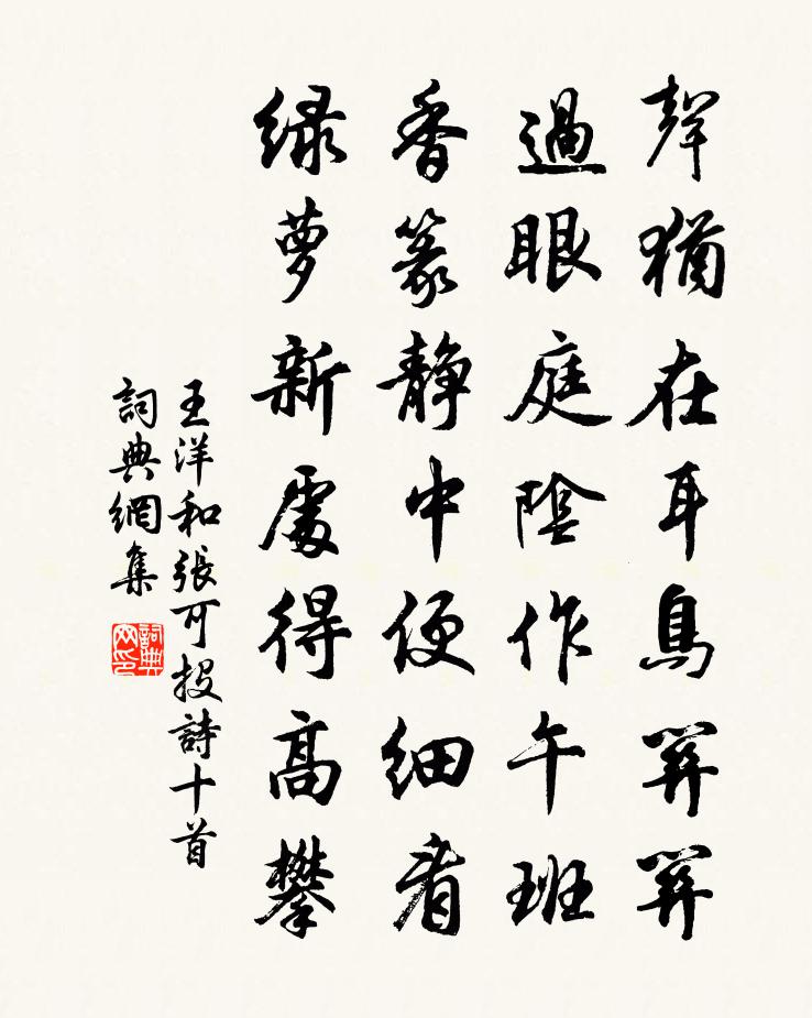 詩詞名句歷史字典書法欣賞書法字典國語詞典說文解字康熙字典古漢語字典標 題 作 者 詩 句 和張可投詩十首作者:王洋 朝代:宋代和張可投詩十首原文聲猶在耳鳥關關,過眼庭陰作午班。香篆靜中便細看,綠蘿新處得高攀。詩詞問答問:和張可投詩十首的作者是誰?答:王洋問:和張可投詩十首寫於哪個朝代?答:宋代王洋和張可投詩十首書法欣賞和張可投詩十首書法作品詩詞推薦題小室二首劉克莊〔宋代〕已向深林卓小庵,是中僅可著禪龕。士師何止三無慍,中散居然七不堪。一去重華那復得,方當盛漢勿多談。近來舟中詠落景余清暉輕橈弄溪渚之句蓋孟浩然耶陸游〔宋代〕古祠照滄波,老木閟雲洞。輕舟不搖楫,正用一風送。汲井漱甘液,掃榻寓幽夢。所恨山未深,城笳聽三弄。偈頌一百零四首釋紹曇〔宋代〕庾嶺春歸,溪格早知。雪破寒英,一點半點,月橫疏影,三枝兩枝。未放高樓吹笛,且聽茆舍吟詩。十分瀟灑,一高宗祀明堂前朝享太廟二十一首真宗〔宋代〕肅哉清宮,熉珠照幄。神之來思,八音振作。赤鳥龍章,奉玉惟恪。匪今斯今,先民時若。頌古五十七首釋道昌〔宋代〕無位真人,處處獻新。攔胸扭住,不落主賓。乾屎橛,乾屎橛,三人證龜作個鱉。為慧林沖禪師燒香頌三首黃庭堅〔宋代〕昨夜三更狗吠雪,東家閉門推出月。是渠覺海性澄圓,衲子 * 須見血。詠史上有虞氏陳普〔宋代〕天生瞽瞍非無意,帝隆娥皇更有心。萬點歷山煙雨淚,後花化作幾曾參。中都寄廣東提乾彭元忠四首曾豐〔宋代〕十期九度自參差,彼此無詞可遂非。投老江西沙石畔,鷗盟不請更相違。畫盆石菖蒲唐寅〔明代〕水養靈苗石養根,根苗都在小池盆。青青不老真仙草,別有陽春雨露恩。早起虛庭賦考盤,稻田新納十分寬。呼童次鄧州界韓愈〔唐代〕潮陽南去倍長沙,戀闕那堪又憶家。心訝愁來惟貯火,眼知別後自添花。商顏暮雪逢人少,鄧鄙春泥見驛賒。早晚無俗念凌雲翰〔元代〕等閒屈指,算今來古往,誰為英傑。耳目聰明天賦予,怎肯虛生虛滅。去燕來鴻,飛鳥走兔,世事何時歇。風波境楊素徐鈞〔宋代〕巧逢挾忌立功名,殺父猶從罪更深。已托沉浮輕大節,尚言富貴本無心。出遊歸臥得雜詩陸游〔宋代〕壯歲經春在醉鄉,老來數酌不禁當。正須獨倚 * 坐,領略明窗半篆香。興程縣尹熊禾〔宋代〕我思程伯子,試令晉城邑。豈第父母人,一念誠懇惻。存心民必濟,正己吏自格。雖然一邑小,允矣天下式。槃槃上廣東漕使黃郎中曾豐〔宋代〕維 * 泄,維陽之氣,維和之至。雨望方岳〔宋代〕前溪雨埋村,咫尺不我過。雷霆但濛鴻,林莽亦掀簸。竟微一飄灑,起此北窗臥。對面自胡越,孰為天宇大。得非余為成都帥司參議成將軍漢卿為成都路兵鈐相陸游〔宋代〕將軍鐵胸中備文鐵武,鐵馬黃鐵旗玉關路鐵。羌胡可滅心自知,富貴有命才可與。奪官置之三硤中,空山猿鳥同朝思越人/朝天子賀鑄〔宋代〕怊悵離亭斷采襟。碧雲明月兩關心。幾行書尾情何限,一尺裙腰瘦不禁。遙夜半,曲房深。有時昵語話如今。侵窗定惠院寓居月夜偶出蘇軾〔宋代〕幽人無事不出門,偶逐東風轉良夜。參差玉宇飛木末,繚繞香菸來月下。江雲有態清自媚,竹露無聲浩如瀉。已驚留守待制視學石介〔宋代〕盛府雍容外,輕裘博雅存。席間閒布帙,鈐下書無喧。首善隆儒術,諸生接討論。馬融南郡學,齪齪豈堪言。名句推薦賊是小人,智過君子。佚名《增廣賢文·上集》 萬里不惜死,一朝得成功。高適《塞下曲》 隨你官清似水,難逃吏滑如油。馮夢龍《警世通言·卷十五》 桂棹兮蘭枻,斵冰兮積雪;屈原《九歌》 更可惜,雪中高樹,香篝熏素被。周邦彥《花犯·小石梅花》 故鄉今夜思千里,霜鬢明朝又一年。高適《除夜作》 今日聽君歌一曲,暫憑杯酒長精神。劉禹錫《酬樂天揚州初逢席上見贈》 迴廊遠砌生秋草,夢魂千里青門道。馮延巳《菩薩蠻·迴廊遠砌生秋草》 行人日暮少,風雪亂山深。孔平仲《寄內·試說途中景》 親戚不附,無務外交。墨子《墨子·02章 修身》