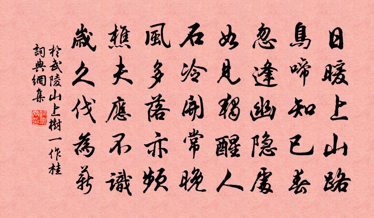 詩詞名句歷史字典書法欣賞書法字典國語詞典說文解字康熙字典古漢語字典標 題 作 者 詩 句 山上樹(一作桂)作者:於武陵 朝代:唐代山上樹(一作桂)原文日暖上山路,鳥啼知已春。忽逢幽隱處,如見獨醒人。石冷開常晚,風多落亦頻。樵夫應不識,歲久伐為薪。詩詞問答問:山上樹(一作桂)的作者是誰?答:於武陵問:山上樹(一作桂)寫於哪個朝代?答:唐代於武陵山上樹(一作桂)書法欣賞山上樹(一作桂)書法作品注釋天氣晴暖,風和日麗,“十月小陽春”嘛,我走在上山的小路上,耳邊不時有鳥兒婉轉的啼鳴傳來,好像在報告春天真的來臨了。忽然,花草蔥在蘢中,看到了桂樹的倩影,如同遇到了一位獨自清醒的世外高人。山中氣候寒冷,桂花常常開得很晚;山中風多而疾,桂花往往又落得早落得快。山中的樵夫可能又不認識桂樹,說不定什麼時候就會遭遇斧鉞之災,淪為燒火的枯柴。詩詞推薦正月九日雪霰後大雨范成大〔宋代〕黃昏檐溜垂瀑,清曉屐聲滿門。湖光萬頃何似?小沼先吹縠紋。徐趙紫芝葛天民〔宋代〕九月離東嘉,長安子歲華。未登楊子渡,先訪葛翁家。天作今朝雪,燈開昨夜花。一杯能強飲,不必問丹砂。卜運算元(蕭計議席上)李廷忠〔宋代〕草際雪痕消,梅上春心動。碧幕紅裙簇畫筵,橫玉聲三弄。雅興雜魚龍,妙舞回鸞鳳。莫道司空眼慣□,還入清宵上天池寺黃文雷〔宋代〕蟠際均衡岳,知峰獨出群。鯤鵬從水擊,翼軫驗天文。曠野風行雨,曾霄日貫雲。僧言興廢事,因念福王勛。鷓鴣天(燈夕雨雪)何澹〔宋代〕好景良辰造物慳。一年燈火遽摧殘。雨淋夾道星千點,雪阻遊人路九盤。停社舞,撤賓筵。謾燒銀燭照金蓮。不如孫威敏及物帖贊岳珂〔宋代〕有文事,有武備,公之筆札蔚然可占也。兵兇器,戰危事,公之此事非直一謙也。以公之才,持必勝之策,而於雇如夢令許有壬〔元代〕老子風神清灑。好句自然傳寫。立雪賦梅花,更折綠條成把。閒雅。閒雅。莫道吉人辭寡。安樂泉頌黃庭堅〔宋代〕姚子雪麴,杯色爭玉。得湯鬱郁,白雲生谷。清而不薄,厚而不濁。甘而不噦,辛而不螫。老夫手風,須此晨藥。句諶祜〔宋代〕地勢尊嚴今上國,天王明聖此中興。送駱征君陳潤〔唐代〕野人膺辟命,溪上掩柴扉。黃卷猶將去,青山豈更歸。馬留苔蘚跡,人脫薜蘿衣。他日相思處,天邊望少微。奉和添酒中六詠酒船皮日休〔唐代〕剡桂復刳蘭,陶陶任行樂。但知涵泳好,不計風濤惡。嘗行麴封內,稍系糟丘泊。東海如可傾,乘之就斟酌。頌古十首釋曇華〔宋代〕草木無端拈出來,更加註腳放痴呆。西在此土誰知己,夜半優曇火裹開。寄鶴林智福上人周弼〔宋代〕深山高頂寺,黃鶴舊曾留。鶴去無蹤跡,山僧幾白頭。鳥閒齋鼓靜,猿嘯佛燈幽。宿約何時踐,題詩向瀑流。隱居李新〔宋代〕伯鸞翠構元臨市,靖節幽居聞近朝。事過自余安水石,客忙何至走漁樵。價高少室仍休問,徑捷終南更易招。嶺上春日雜詩六首張耒〔宋代〕東風入我園,落落如急霰。感之復攜酒,撫樹為三嘆。離離牆間草,滿地不可踐。陰陽本無情,榮謝欲誰怨。鵲橋仙(甲子七夕)郭應祥〔宋代〕金風淅淅,銀河耿耿,七夕如今又至。人間喚作隔年期,但只似、屈伸指臂。羅花列果,拈針弄線,等是紛紛兒戲傳神悅躬上人陳舜俞〔宋代〕倦轡曾投林下宿,短篷重見越江邊。人歸河嶽儀型在,事隔桑溟特色傳。弟子共談庭際柏,公卿多識社中蓮。高風提刑彭仲節平叛卒戴復古〔宋代〕千兵喝賞黃金盡,六月臨戎 * 寒。慷慨丈夫為事別,太平人物濟時難。誰言江左無王謝,今喜軍中有范韓。漢節懷徐教趙汝鐩〔宋代〕憶昔相逢氣味投,興來無日不追游。靜尋鷗鷺同溪社,醉挈乾坤入釣舟。湖海匆匆三歲別,塵埃汩汩幾時休。一丘送妻入道李涉〔唐代〕人無回意似波瀾,琴有離聲為一彈。縱使空門再相見,還如秋月水中看。名句推薦紫菊宜新壽,丹萸辟舊邪。趙彥昭《奉和九日幸臨渭亭登高應制》 不知命,無以為君子也;不知禮,無以立也;不知言,無以知人也。孔子弟子《論語·堯曰篇》 關城榆葉早疏黃,日暮雲沙古戰場。王昌齡《從軍行七首》 烈士暮年,壯心不已。曹操《龜雖壽》 雉雊麥苗秀,蠶眠桑葉稀。王維《渭川田家》 春未老,風細柳斜斜。蘇軾《望江南·超然台作》 兵可千日而不用,不可 一日而不備。李大師、李延壽《南史·列傳·卷六十一》 花開又被風吹落,月皎那堪雲霧遮。施耐庵《水滸傳·第一百一十二回》 雲銷雨霽,彩徹區明。王勃《滕王閣序》 雨余溪水掠堤平,閒看村童謝晚晴。陸游《觀村童戲溪上》