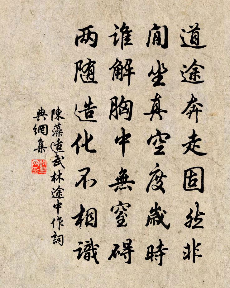 詩詞名句歷史字典書法欣賞書法字典國語詞典說文解字康熙字典古漢語字典標 題 作 者 詩 句 適武林途中作作者:陳藻 朝代:宋代適武林途中作原文道途奔走固然非,閒坐真空度歲時。誰解胸中無窒礙,兩隨造化不相識。詩詞問答問:適武林途中作的作者是誰?答:陳藻問:適武林途中作寫於哪個朝代?答:宋代陳藻適武林途中作書法欣賞適武林途中作書法作品詩詞推薦無題周邦彥〔宋代〕石瀨光洄洄,沙步平侹侹。楓林名一社,春汲共寒影。藩籬曲相通,窈窕花竹靜。茲焉自足樂,未覺丘園迥。令尹寄獻梓橦山侯侍御時常拾遺諫諍黃滔〔唐代〕漢宮行廟略,簪笏落民間。直道三湘水,高情四皓山。賜衣僧脫去,奏表主批還。地得松蘿塢,泉通雨雪灣。東門煨芋釋紹曇〔宋代〕糞火香凝午夢初,爛煨黃獨替春蔬。山童急把柴門掩,只恐閒雲引詔書。觀化十五首黃庭堅〔宋代〕柳似羅敷十五餘,宮腰舞罷不勝扶。年年折在行人手,為問春風管得無。天台三隱贊釋紹曇〔宋代〕門鉤弗解開扃,苕箒不能掃地。解說杜撰文書,背後有人切齒。石楠高似孫〔宋代〕自隨野意訂山行,香學楠花白水生。借得風來帆便飽,隔溪新度一聲鶯。春日有懷諸友楊時〔宋代〕憑几無聊晝掩扉,芬芬晴氣減春衣。隔簾相應鶯初語,背日連飛雁北歸。莫逆交遊千里別,遠來音信兩年稀。追尋酬喬世材推官李復〔宋代〕地僻人來少,公庭吏散時。亂蟬號晚日,涼葉下高枝。仰羨知歸鳥,先書寄遠詩。只應今夜月,偏解照相思。次韻和吳季野遊山寺登望文脊山梅堯臣〔宋代〕楚客好山水,五月上亭峰。峰頂望文脊,草樹皆有容。身既近猿鳥,心欲追喬松。石壁出雲背,苔磴千萬重。下視【雙調】折桂令 嚴客星鮮于必仁〔元代〕傲中興百二山河,拂袖歸來,稅駕岩阿。物外閒身,雲邊老樹,煙際滄波。犯帝座星明鳳閣,釣桐江月冷漁蓑。富採蓮入破/採蓮令史浩〔宋代〕璇穹層雲上覆,光景如梭逝。惟此過隙緩徵轡。垂象森列昭回。碧落卓然躔度,炳曜更騰輝。永永清光曄煒。綿四端午貼子詞皇太后閣六首周麟之〔宋代〕柳映金鋪麗,菰黏玉俎香。六宮隨鳳輦,來獻九霞觴。贈鄭國莊穆公主輓歌二首權德輿〔唐代〕追飾崇湯沐,遺芳藹禁闈。秋原森羽衛,夜壑掩容輝。睿藻悲難盡,公宮望不歸。笳簫向煙霧,疑是彩鸞飛。舊館更題杜甫〔唐代〕只應踏初雪,騎馬發荊州。直怕巫山雨,真傷白帝秋。群公蒼玉佩,天子翠雲裘。同舍晨趨侍,胡為淹此留。辱綿州於中丞書信李群玉〔唐代〕一緘垂露到雲林,中有孫陽念驥心。萬木自凋山不動,百川皆旱海長深。風標想見瑤台鶴,詩韻如聞淥水琴。他日別老母黃景仁〔清代〕搴帷拜母河梁去,白髮愁看淚眼枯。慘慘柴門風雪夜,此時有子不如無。同白侍郎杏園贈劉郎中張籍〔唐代〕一去瀟湘頭欲白,今朝始見杏花春。從來遷客應無數,重到花前有幾人。九章之九·悲迴風屈原〔先秦〕悲迴風之搖蕙兮,心冤結而內傷;物有微而隕性兮,聲有隱而先倡。夫何彭鹹之造思兮,暨志介而不忘;萬變其情寒節日寄鄉友齊己〔唐代〕歲歲逢寒食,寥寥古寺家。踏青思故里,垂白看楊花。原野稀疏雨,江天冷澹霞。滄浪與湘水,歸恨共無涯。紫薇翁歌於石〔宋代〕一掬之泉,可湘可沿。一拳之石,可潄可眠。其動也以天。萬壑之風,不琴而弦。兩山之雲,不爐而煙。其靜也以名句推薦求之有道,得之有命,是求無益於得也,求在外者也。孟子《孟子·盡心章句上·第三節》 足國之道:節用裕民,而善臧其餘。荀子《荀子·富國》 誰家秋院無風入?何處秋窗無雨聲?曹雪芹《代別離·秋窗風雨夕》 橫槊題詩,登樓作賦,萬事空中雪文天祥《酹江月·和友驛中言別》 子胥既棄吳江上,屈原終投湘水濱。李白《行路難三首》 垂下簾櫳。雙燕歸來細雨中。歐陽修《採桑子·群芳過後西湖好》 劃然長嘯,草木震動,山鳴谷應,風起水涌蘇軾《後赤壁賦》 寄書長不達,況乃未休兵。杜甫《月夜憶舍弟》 玉骨那愁瘴霧,冰姿自有仙風。蘇軾《西江月·梅花》 至若窮陰凝閉,凜冽海隅,積雪沒脛,堅冰在須。李華《弔古戰場文》