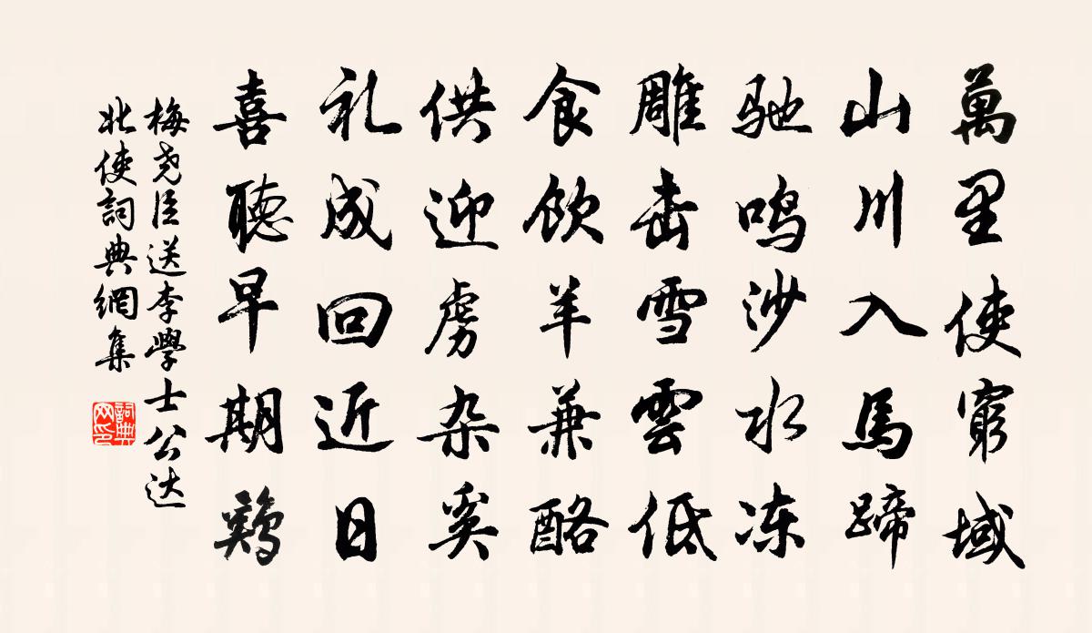 詩詞名句歷史字典書法欣賞書法字典國語詞典說文解字康熙字典古漢語字典標 題 作 者 詩 句 送李學士公達北使作者:梅堯臣 朝代:宋代送李學士公達北使原文萬里使窮域,山川入馬蹄。馳鳴沙水凍,雕擊雪雲低。食飲羊兼酪,供迎虜雜奚。禮成回近日,喜聽早期雞。詩詞問答問:送李學士公達北使的作者是誰?答:梅堯臣問:送李學士公達北使寫於哪個朝代?答:宋代問:梅堯臣的名句有哪些?答:梅堯臣名句大全梅堯臣送李學士公達北使書法欣賞送李學士公達北使書法作品詩詞推薦贈頭陀師劉商〔唐代〕少壯從戎馬上飛,雪山童子未緇衣。秋山年長頭陀處,說我軍前射虎歸。人送岩桂二首姜特立〔宋代〕香馥清晨可療飢,飽人勝食齋房芝。便好架巢枝上宿,不愁無酒呼愁詩。戌婦詞三首劉克莊〔宋代〕織錦為書寄雁飛,功名從古恨無機。良人白首沙場裡,何日封侯建節歸。入塞司馬光〔宋代〕萬騎入榆關,皋蘭苦戰還。摧鋒佩刀缺,蹋血馬蹄殷。鐃吹來風外,牛羊出霧間。須知沙塞惡,壯士變衰顏。仗錫山中釋文珦〔宋代〕雨地春山薇蕨長,曉隨樵子穿雲上。貪看岩頭瀑布飛,坐來忘卻青藜杖。贈池州張太守殷文圭〔唐代〕神珠無纇玉無瑕,七葉簪貂漢相家。陣面奔星破犀象,筆頭飛電躍龍蛇。絳幃夜坐窮三史,紅旆春行到九華。只怕對雨 其四王冕〔元代〕知少慮亦少,閒多病轉多。干戈愁正切,風雨恨如何?華屋迷青草,玄門暗綠蘿。淒涼無可奈,感慨動悲歌。挽求志居士王料院二首徐元傑〔宋代〕奕葉文宗盛,如公罕與俱。源流傳紫橐,題品重洪樞。淛左清名凜,江南政績殊。二難薌共薦,生死亦同塗。閔雨詩李覯〔宋代〕吳江之南,是曰豐國。五種之生天下食,一歲不登,吾民菜色。如何天不仁,縱彼旱孽稱其神。矯矯赤龍推火軒,偈頌一百四十一首釋師範〔宋代〕本色行腳人,須具行腳眼。千個與萬個,多是空檐版。挽呂東萊二首陳良佑〔宋代〕家學相傳久,天資自得高。讀書如夙習,授業更忘勞。史筆追遷左,詩編繼鄭毛。淵源有如此,沾丐及吾曹。兄子高赴廷對魏了翁〔宋代〕九十花九峰矗天花起,家在花前峰夕陽花里。蠻徭虎豹斷行人,小市寒城淨如水。驩傳有客闖然來,{左扌右監}仙都山劉參〔宋代〕古帝此登仙,霓旌不復還。孤標蒼嶺外,屹立紫煙間。上下形端柱,周回影轉環。根疑連海嶠,頂欲突天關。蓮出陸君置酒為予唱陽關即席有作強至〔宋代〕陽關何處草煙平,不識陽關空記名。古人驅車欲西過,吟成繕寫離群情。天涯此去故人絕,雖有樽酒同誰傾。古人浣溪沙晏殊〔宋代〕青杏園林著酒香。佳人初試薄羅裳。柳絲無力燕飛忙。乍雨乍晴花自落,閒愁閒悶日偏長。為誰消瘦減容光。謁客林之奇〔宋代〕入門投謁吏翩翩,我非欲見禮則然。異哉賓主兩無語,客起疾如走避燃。我已不恭愧昔賢,忍使泥塗朝衣冠。人生谷隱飲中以采菱渡頭風起策杖村西日斜為韻探李廌〔宋代〕東西南北人,志向各有在。一言契所適,糾纏胡可解。英英坐上客,聲聞著寰海。婆娑諸侯邦,未去亮天縡。顧余題致爽亭陳宓〔宋代〕山水圍中宅一區,小亭花柳足康娛。勾牽詩思千篇有,斗擻征塵一點無。秉燭風檐費遮邏,閉窗雲霧巧闚{外門內挽徐子固吳芾〔宋代〕相逢一笑記臨安,倒指今逾二十年。別後每思論舊事,朝來忽報啟新阡。蒞官凜凜風猶在,居里恂恂譽更傳。遙想夏晝章望之〔宋代〕一日常百刻,轉若車輪忙。千日十萬刻,百年能幾長。達人齊古今,一生甚微茫。夏日豈為永,而足以較量。人世名句推薦天生我材必有用,千金散盡還復來。李白《將進酒》 雲開遠見漢陽城,猶是孤帆一日程。盧綸《晚次鄂州》 千步虹橋,參差雁齒,直趨水殿。柳永《破陣樂·露花倒影》 行人與我玩幽境,北風切切吹衣冷。李頎《少室雪晴送王寧》 理無常是,事無常非。列子及其弟子《列子·說符》 曉霧將歇,猿鳥亂鳴;陶弘景《答謝中書書》 潤逼琴絲,寒侵枕障,蟲網吹黏簾竹。周邦彥《大酺·越調春雨》 投策命晨裝,暫與園田疏。陶淵明《始作鎮軍參軍經曲阿作》 清秋幕府井梧寒,獨宿江城蠟炬殘。杜甫《宿府》 至今窺牧馬,不敢過臨洮。西鄙人《哥舒歌》