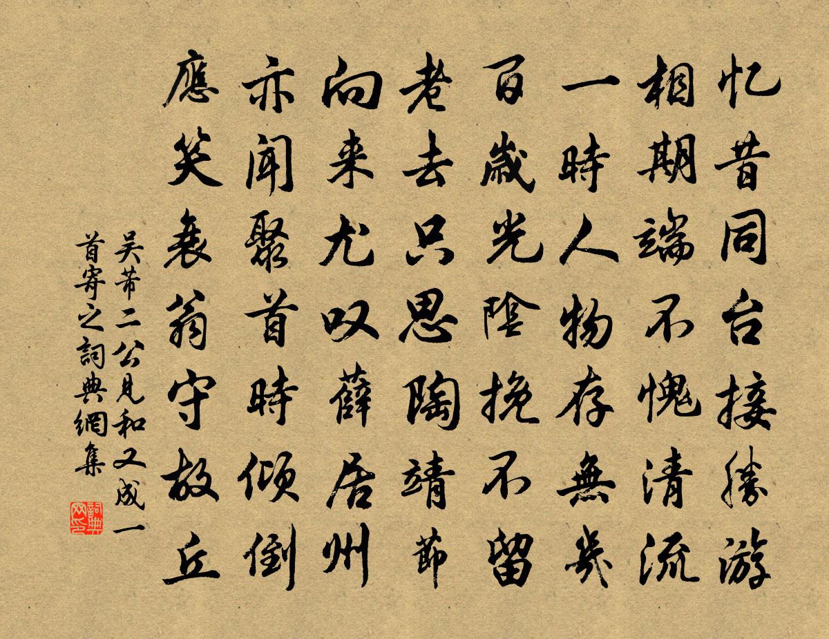詩詞名句歷史字典書法欣賞書法字典國語詞典說文解字康熙字典古漢語字典標 題 作 者 詩 句 二公見和又成一首寄之作者:吳芾 朝代:宋代二公見和又成一首寄之原文憶昔同台接勝游,相期端不愧清流。一時人物存無幾,百歲光陰挽不留。老去只思陶靖節,向來尤嘆薛居州。亦聞聚首時傾倒,應笑衰翁守故丘。詩詞問答問:二公見和又成一首寄之的作者是誰?答:吳芾問:二公見和又成一首寄之寫於哪個朝代?答:宋代吳芾二公見和又成一首寄之書法欣賞二公見和又成一首寄之書法作品詩詞推薦題滁州懷嵩樓王禹偁〔宋代〕昔是優賢地,今為省過州。非賢亦非過,醉臥懷嵩樓。米元章靈峰行記帖贊岳珂〔宋代〕永和之蘭亭,列序時人。文字之不磨,千載莫鄰。彼睎顏之徒雖未足倫,觀其所傳,亦庶幾仿佛乎清塵。浣溪沙·樓倚春江百尺高張先〔宋代〕樓倚春江百尺高。煙中還未見歸橈。幾時期信似江潮。花片片飛風弄蝶,柳陰陰下水平橋。日長才過又今宵。句趙訥軒〔宋代〕門外須臾風竹定,櫓聲搖曳出蘆花。白鳥一雙簾外去,蘆花風靜釣舟閒。八月二十九日雨霽玩古蘭方回〔宋代〕積雨不可出,五日無鹽醯。縱復有雨具,出門將告誰。茲辰復何辰,明窗漏晴曦。我有古猗蘭,瓦斛以蒔之。舉世和羅巨濟山居十詠楊萬里〔宋代〕且愛燈檠短,寧論劍鐵長。芝蘭照春紫,編簡著人香。賀鹽聊吳語,昌黎豈楚狂。豹文元炳蔚,未信霧能藏。綠鴨亭李廌〔宋代〕澄波奫淪鴨頭綠,秋水清於春水明。芰裳已逐秋光盡,藻帶暗藏春意生。偈二十二首釋洵〔宋代〕有佛處,不得住,藕絲孔里行官路。無佛處,急走過,十字街頭相對坐。日南長至小飲於雙清樓坐客九人皆一時名勝各王志道〔宋代〕一杯春酒對湖山,遠勝夷猶綠水間。覓句未工天欲暮,碧動飛滿舍前灣。次韻吉老十小詩黃庭堅〔宋代〕茵席絮剪繭,枕囊收決明。南風入晝夢,起坐是松聲。登城五首劉克莊〔宋代〕漫費人蒸土,常如物潰堤。傍疑為息壤,下恐有蟠泥。奔牛呂城過堰甚難方回〔宋代〕君不見奔牛呂城,南人北人千百舟。爭車奪纜塞堰道,但未 * 舂戈予。南人軍行欺百姓,北人官行氣尤盛。龍庭題胡立方思齋戴復古〔宋代〕每事再思過,參之以古今。唯求合天理,毋妄用吾心。和氣生琴室,清風動竹林。所居雖近市,不許市塵侵。憫農李流謙〔宋代〕秋苗掃地盡,春苗破土出。尚當積陳陳,那得有菜色。不知終年耕,未了一日食。守令民父母,賤士但挽嘿。題磐庵作玻璃窗釋寶曇〔宋代〕杜陵亦有天尺五,雲母不似玻璃深。西家鐘鼓謾勞汝,我自書卷中晴陰。送巢道士釋法薰〔宋代〕一點靈光觸處通,心空不見太虛空。五千言把為玄妙,濕紙如何裹大蟲。送酒與畢大夫黃庭堅〔宋代〕淺色官醅昨夜篘,一樽聊付卯時投。瓮邊吏部應歡喜,殊勝平原老督郵。送晁懷州學士韓維〔宋代〕儒館讎書舊,侯藩請節行。山川猶古氣,饒吹自春聲。問俗憐彫瘵,頒條賴簡平。從來寇河內,誰復繼聲名。老彭像舒岳祥〔宋代〕籛鏗自古壽稱延,上下堯殷九百年。自是周遮加謹畏,至今百忌歷猶傳。秘省避暑抵暮乃出曾幾〔宋代〕蝸廬何以度袢延,竟日蓬山一洗湔。陰翳樹林無六月,風涼殿閣是諸天。政須深隱似玄豹,不用懷歸如杜鵑。咄咄名句推薦淡淡梅花香欲染,絲絲柳帶露初乾。曹雪芹《香菱詠月·其二》 看來豈是尋常色,濃淡由他冰雪中。曹雪芹《詠紅梅花得“紅”字》 軍歌應唱大刀環,誓滅胡奴出玉關。徐錫麟《出塞》 人稟七情,應物斯感,感物吟志,莫非自然。劉勰《文心雕龍·明詩》 凡庸之性,後夫多寵前夫之孤,後妻必虐前妻之子。顏之推《顏氏家訓·後娶篇》 春田龜坼苗不滋,猶賴立春三日雪。王士禎《春不雨》 鼙鼓動時雷隱隱,獸頭凌處雪微微。盧肇《競渡詩 / 及第後江寧觀競渡寄袁州剌史成應元》 憶昨車聲寒易水,今朝,慷慨還過豫讓橋。陳維崧《南鄉子·邢州道上作》 垂柳覆金堤,蘼蕪葉復齊。薛道衡《昔昔鹽》 星點點,月團團。倒流河漢入杯盤。劉著《鷓鴣天·雪照山城玉指寒》