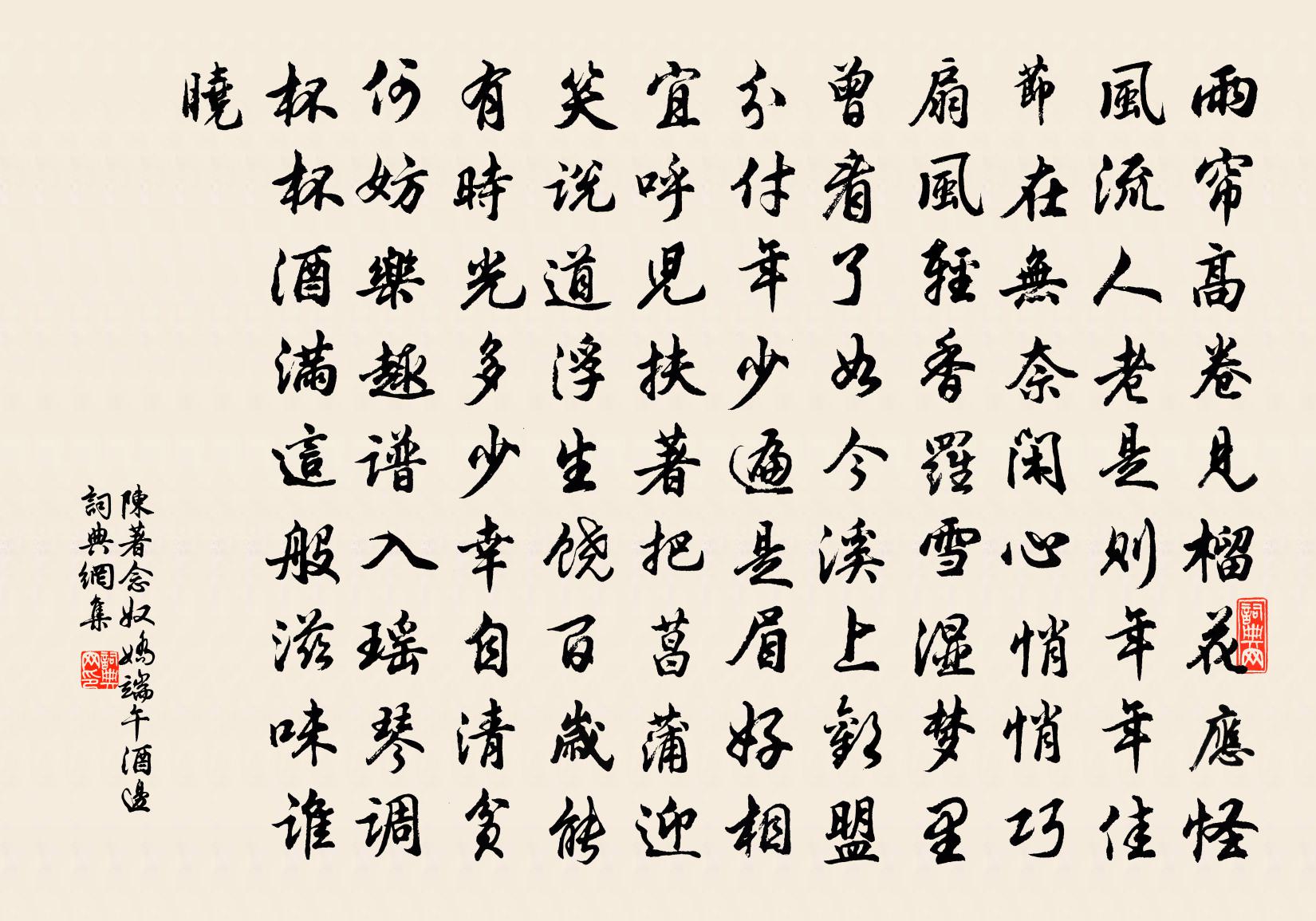 詩詞名句歷史字典書法欣賞書法字典國語詞典說文解字康熙字典古漢語字典標 題 作 者 詩 句 念奴嬌(端午酒邊)作者:陳著 朝代:宋代念奴嬌(端午酒邊)原文雨簾高卷,見榴花、應怪風流人老。是則年年佳節在,無奈閒心悄悄。巧扇風輕,香羅雪濕,夢裡曾看了。如今溪上,歡盟分付年少。遍是眉好相宜,呼兒扶著,把菖蒲迎笑。說道浮生饒百歲,能有時光多少。幸自清貧,何妨樂趣,譜入瑤琴調。杯杯酒滿,這般滋味誰曉。詩詞問答問:念奴嬌(端午酒邊)的作者是誰?答:陳著問:念奴嬌(端午酒邊)寫於哪個朝代?答:宋代陳著念奴嬌(端午酒邊)書法欣賞念奴嬌(端午酒邊)書法作品詩詞推薦梅市舟中作陸游〔宋代〕漕渠北向小橋通,漸入蒼茫大澤中。造物將無知我醉,故吹急雨打船篷。元夕八首陳世崇〔宋代〕看燈螃蟹月前供,迓鼓金銷畫領中。簾卷重樓燈乍試,柳稍風暖雪初融。金雞叫馬鈺〔元代〕入道已蒙相許了。火坑深、宜乎猛跳。男兒出語無虛矯。慎勿遲疑,休使傍人笑。斷制家緣回日早。休似鶴、留言重陽坐邑中旅舍陳著〔宋代〕禿鬢蕭蕭八十翁,為誰留滯客檐中。有詩不賦滿城雨,無酒可當吹帽風。與菊相逢還自笑,看萸欲健莫知窮。回頭贈別皇甫曾靈一〔唐代〕幽人從遠岳,過客愛春山。高駕能相送,孤游且未還。紫苔封井石,綠竹掩柴關。若到雲峰外,齊心去住間。雨中觀廬山岳珂〔宋代〕雨里觀山夐不同,何須九疊看屏風。紫觚壇上排蒼璧,青步障邊鋪翠茸。谷錦未回晴日照,衣綃聊借淡煙籠。只今和韓毅伯擬別王炎〔宋代〕踉蹡揖客客為誰,依舊驪珠色陸離。不謂遠遊來此地,未能小隱待何時。慣看覆手仍翻手,休問開眉與皺眉。歸去頌古三十一首釋安永〔宋代〕道泰時清才子貴,家肥國富小兒嬌。不因紫陌花開早,爭見黃鶯下柳條。子夜歌·始欲識郎時佚名〔南北朝〕始欲識郎時,兩心望如一。理絲入殘機,何悟不成匹。明日復雨涼,再用韻范成大〔宋代〕東山朝日澹冥濛,一片雲生萬疊中。宿雨未蘇焦卷盡,又煩箕井喚雷公。虞美人趙孟頫〔元代〕池塘處處生春草。芳思紛繚繞。醉中時作短歌行。無奈夕陽、偏旁小窗明。故園荒徑迷行跡。只有山仍碧。及今作送尹子潛赴省徐元傑〔宋代〕吾儕怪世好,心事老天知。夢寐符前說,軒翔定此時。故家當有後,造物本無私。雪裡陽春腳,梅開第一枝。蚊子皮日休〔唐代〕隱隱聚若雷,噆膚不知足。皇天若不平,微物教食肉。貧士無絳紗,忍苦臥茅屋。何事覓膏腴,腹無太倉粟。妙庭觀曾表勛〔宋代〕小溪一曲繞山綠,虎繞龍蟠記丹熟。空想雲軿佩玉鳴,夜深屋角風吹竹。送陳敬甫姜夔〔宋代〕十年所聞溢吾耳,去年誦君書一紙。古人三語得奇士,況此磊落數百字。相逢千財萬壑里,有客如君請兄事。才高蝶戀花晏殊〔宋代〕紫菊初生朱槿墜。月好風清,漸有中秋意。更漏乍長天似水。銀屏展盡遙山翠。繡幕卷波香引穗。急管繁弦,共慶送丹霞子阮芳顏上人歸山孟郊〔唐代〕松色不肯秋,玉性不可柔。登山須正路,飲水須直流。倩鶴附書信,索雲作衣裘。仙村莫道遠,枉策招交遊。晚晴李廌〔宋代〕微陽掛木杪,孤鳥下雲淀。廣墟遺稻粱,鸛鶴伴鳧雁。王沂公輓詞三首宋祁〔宋代〕盡瘁辭當國,均勞得偃藩。幄中留秘畫,天下滿危言。日企還三事,寧圖閟九原。誰將河海淚,一灑問乾坤。十月二十二夜同方寺丞宿瀑庵讀劉賓客集劉克莊〔宋代〕瀑山木落霜寒夜,共讀吾家夢得詩。坐對遺篇忘漏盡,手遮殘燭怕風吹。森嚴似聽元戎令,機警如看國手棋。千載名句推薦槐葉初勻日氣涼,蔥蔥鼠耳翠成雙。范成大《夏日田園雜興》 陽關萬里道,不見一人歸。庾信《重別周尚書》 月明星稀,烏鵲南飛。繞樹三匝,何枝可依?曹操《短歌行》 新秋逢閏,鵲橋重駕,兩度人間乞巧。顧太清《鵲橋仙·雲林矚題閏七夕聯吟圖》 草木也知愁,韶華竟白頭。曹雪芹《唐多令·柳絮》 多情卻似總無情,唯覺樽前笑不成。杜牧《贈別》 誰謂含愁獨不見,更教明月照流黃。沈佺期《古意呈補闕喬知之 / 古意 / 獨不見》 如今卻憶江南樂,當時年少春衫薄。韋莊《菩薩蠻·如今卻憶江南樂》 笑時猶帶嶺梅香。試問嶺南應不好。蘇軾《定風波·南海歸贈王定國侍人寓娘》 只恐夜深花睡去,故燒高燭照紅妝。蘇軾《海棠》