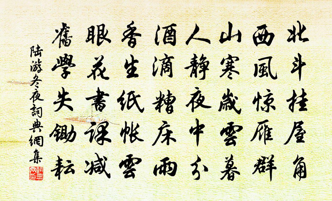 詩詞名句歷史字典書法欣賞書法字典國語詞典說文解字康熙字典古漢語字典標 題 作 者 詩 句 冬夜作者:陸游 朝代:宋代冬夜原文北斗掛屋角,西風驚雁群。山寒歲雲暮,人靜夜中分。酒滴糟床雨,香生紙帳雲。眼花書課減,舊學失鋤耘。詩詞問答問:冬夜的作者是誰?答:陸游問:冬夜寫於哪個朝代?答:宋代問:陸游的名句有哪些?答:陸游名句大全陸游冬夜書法欣賞冬夜書法作品詩詞推薦秋日歸舊山許棠〔唐代〕山雲蟬滿樹,欲住更何安。上國回將晚,孤峰別自難。磧遙鴻未到,江近夜先寒。泉石雖堪戀,行人不願看。毗陵邂逅京口同舍湯叔厚劉宰〔宋代〕雞犬相聞里社同,琴書曾共客儒宮。南樓夜醉三更月,北固秋吟萬里風。去魯羨君勤采藻,游吳愧我尚飄蓬。相逢治安疏海瑞〔明代〕戶部雲南清吏司主事臣海瑞謹奏;為直言天下第一事,以正君道、明臣職,求萬世治安事: 君者,天下臣民萬梁國惠康公主輓歌詞二首(駙馬即司空於公之子)羊士諤〔唐代〕湯沐成陳跡,山林遂寂寥。鵲飛應織素,鳳起獨 * 。玉殿中參罷,雲輧上漢遙。皇情非不極,空輟未央朝。授冊題馬世功豁野堂左璵〔宋代〕歡言赴幽期,作意理煙艇。曳纜松篁陰,未覺心地迥。舍舟登爽塏,微步水雲淨。扶輿登斯堂,遐眺方一騁。開軒題泰山仁安殿壁王奕〔宋代〕大極何年庭帝孫,中居岱嶽鎮乾坤。三年余載昭明代,七十二君來至尊。魯甸齊邱雄地勢,秦松漢柏護天門。兵塵雀李嶠〔唐代〕大廈初成日,嘉賓集杏梁。銜書表周瑞,入幕應王祥。暮宿江城裡,朝游漣水傍。願齊鴻鵠至,希逐鳳凰翔。浣溪沙李昴英〔宋代〕筍玉纖纖拍扇紈。戲拈荷葉起文鴛。水亭初試小龍團。拜月深深頻祝願,花枝低壓髻雲偏。倩人解夢語喧喧。古鄴城童子謠,效王粲刺曹操李賀〔唐代〕鄴城中,暮塵起。將黑丸,斫文吏。棘為鞭,虎為馬。團團走,鄴城下。切玉劍,射日弓。獻何人,奉相公。扶轂望太湖周弼〔宋代〕獨立瀰漫灝氣中,倍饒雲霧杳重重。直西一道孤光起,指點人看是白龍。呂守之暮到三首錢時〔宋代〕此山風月久塵埃,拂試重新桂卻開。正要好詩相料理,昏鴉忽報守之來。吳守祈雨有應胡寅〔宋代〕延陵宿望冠三吳,又見熙朝老大夫。善政舊聞風偃草,清規今信浦還珠。山川每應精神禱,禾稼全憑潤澤蘇。可但息壤蘇轍〔宋代〕江上寒沙薄如席,一夕墳起成高丘。江流傾轉力不勝,左齧右吐非自由。南郡城南獨何者,平地生長殊不休。當中壽傅守釋若芬〔宋代〕教令浮民一歲期,只將平易抗澆漓。朝廷若用循良課,換取樵川老吏歸。丙除夜泊舟東湖用白石歸苕溪韻書懷徐端〔宋代〕封侯歲見夢魂銷,千萬徒勞重壓腰。只待區中緣了盡,攜家採藥住中條。鎮下放船過東山二首范成大〔宋代〕老禪竿木各逢場,詩客端來共葦航。一任顛風聒高浪,滿船歡笑和詩忙。端明無惰趙公哀詩二首劉克莊〔宋代〕惜身顧影世滔滔,嘆息斯人振古豪。中壘老猶獻封事,三閭去尚作離騷。無金可遺貧如故,加璧難招節更高。有淚霜天曉角(清高堂看山)曹冠〔宋代〕小雨濛濛。輕煙舞曳風。林椒高低疏密,依淺瀨、媚遙峰。浴鷺水溶溶。晴霞映晚紅。擬向玉堂舉似,摹寫入、畫松月冷颼颼拾得〔唐代〕松月冷颼颼,片片雲霞起。匼匝[1]幾重山,縱目千萬里。溪潭水澄澄,徹底鏡相似。可貴靈台物,七寶[2]段縣尉以兄約齋二詩求和因次韻陳著〔宋代〕兄弟誰無仕宦情,約齋好處最分明。自緣友□勤相遜,可是詩懷要獨清。道義終身為日用,功名外物等雲輕。閉門名句推薦新葉初冉冉,初蕊新霏霏。謝朓《詠落梅》 野竹分青靄,飛泉掛碧峰。李白《訪戴天山道士不遇》 東風動百物,草木盡欲言。李白《長歌行》 奉勸世間夫婦,固不可彼此相仇,亦不可過於情篤。沈復《浮生六記·坎坷記愁》 夫大寒至,霜雪降,然後知松柏之茂也。劉安及其門客《淮南子·俶真訓》 白酒新熟山中歸,黃雞啄黍秋正肥。李白《南陵別兒童入京》 聖人不期修古,不法常可,論世之事,因為之備。韓非及後人《韓非子·五蠹》 獨上小摟春欲暮,愁望玉關芳草路。韋莊《木蘭花·獨上小樓春欲暮》 最是繁絲搖落後,轉教人憶春山。納蘭性德《臨江仙·寒柳》 不辭山路遠,踏雪也相過。張九齡《答陸澧》