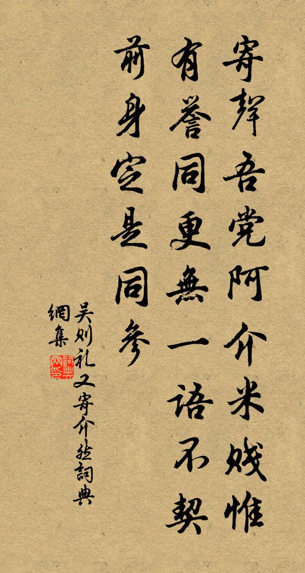 詩詞名句歷史字典書法欣賞書法字典國語詞典說文解字康熙字典古漢語字典標 題 作 者 詩 句 又寄介然作者:吳則禮 朝代:宋代又寄介然原文寄聲吾黨阿介,米賤惟有譽同。更無一語不契,前身定是同參。詩詞問答問:又寄介然的作者是誰?答:吳則禮問:又寄介然寫於哪個朝代?答:宋代吳則禮又寄介然書法欣賞又寄介然書法作品詩詞推薦晝睡舒岳祥〔宋代〕生平慕睡鄉,逃暑最為良。渴愛煎茶響,飢聞煮粥香。百年依白社,一枕熟黃粱。童懶呼難動,貪眠到夕陽。隆慶徐守作堂名蜀固一夕夢與余賦詩堂上有何洪咨夔〔宋代〕蜀踞國上流,蜀固天下固。欲為天下謀,護蜀風寒處。極邊植藩籬,黃牛白環戍。中間屹垣墉,武休河池路。近裹唐享昊天樂第四武則天〔唐代〕巍巍睿業廣,赫赫聖基隆。菲德承先顧,禎符萃眇躬。銘開武岩側,圖薦洛川中。微誠詎幽感,景命忽昭融。有懷泊舟溪口葉茵〔宋代〕萬柳陰中系客船,桑條如竹葉如錢。大姑小婦挑甘薺,搖手烏兒正二眠。行露佚名〔先秦〕厭浥行露,豈不夙夜,謂行多露。誰謂雀無角?何以穿我屋?誰謂女無家?何以速我獄?雖速我獄,室家不足!誰元宵飲陶總戎家二首趙時春〔明代〕將壇醇酒冰漿細,元夜邀賓燈火新。直待清霄寒吐月,休教白髮老侵人。香翻桂影燭光薄,紅沁榆階寶靨勻。群品桃源行姚勉〔宋代〕武陵溪邊翁好漁,笭箵釣車日采魚。扁舟為家葦為屋,豈知世有神仙居。曉來不記舟行路,忽在桃花深絕處。紅雲人日侍宴大明宮恩賜彩縷人勝應制李嶠〔唐代〕鳳城景色已含韶,人日風光倍覺饒。桂吐半輪迎此夜,蓂開七葉應今朝。魚猜水凍行猶澀,鶯喜春熙弄欲嬌。愧奉偈頌一百零二首釋紹曇〔宋代〕腳跨馬師門,便有彌天過。喝得耳朵聾,扭得鼻頭破。縱大雄毛虎略露爪牙,脫百丈野狐不昧因果。說條念貫,監古意二首崔國輔〔唐代〕玉籠薰繡裳,著罷眠洞房。不能春風裡,吹卻蘭麝香。種棘遮蘼蕪,畏人來采殺。比至狂夫還,看看幾花發。送謝著作歸陳州梅堯臣〔宋代〕騏驥泥中行,偶蹶未千里。終當至高衢,尚苦泥行恥。今歸雨濛濛,嘶鳴欲何止。乃念彼名駒,近在清川涘。他日贈張將軍(一作開府)耿湋〔唐代〕寥落軍城暮,重門返照間。鼓鼙經雨暗,士馬過秋閒。慣守臨邊郡,曾營近海山。關西舊業在,夜夜夢中還。游山吟金朋說〔宋代〕躡屐山行日看花,春前桃李屬誰家。千紅萬紫爭妍媚,不似青松耐歲華。感寓三首戴復古〔宋代〕古今通一理,趨鄉自多門。賢士玉成美,貪夫金注昏。誰知身是患,人以道為尊。前輩□□死,姓名千載存。和方宗教鼓山韻陳宓〔宋代〕蓋世功名不染埃,清時嘗見賦康哉。靈源已作千年觀,聖相仍曾一日來。補練元功天上石,燮調和氣琯中灰。崖間醉落魄/一斛珠高觀國〔宋代〕鉤簾翠濕。寒江上、雨晴風急。亂峰低處明殘日。雁字成行,寫破暮天碧。故人天外長為客。倚闌一望情何極。新玉司山蕭逵〔宋代〕涪翁筆下千鈞重,趙尹胸中萬里寬。寶墨幾年藏瑞氣,新亭今日敞奇觀。翠屏遠帶斜陽淡,素練光涵夜月寒。苔碧題清足堂許月卿〔宋代〕秀翁今又以光名,窗外琅玕不欠清。十八公松曾入夢,兩三竿竹豈無情。紅塵不近春風瑟,翠色能添夜雪燈。我欲下第出關投鄭拾遺杜荀鶴〔唐代〕丹霄桂有枝,未折未為遲。況是孤寒士,兼行苦澀詩。杏園人醉日,關路獨歸時。更卜深知意,將來擬薦誰?途中再詠金陵汪莘〔宋代〕石頭城上望斜暉,覽盡金陵寂寞歸。嘆息青天如許大,可無一個鳳凰飛。名句推薦堂上謀臣尊俎,邊頭將士干戈辛棄疾《西江月其六》 遠雁下平沙,嘹亮遺淒唳。劉道著《湘江秋曉》 寄言儔侶,莫負廣寒沈醉。文徵明《念奴嬌·中秋對月》 行多有病住無糧,萬里還鄉未到鄉。盧綸《逢病軍人》 吾所以有大患者,為吾有身,及吾無身,吾有何患?老子《老子·道經·第十三章》 戛戛秋蟬響似箏,聽蟬閒傍柳邊行。徐璣《秋行》 孤芳一世,供斷有情愁,消瘦損,東陽也,試問花知否曹組《驀山溪·梅》 永夜角聲悲自語,客心愁破正思家。汪元量《望江南·幽州九日》 酒賤常愁客少,月明多被雲妨。蘇軾《西江月·世事一場大夢》 一物失稱,亂之端也。夫德不稱位,能不稱官,賞不當功,罰不當罪,不祥莫大焉。荀子《荀子·正論》