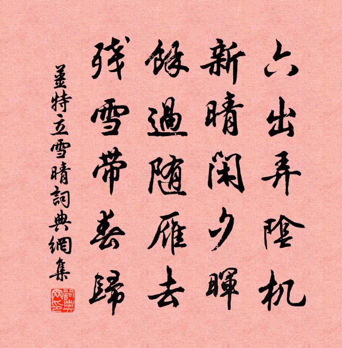 詩詞名句歷史字典書法欣賞書法字典國語詞典說文解字康熙字典古漢語字典標 題 作 者 詩 句 雪晴作者:姜特立 朝代:宋代雪晴原文六出弄陰機,新晴閒夕暉。余過隨雁去,殘雪帶春歸。詩詞問答問:雪晴的作者是誰?答:姜特立問:雪晴寫於哪個朝代?答:宋代姜特立雪晴書法欣賞雪晴書法作品詩詞推薦依韻和任司封見寄吟邵雍〔宋代〕辭麾來此住雲霄,聞健登臨肯憚勞。紫陌事多都不見,家山圍繞是嵩高。趙尉送菜方岳〔宋代〕豈可常貧料此翁,齋盂頓有玉瓏忪。春山藥草能同飯,夜雨茅堂未缺供。杞菊共傳寒綠賦,柴桑不隔紫霄峰。冰甆昭君怨王從叔〔宋代〕門外春風幾度。馬上行人何處。休更卷朱簾。草連天。立盡海棠花月。飛到荼香雪。莫怪夢難成。夢無憑。中元日觀法事盧拱〔唐代〕西孟逢秋序,三元得氣中。雲迎碧落步,章奏玉皇宮。壇滴槐花露,香飄柏子風。羽衣凌縹緲,瑤轂轉虛空。久慕薌岩山居孟夏二十絕舒岳祥〔宋代〕鐘聲澄萬室,月影散千林。岑寂岩棲客,應觀不轉心。和穎上人南徐十詠其六季子廟梅堯臣〔宋代〕信如季子賢,自昔知能幾。依約有荒祠,寂寥無奠篚。壞梁生濕菌,古木憑山鬼。英靈豈顧茲,青史辭亹亹。贈畫梅王文顯陸九淵〔宋代〕子作寒梢已逼真,不須向上更稱神。由來絕藝知音少,只恐今人過古人。柳枝辭十二首徐鉉〔唐代〕水閣春來乍減寒,曉妝初罷倚欄乾。長條亂拂春波動,不許佳人照影看。次子瞻夜字韻作中秋對月二篇一以贈王郎二以蘇轍〔宋代〕平明坐曹黃昏歸,終歲得閒惟有夜。已邀明月出牆東,更遣清風掃庭下。城上青鬟四山合,門前白練長江瀉。誰家送范憲東叔帥潼川四首陳傅良〔宋代〕逢人九頓首,遇事三折肱。雖知少為狂,正復老可憎。吾今有儲粟,吾昔有短檠。魯論訓何如,周易讀未曾。言歸器吳范二姊程珌〔宋代〕逝者如期乎,翩翩北飛鴻。鴻北來歲南,人去亡南蹤。庚寅仲姊去,庚辰伯姊空。千里不一見,血淚迸秋風。自餘見雪明日與祝山人游東湖僧寺訪陳巨中教授留毛滂〔宋代〕風吹飛雨乾,散作柳花毬。危檐下舞鵠,老樹騰蟠虬。煙空夜色垂。膚雨凝酥柔。曉屨踏晶瑩,與君散清愁。湖東新燕齊己〔唐代〕燕燕知何事,年年應候來。卻緣華屋在,長得好時催。花外銜泥去,空中接食回。不同黃雀意,迷逐網羅媒。夜雨張祜〔唐代〕靄靄雲四黑,秋林響空堂。始從寒瓦中,淅瀝斷人腸。愁腸方九回,寂寂夜未央。和所盤九日丘葵〔宋代〕石鋩如劍夢猶危,風帽橋邊且任吹。山送落暉應恨速,月臨歸路不妨遲,欲從此夕頹如醉,試問明年健者誰。一笑子別母呈所翁陳先生蒲壽宬〔宋代〕子別母,欲別牽衣意何苦。母有眾兒俱母憐,兒無別母兒誰乳。海惡寧匪蛟,山饕莫如虎。小大不相棄,高深自為次壁間韻題懷巡道上三州三氏亭六言二首魏了翁〔宋代〕老農不留地力,萬物取具天公。曲曲拗拗夏隴,枝枝葉葉春風。隆興書堂自警三十五首陳淳〔宋代〕居獨念無僻,境動情不肆。聖人然後能,學者須敬忌。潮水二首張耒〔宋代〕水滿清淮自在流,落花吹盡浪悠悠。總將春雨為春淚,未比思君一半愁。瑤池月(煙波行)黃裳〔宋代〕扁舟寓興,江湖上、無人知道名姓。忘機對景,咫尺群鷗相認。煙雨急、一片篷聲碎,醉眼看山還醒。晴雲斷,狂名句推薦歷冰霜、不變好風姿,溫如玉。陸容《滿江紅·詠竹》 得歡當作樂,斗酒聚比鄰。陶淵明《雜詩·人生無根蒂》 誰憐一片影,相失萬重雲?杜甫《孤雁 / 後飛雁》 至鷺鷥林,則雪深泥滑,不得前矣。辛棄疾《賀新郎·把酒長亭說》 聽君一席話,勝讀十年書。佚名《增廣賢文·上集》 新竹高於舊竹枝,全憑老乾為扶持。鄭燮《新竹》 若非群玉山頭見,會向瑤台月下逢李白《清平調·其一》 望君煙水闊,揮手淚沾巾。劉長卿《餞別王十一南遊》 夜來疏雨鳴金井,一葉舞空紅淺。王月山《齊天樂·夜來疏雨鳴金井》 老翁逾牆走,老婦出門看。杜甫《石壕吏》