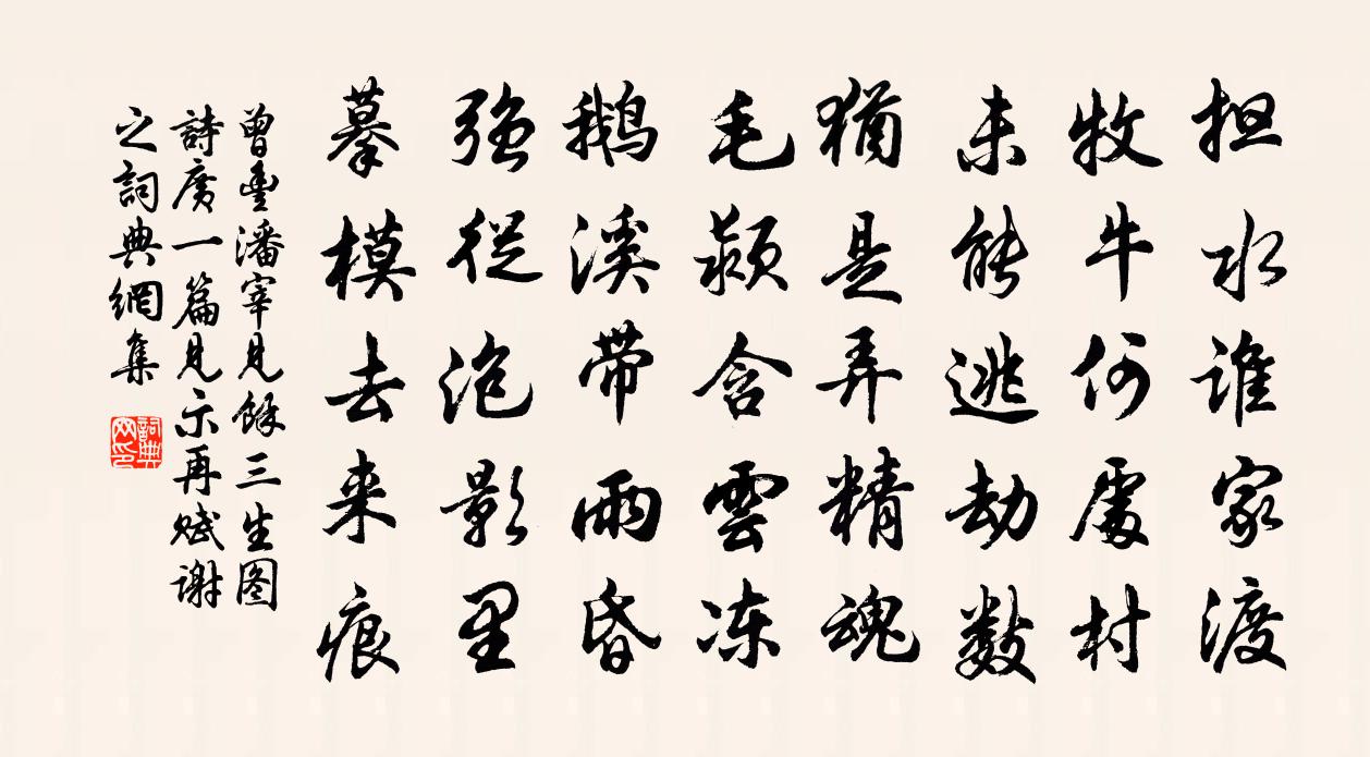 詩詞名句歷史字典書法欣賞書法字典國語詞典說文解字康熙字典古漢語字典標 題 作 者 詩 句 潘宰見餘三生圖詩廣一篇見示再賦謝之作者:曾豐 朝代:宋代原文擔水誰家渡,牧牛何處村。未能逃劫數,猶是弄精魂。毛潁含雲凍,鵝溪帶雨昏。強從泡影里,摹模去來痕。詩詞問答問:《潘宰見餘三生圖詩廣一篇見示再賦謝之》的作者是誰?答:曾豐問:該詩寫於哪個朝代?答:宋代書法欣賞潘宰見餘三生圖詩廣一篇見示再賦謝之書法作品詩詞推薦醉蓬萊黃庭堅〔宋代〕對朝雲靉靆,暮雨霏微,亂峰相倚。巫峽高唐,鎖楚宮朱翠。畫戟移春,靚妝迎馬,向一川都會。萬里投荒,一身獨樂園七題見山台司馬光〔宋代〕吾愛陶淵明,拂衣遂長往。手辭梁主命,犧牛憚金鞅。愛君心豈忘,居山神可養。輕舉向千齡,高風猶尚想。荊州新秋病起雜題一十五首病起見庭石齊己〔唐代〕病起見庭石,豈知經夏眠。不能資藥價,空自作苔錢。翠憶藍光底,青思瀑影邊。岩僧應笑我,細碎種階前。夏日偕友晚步飲聽泉軒周權〔元代〕終日局環堵,散策窮深幽。嘉我二三子,落落誠罕儔。適意隨所詣,行行遂經丘。青松如高人,含風自蕭颼。夕雲謝景竹方寺丞惠衣二首劉克莊〔宋代〕初裁隱服師極陸,忽贈送身章別一般。似雪精絺為表襮,比花文錦作中單。何妨俗笑浩然聳,不要人憐范叔寒。孰懷素上人草書歌竇冀〔唐代〕狂僧揮翰狂且逸,獨任天機摧格律。龍虎慚因點畫生,雷霆卻避鋒芒疾。魚箋絹素豈不貴,只嫌侷促兒童戲。粉壁送周尚書弘正詩 一庾信〔南北朝〕交河望合浦。玄菟想朱鳶。共此無期別。知應復幾年。到胡道士草庵二首王炎〔宋代〕綠陰啼鳥戶庭幽,解帶聊為一夕留。行李未知何日了,轉蓬方覺此生浮。市朝役役兔三窟,今古悠悠貉一丘。得似臨江仙劉秉忠〔元代〕滿路紅塵飛不去,春風弄我華顛。故園桃李酒尊前。賞心逢美景,此事古難全。若智若痴人總笑,夕陽空裊吟鞭。金縷曲初夏朱彝尊〔清代〕誰在紗窗語?是梁問、雙燕多愁,惜春歸去。早有田田青荷葉,占斷板橋西路。聽半部、新添蛙鼓。小白蔫紅都不超覽亭周牧〔宋代〕翠微深處著亭台,抖擻紅塵雙眼開。嵐影剩添杯色好,泉聲不帶市喧來。竹間啼鳥破山寂,天際孤舟界浪回。占斷滿庭芳 黃縣金玉庵馬鈺〔元代〕東寺西城,南山北海,心中好結良因。庵名金玉,堂建號全真。廊舍清風明月,圓無漏、不落沉淪。門清淨,雲朋贈山月道士姚勉〔宋代〕山高月小赤壁游,夢中道士鶴掠舟。當時此鶴是君否,猶愛山月懸高秋。夜深萬籟寂不囂,金波行空爛將流。劃然墨坳曾幾〔宋代〕有水碧於天,玄雲滃然起。定是臨池人,一沐管城子。次韻同年諸公環碧敘同年會陳造〔宋代〕聚首論年不計官,寥寥故事復開端。俯容我輩輸心語,更遣時流洗眼看。庾亮賓筵無盡興,昌黎文飲有餘歡。舍人題水西周三十三壁二首陳與義〔宋代〕周子篘中早得春,喚人同渡一溪雲。貪看雨歇前峰變,不覺斟時已十分。示上元主簿釋心月〔宋代〕單提一字趙州無,三尺吹毛也不如。萬別千差齊斬斷,白雲不敢犯清虛。西江月(十二之二)張伯端〔宋代〕此道至神至聖,憂君分薄難消。調和鉛汞不終朝。早睹玄珠形兆。志士若能修煉,何妨在市居朝。工夫容易藥非遙貽南康陳處士陶譚用之〔唐代〕白玉堆邊蔣徑橫,空涵二十四灘聲。老無征戰軒轅國,貧有茅茨帝舜城。丹鳳晝飛群木冷,一龍秋臥九江清。時人和直禁省楊凝〔唐代〕宵直丹宮近,風傳碧樹涼。漏稀銀箭滴,月度網軒光。鳳詔裁多暇,蘭燈夢更長。此時顏範貴,十步舊連行。名句推薦嘆息此人去,蕭條徐泗空李白《經下邳圯橋懷張子房》 雁聚河流濁,羊群磧草膻。齊己《送人游塞》 秋花冒綠水,密葉羅青煙。李白《古風·其五十九》 眾人助之以力,近者結之以成,遠者譽之以名,尊者載之以勢。韓非及後人《韓非子·功名》 天與火,同人;君子以類族辨物。佚名《易傳·象傳上·同人》 拆桐花爛熳,乍疏雨、洗清明。柳永《木蘭花慢·拆桐花爛熳》 年年越溪女,相憶采芙蓉。杜荀鶴《 * 怨》 只愁飛詔下青冥。不應霜塞晚,橫槊看詩成。周紫芝《臨江仙·送光州曾使君》 幾日喜春晴,幾夜愁春雨。高觀國《卜運算元·泛西湖坐間寅齋同賦》 桑柘影斜春社散,家家扶得醉人歸。王駕《社日》