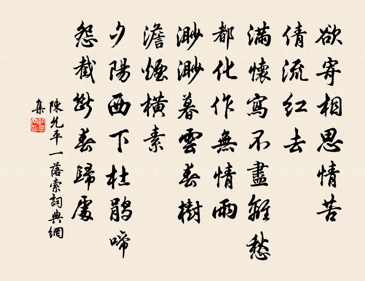 詩詞名句歷史字典書法欣賞書法字典國語詞典說文解字康熙字典古漢語字典標 題 作 者 詩 句 一落索作者:陳允平 朝代:宋代一落索原文欲寄相思情苦。倩流紅去。滿懷寫不盡離愁,都化作、無情雨。渺渺暮雲春樹。澹煙橫素。夕陽西下杜鵑啼,怨截斷、春歸處。詩詞問答問:一落索的作者是誰?答:陳允平問:一落索寫於哪個朝代?答:宋代問:一落索是什麼體裁?答:詞陳允平一落索書法欣賞一落索書法作品詩詞推薦寄王長史祖詠〔唐代〕汝潁俱宿好,往來托層巒。終日何寂寞,繞籬生蕙蘭。書葉軒張鎡〔宋代〕當處心安即洞天,黃連一炷勝龍涎。閒房幸自無人到,誰放白雲來枕前。已亥雜詩 178龔自珍〔清代〕兒談梵夾婢談兵,訊息都防老父驚。賴是搖鞭吟好句,流傳鄉里只詩名。筆山陶崇〔宋代〕晚來設色霞成綺,秋至回文雁作行。借問墨池何處是,一江環繞漱琳琅。邪正吟邵雍〔宋代〕賢人好正,奸人好邪。好邪則競,好正則和。水亭晚眺陸游〔宋代〕暑雨初晴浦面寬,水亭景物捲簾看。聯舟作陣圍魚隊,屈竹成籬護芡盤。四海諸公半丘壟,百年幾夕倚闌乾?日沈宿雲軒李彌遜〔宋代〕平生念丘壑,著我胸中雲。偶為山樊居,白雲亂衣巾。物類感濕燥,人情異蕕薰。奇峰靄朱夏,擘絮浮陽春。興來送舍弟之山南李洞〔唐代〕南山入谷游,去徹山南州。下馬雲未盡,聽猿星正稠。印茶泉繞石,封國角吹樓。遠宦有何興,貧兄無計留。壬申老人生旦陳文蔚〔宋代〕兩歲霜風吹客袍,親庭禮闕拜香醪。今日升堂祝親壽,親壽願化南山高。古來人生七十稀,吾親八十臉如桃。但得送陳景明尚書赴召四首黃公度〔宋代〕物望唐姚宋,才名漢董晁。力陣治安策,親際聖明朝。讜議裨宸極,高文燦斗杓。鵬程九萬里,一舉接扶搖。秋蕊香(生日)史浩〔宋代〕玉露ED68ED68,秋色似畫,東堂宴席初開。紅萸泛壽斝,紫菊上妝檯。倚欄見、新雁已南來。落霞孤鶩徘答彭同年勸應賢科李復〔宋代〕早歲逢予嘆陸沉,東風還更枉華音。五蹄一角必殊相,八跪二螯多躁心。眾惜伏轅傷駿骨,自慚躍冶匪祥金。摶風鶴白居易〔唐代〕人各有所好,物固無常宜。誰謂爾能舞,不如閒立時。宿湖口縣方回〔宋代〕江湖分合處,風水互東西。官禁收燈早,民居結葦低。二孤流俗誤,九派舊蹤迷。剩有登臨興,春霖滿路泥。嶺南道中曹松〔唐代〕百花成實未成歸,未必歸心與志違。但有壺觴資逸詠,盡交風景入清機。半川陰霧藏高木,一道晴蜺雜落暉。遊子講人更衣釋如淨〔宋代〕老胡教網漫天闊,當甚多年椀脫丘。勘破轉關千聖外,別行條貫結冤讎。秋思三首鮑溶〔唐代〕胡風吹雁翼,遠別無人鄉。君近雁來處,幾回斷君腸。昔奉千日書,撫心怨星霜。無書又千日,世路重茫茫。燕國自閶門騎馬入越城范成大〔宋代〕日影穿雲亦未濃,夜來疏雨洗清空。村前村後東風滿,略數桃花一萬重。斷橋隤岸數家村,雨少晴多減漲痕。雪白養雁仇遠〔宋代〕雝雝陽鳥,其居朔方。朅來江南,雪霜備嘗。意不耐暑,慮爾早亡。乃安水土,羽毛無傷。仰羨鵷雛,俯趨鶩行。離平江鄭剛中〔宋代〕橋外客舟蓮夜發,飽吹十幅風蒲滑。天明無處覓高城,但見吳江波浪闊。名句推薦十年一覺揚州夢,贏得青樓薄倖名。杜牧《遣懷》 寒來暑往,秋收冬藏。周興嗣《千字文·全文》 邦有道,貧且賤焉,恥也;邦無道,富且貴焉,恥也。孔子弟子《論語·泰伯篇》 人生易老天難老,歲歲重陽。 * 《採桑子·重陽》 桂花香霧冷,梧葉西風影。高觀國《菩薩蠻·何須急管吹雲暝》 憑空怒浪兼天涌,不盡六朝聲。歸莊《錦堂春·半壁橫江矗起》 閒處光陰易過曹雪芹《紅樓夢·第一回》 唱罷秋墳愁未歇,春叢認取雙棲蝶。納蘭性德《蝶戀花·辛苦最憐天上月》 下馬飲君酒,問君何所之?王維《送別》 翠輦不來金殿閉,宮鶯銜出上陽花雍陶《天津橋望春》