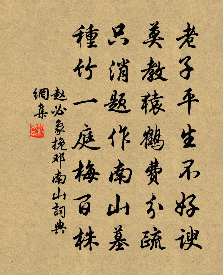 詩詞名句歷史字典書法欣賞書法字典國語詞典說文解字康熙字典古漢語字典標 題 作 者 詩 句 挽鄧南山作者:趙必象 朝代:宋代挽鄧南山原文老子平生不好諛,莫教猿鶴費分疏。只消題作南山墓,種竹一庭梅百株。詩詞問答問:挽鄧南山的作者是誰?答:趙必象問:挽鄧南山寫於哪個朝代?答:宋代趙必象挽鄧南山書法欣賞挽鄧南山書法作品詩詞推薦法曲獻仙音(小石調)柳永〔宋代〕追想秦樓心事,當年便約,于飛比翼。每恨臨歧處,正攜手、翻成雲雨離拆。念倚玉偎香,前事頓輕擲。慣憐惜。上都酬章十八兄清江〔唐代〕每嘆經年別,人生有幾年。關河長問道,風雨獨隨緣。寓蝶成莊夢,懷人識禰賢。徽猷不及此,空愧白華篇。梅林先生夫人徐氏輓詞二首范成大〔宋代〕昔簉鯉庭後,嘗瞻林下風。一從隨地遠,五度閱星終。教載恩勤在,驚呼夢幻空。送車知幾兩,獨欠舊孤童。白鷗王安石〔宋代〕江鷗好羽毛,玉雪無塵垢。滅沒波浪間,生涯亦何有。雄雌屢驚矯,機弋常紛糾。顧我獨無心,相隨如得友。飄然別董頲杜甫〔唐代〕窮冬急風水,逆浪開帆難。士子甘旨闕,不知道里寒。有求彼樂土,南適小長安。到我舟楫去,覺君衣裳單。素聞八聲甘州佚名〔宋代〕漸紛紛、木葉下亭皋,秋容際寒空。慶屏山南畔、龜游綠藻,鶴舞青松。縹緲非煙非霧,喜色有無中。簾幕金風細投贈福建桂常侍二首陳陶〔唐代〕後來台席更何人,都護朝天拜近臣。長笑當時漢卿士,等閒恩澤畫麒麟。匝地歌鐘鎮海隅,城池鞅掌舊名都。不知登楚望北樓張耒〔宋代〕裊裊危樓百尺梯,秋風有客獨攀躋。路窮流水遠更遠,目斷夕陽西復西。簾卷似迎輕燕入,柳深時有暗蟬嘶。洞庭題姚司戶萬翠亭崔起之〔宋代〕名山繞旌川,未易千百計。棲零點聳其西,二幕相扞蔽。柳山與龍山,連亘殆無際。大鰲從東出,石鼓鑒奇瑞。華次韻費同叔解嘲魏了翁〔宋代〕乞得身來作外臣,衝然肺腑自韶鈞。鹹酸獨覺水中味,形影相依鏡里真。入戶方聞夫子樂,近前孰試相君嗔。昊天四言贈兄秀才入軍詩 其七嵇康〔兩漢〕人生壽促。天地長久。百年之期。孰雲其壽。思欲登仙。以濟不朽。纜轡踟躕。仰顧我友。鷓鴣天張掄〔宋代〕彩舞萱堂喜氣新。年年今日慶生辰。碧凝香霧籠清曉,紅入桃花媚小春。須酩酊,莫逡巡。九霞杯冷又重溫。壺天九月梨花韓準〔宋代〕粉膩迷春月滿枝,誤隨秋日弄芳菲。料應潛作春宵夢,剛被西風不放歸。送劉金部三首李新〔宋代〕綺鸞銜詔碧霜林,按部歸來聽好音。臥看蜀雲山歷歷,行游蘭省夜沉沉。柔桑平帶三川綠,蒼桂同鋪百里陰。天子雨中區仕衡〔宋代〕蓬窗竹戶小園東,濕書殘紅又淺紅。羨殺烏棲深樹穩,豆花籬落花流中。滴水岩方信孺〔宋代〕天半飛濤六月寒,蒼岸壁立互迴環。從今好事能題品,列作南中第一仙。擬古蘇泂〔宋代〕日月遞相見,玄發驚蹉跎。冥冥北邙路,去者何其多。妻孥聚歡樂,志遠身已訛。功名無富貴,此路不可過。可憐憎蚊歐陽修〔宋代〕擾擾萬類殊,可憎非一族。甚哉蚊之微,豈足污簡牘。乾坤量廣大,善惡皆含育。荒茫三五前,民物交相黷。禹鼎壽皇太子趙彥端〔宋代〕二聖多能似仲尼,儲皇家學自庭圍。銀鉤已有淳熙腳,玉句仍傳德壽衣。經古寺李中〔唐代〕殿宇半隳摧,門臨野水開。雲凝何代樹,草蔽此時台。繞塔堆黃葉,沿階積綠苔。踟躕日將暮,棲鳥入巢來。名句推薦今朝此為別,何處還相遇。韋應物《初發揚子寄元大校書》 冷艷全欺雪,余香乍入衣。丘為《左掖梨花》 夫大寒至,霜雪降,然後知松柏之茂也。劉安及其門客《淮南子·俶真訓》 髻子傷春慵更梳。晚風庭院落梅初。李清照《浣溪沙·髻子傷春慵更梳》 君子敬以直內,義以方外,敬義立而德不孤。佚名《易傳·文言傳·坤文言》 丈夫貧賤應未足,今日相逢無酒錢。高適《別董大二首》 馬逢伯樂而嘶,人遇知己而死。羅貫中《三國演義·第六十回》 社下燒錢鼓似雷,日斜扶得醉翁回。范成大《春日田園雜興》 久雨寒蟬少,空山落葉深。秘演《山中》 蓄恩不倦,以一取萬。黃石公《三略·上略》