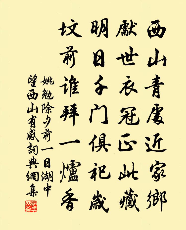 詩詞名句歷史字典書法欣賞書法字典國語詞典說文解字康熙字典古漢語字典標 題 作 者 詩 句 除夕前一日湖中望西山有感作者:姚勉 朝代:宋代除夕前一日湖中望西山有感原文西山青處近家鄉,先世衣冠正此藏。明日千門俱祀歲,墳前誰拜一爐香。詩詞問答問:除夕前一日湖中望西山有感的作者是誰?答:姚勉問:除夕前一日湖中望西山有感寫於哪個朝代?答:宋代姚勉除夕前一日湖中望西山有感書法欣賞除夕前一日湖中望西山有感書法作品詩詞推薦淳熙已酉二月二日皇帝登寶位鎡獲廁廷紳輒成張鎡〔宋代〕宣召班排過隔廊,聳聞神器授儲皇。只將揖遜為家法,我宋真宜萬代昌。挽劉季文劉宰〔宋代〕斷岸扁舟去,中林好事家。扣門無倦色,安土足生涯。國寵期金紫,家聲振玉砂。如何年不百,泣淚濕飛花。雜劇·昊天塔孟良盜骨朱凱〔元代〕第一折(沖末扮楊景領卒子上,詩云)雄鎮三關幾度秋,番兵不敢犯白溝。父兄為國行忠孝,敕賜清風無佞樓。某出都呈十五叔父晁補之〔宋代〕凌兢瘦馬不堪驅,塞眼紅塵暗九衢。太學虀鹽聊樂只,故園桃李且歸歟。上書北闕三年困,種豆南山一半蕪。忍志春日偶作溫庭筠〔唐代〕西園一曲艷陽歌,擾擾車塵負薜蘿。自欲放懷猶未得,不知經世竟如何。夜聞猛雨判花盡,寒戀重衾覺夢多。釣渚閿鄉寓居十首蛙聲吳融〔唐代〕稚圭倫鑒未精通,只把蛙聲鼓吹同。君聽月明人靜夜,肯饒天籟與松風。李西清先生創凌霄觀於潼川紅樓之上賦計敬和程公許〔宋代〕丈人氣湖海,合臥百尺樓。引袖麾八極,無處豁前眸。肯以治城志,而忘天下憂。窘步爭徑捷,危炊迷劍頭。攀天採藥徑釋文珦〔宋代〕采芭歸來跡已陳,真風千古蛻凡塵。細看舊徑青青草,猶是仙人醉里春。洞庭春色(並引)蘇軾〔宋代〕安定郡王以黃柑釀酒,謂之洞庭春色,色香味三絕,以餉其猶子德麟。德麟以飲余,為作此詩。醉後信筆,頗有沓麞猿圖張耒〔宋代〕陰岩萬古無纖塵,木石翠潤無冬春。時哉兩猿掛復蹲,其一抱子為屈伸。下有游貆意甚馴,雄雌嬉遊循水濱。沐猴和李公擇赴歷下道中雜詠十二首其十一梁山洎蘇轍〔宋代〕花開南北一般紅,路過江淮萬里通。飛蓋靚妝迎客笑,鮮魚白酒醉船中。伯時往河東戲與廉夫分韻道相思之意三首傅察〔宋代〕日月劇跳丸,暫別亦已久。青山繚層巔,道里阻且右。今晨登南樓。會此同志友。思公聊北望,佇立但搔首。秋風奉使契丹二十八首其二十二學士院端午帖子二蘇轍〔宋代〕九夏清齋奉至尊,消除癘疫去無痕。太醫爭獻天師艾,瑞霧長縈堯母門。紀興高質齋〔宋代〕湖上人家萬木村,白雲深護讀書門。年來不管頭顱白,自賀清風酒一樽。次韻暘叔見示伽陀李彌遜〔宋代〕無形何用強安名,只麽騰騰信腳行。一事到頭猶是幻,萬緣何處可留情。雲歸夜壑空難狀,月落秋江影自生。唯有滿庭芳 贈寧海顏先生馬鈺〔元代〕降心一著,有些法度。要你自心省悟。閒想骷髏模樣,緣甚作做。因貪氣財酒色,損精神、墮於惡趣。如恐怖,管秋日登郡樓二首蔡襄〔宋代〕秋水已復漕,秋風初怒號。天容霜後淨,山勢北來高。此君室方蒙仲〔宋代〕清神造物慳,數竿自超俗。苦覓渭濱封,萬此豈有足。憶秦娥(初冬)趙長卿〔宋代〕寒蕭索。征鴻過盡離懷惡。離懷惡。江空天迥,夜寒楓落。有人應誤刀頭約。情深翻恨郎情薄。郎情薄。夢回長是雜曲歌辭。結客少年場行虞羽客〔唐代〕幽并俠少年,金絡控連錢。竊符方救趙,擊築正懷燕。輕生辭鳳闕,揮袂上祁連。陸離橫寶劍,出沒驚徂旃。蒙輪名句推薦吳洲如見月,千里幸相思。李白《送張舍人之江東》 世人結交須黃金,黃金不多交不深。張謂《題長安壁主人》 獨坐幽篁里,彈琴復長嘯。王維《竹里館》 八月寒葦花,秋江浪頭白。李頎《送劉昱》 人不通今古,馬牛如襟裾。佚名《增廣賢文·上集》 起來搔首,梅影橫窗瘦。汪藻《點絳唇·新月娟娟》 晨起動征鐸,客行悲故鄉。溫庭筠《商山早行》 凡行軍越過山險而陣,必依附山谷,一則利水草,一則附險固,以戰則勝。佚名《百戰奇略·第四卷·谷戰》 陽月南飛雁,傳聞至此回。宋之問《題大庾嶺北驛》 願借天風吹得遠,家家門巷盡成春。李方膺《題畫梅》