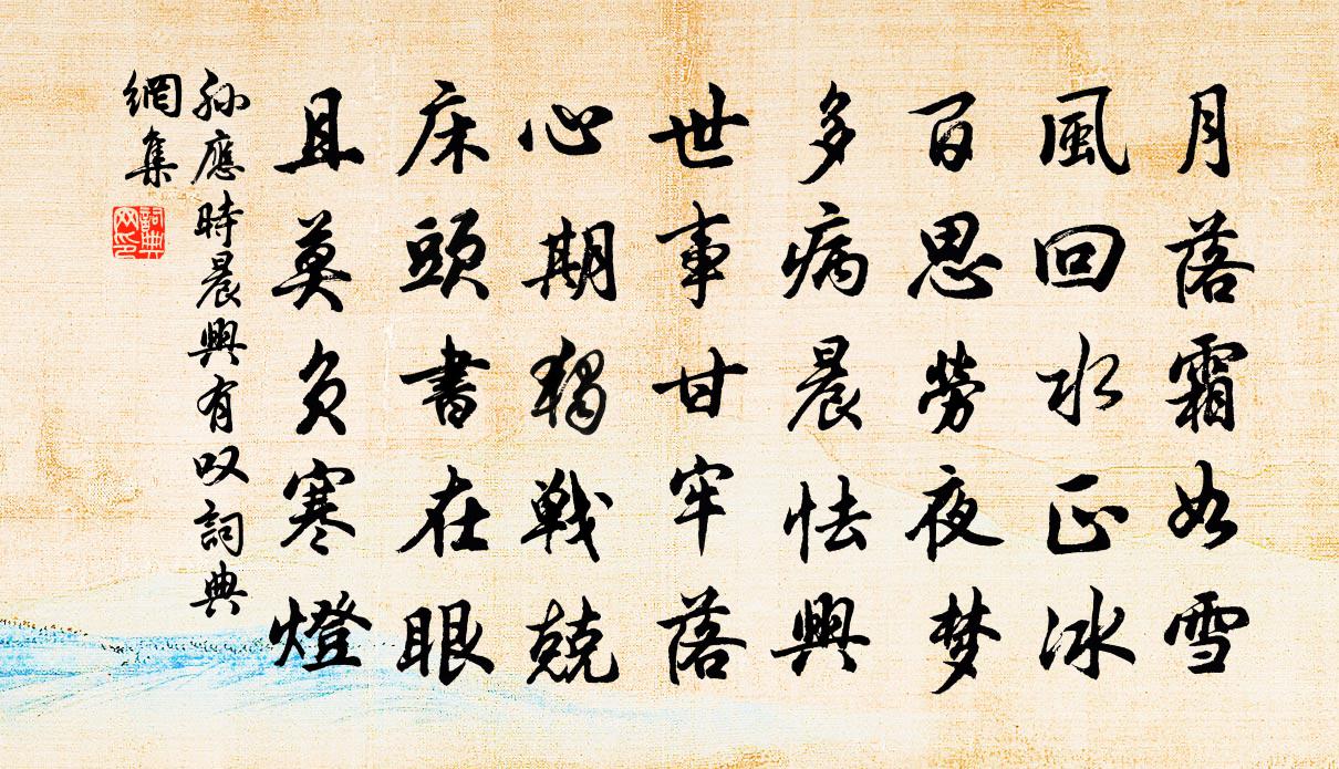 詩詞名句歷史字典書法欣賞書法字典國語詞典說文解字康熙字典古漢語字典標 題 作 者 詩 句 晨興有嘆作者:孫應時 朝代:宋代晨興有嘆原文月落霜如雪,風回水正冰。百思勞夜夢,多病晨怯興。世事甘牢落,心期獨戰兢。床頭書在眼,且莫負寒燈。詩詞問答問:晨興有嘆的作者是誰?答:孫應時問:晨興有嘆寫於哪個朝代?答:宋代孫應時晨興有嘆書法欣賞晨興有嘆書法作品詩詞推薦村居陸游〔宋代〕遊子從來念故鄉,我歸仍得值豐穰。粗繒裁製襜褕暖,肥羜烹調餺飥香。對客不妨依几杖,呼兒時與話耕桑。卻慚和李公擇赴歷下道中雜詠十二首其三桃園阻淺蘇轍〔宋代〕此生與物妄相仇,欲往長嫌苦見留。淺瀨何知向人惡,漲溪豈復為公流。雨痕忽到工催客,風信初來轉打頭。舉目送友人游蜀賈島〔唐代〕萬岑深積翠,路向此中難。欲暮多羈思,因高莫遠看。卓家人寂寞,揚子業凋殘。唯有岷江水,悠悠帶月寒。時賢明鑑裁唐士恥〔宋代〕時賢明鑑裁,鑒裁信奇歟。識此希世寶,謂其僧區區。未冠已溢聲,賢書上宸庭。不一而止足,竟壓四海英。直入送韓子云撿正將漕江東二首楊萬里〔宋代〕名下得佳句,夢中喔半生。未逢心已契,相見眼偏明。復此匆匆別,蒼然惘惘情。非關風外樹,儂自作離聲。感懷方岳〔宋代〕去國何年年一丘,於今已換幾公侯。不知我者謂為拙,是有命焉那用求。舴艋舟應容釣蟹,麒麟閣不畫騎牛。百年下第後寄高山人顧非熊〔唐代〕我家堂屋前,仰視大茅巔。潭靜鳥聲異,地寒松色鮮。人眠瓮牖月,鹿飲竹門泉。多愧鄰高隱,無成又一年。同坐客賦席牡丹酴醿海棠三首李彌遜〔宋代〕胭脂著雨弄餘妍,力挽人暉上舞筵。誰道卷紗紅映內,杜陵正欲補遺篇。明日復理夢中意作陸游〔宋代〕白盡髭鬚兩頰紅,頹然自以放名翁。客從謝事歸時散,詩到無人愛處工。高掛蒲帆上黃鶴,獨吹銅笛過垂虹。閒人上鄧憲生辰楊簡〔宋代〕維公誕彌,端月維時,夢維熊羆。何以壽之,南山維基,大椿植之。毋祝毋祈,公自有之。某也作頌,於以敬之。挽妹婿汪汻四首許月卿〔宋代〕郎罷當年語,深閨婉娩三。有齊之季女,必有有奇男。滿目呱呱泣,傷心切切彈。離鸞驚別鵠,何日淚痕乾。頌古三首釋宗印〔宋代〕一畝之地,三蛇九鼠。物是定價,錢是足數。一日曲楊軒〔宋代〕妾家鄧侯國,肯愧邯鄣姝。世本富繒綺,嬌愛比明珠。一五學組訓,未嘗開戶樞。十六失所適,姓名傾里閭。十七遣悲懷三首·其一元稹〔唐代〕謝公最小偏憐女,自嫁黔婁百事乖。顧我無衣搜藎篋,泥他沽酒拔金釵。(藎篋 一作:畫篋)野蔬充膳甘長藿,頌古九十八首釋印肅〔宋代〕古今學道與參禪,未諳眼耳妙言詮。一粒玄沙無住本,時時興販海南船。送趙明叔明府翁卷〔宋代〕隨行惟一琴,前路足幽尋。今夜維舟處,何村隔樹林。鴻聲秋浦冷,雨氣海山深。若問三年政,知君盡此心。點絳唇(十月桃花)韓元吉〔宋代〕木落霜濃,探春只道梅花未。嫩紅相倚。灼灼新妝膩。莫問仙源,且問花前事。休辭醉。想君園□。總是生春地。山信至說平泉別墅草木滋長地轉幽深悵然思歸復此作李德裕〔唐代〕忽聞樵客語,暫慰野人心。幽徑芳蘭密,閒庭秀木深。麇麚來澗底,鳧鵠遍川潯。誰念滄溟上,歸歟起嘆音。漢上登舟憶閩翁承贊〔唐代〕漢皋亭畔起西風,半掛征帆立向東。久客自憐歸路近,算程不怕酒觴空。參差雁陣天初碧,零落漁家蓼欲紅。一片冬夕與諸公宴集賢梅學士西齋分得今夕何夕探楊億〔宋代〕今夕知何夕,良交會以文。燭花寒旋落,漏滴遠稀聞。酒面輕浮蟻,歌喉細遏雲。明河光未沒,候管氣初分。玉笛名句推薦碧水驚秋,黃雲凝暮,敗葉零亂空階。秦觀《滿庭芳·碧水驚秋》 樓倚霜樹外,鏡天無一毫。杜牧《長安秋望》 西風滿天雪,何處報人恩。齊己《劍客》 萬事到頭都是夢,休休。明日黃花蝶也愁。蘇軾《南鄉子·重九涵輝樓呈徐君猷》 禍難生於邪心,邪心誘於可欲。韓非及後人《韓非子·解老》 訪戴歸來,尋梅懶去,獨釣無聊。薛昂夫《蟾宮曲·雪》 甚獨抱清高,頓成淒楚。王沂孫《齊天樂·蟬》 太平之世多長壽人。王充《論衡·卷一·氣壽篇》 斜陽外,寒鴉萬點,流水繞孤村。秦觀《滿庭芳·山抹微雲》 雪霜凌厲而見殺,來歲不改其性也黃庭堅《書幽芳亭記》