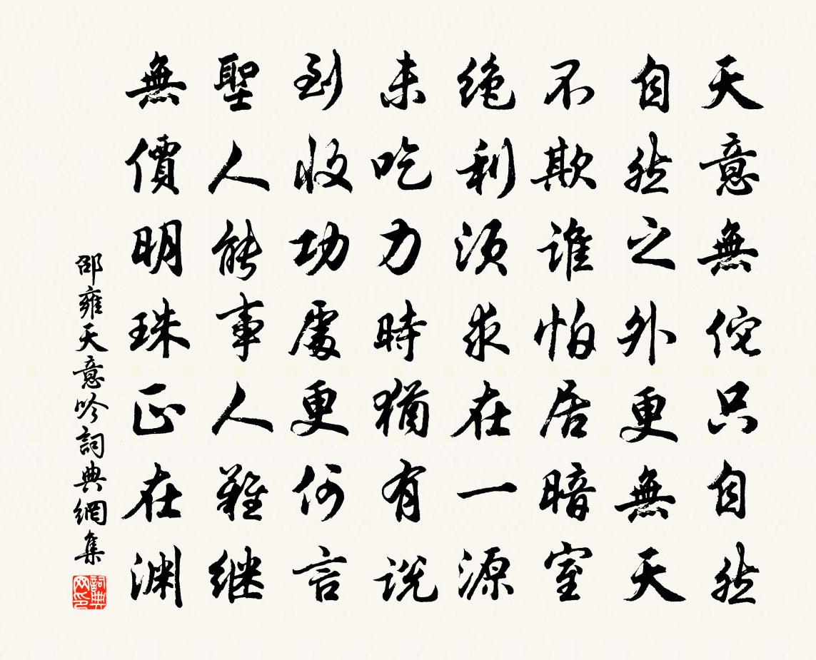 詩詞名句歷史字典書法欣賞書法字典國語詞典說文解字康熙字典古漢語字典標 題 作 者 詩 句 天意吟作者:邵雍 朝代:宋代天意吟原文天意無佗只自然,自然之外更無天。不欺誰怕居暗室,絕利須求在一源。未吃力時猶有說,到收功處更何言。聖人能事人難繼,無價明珠正在淵。詩詞問答問:天意吟的作者是誰?答:邵雍問:天意吟寫於哪個朝代?答:宋代邵雍天意吟書法欣賞天意吟書法作品詩詞推薦有懷大兄正字洪邁〔宋代〕今日思兄弟,江東望浙東。別離無奈久。書札且頻通。雨涇芭蕉碧,風乾薜荔紅。少年游晏幾道〔宋代〕綠勾闌畔,黃昏淡月,攜手對殘紅。紗窗影里,朦騰春睡,繁杏小屏風。須愁別後,天高海闊,何處更相逢。幸有題天慶觀鄧肅〔宋代〕真人躡身凌紫霞,下憫濁世長咨嗟。崇樓傑閣耀金碧,開闡至道非雄夸。仙茅連山可度世,守此規規如井蛙。靈雲會課乾明寺桑正國〔宋代〕悠悠意得自疏通,寂地因居樂性空。幽思曉風清迫枕,靜聽寒雨細沾桐。修莖竹韻澄玉簫,綠影松垂亂鬢蓬。儔侶大祖禪師贊釋慧開〔宋代〕三拜起來依位立,普天匝地黑漫漫,可憐只臂空輪卻,千古今人作笑端。送勛侄之官嵢峽五言五首劉克莊〔宋代〕太守今元結,論交四十年。汝行勿前卻,如在父兄邊。湖上小閣陸游〔宋代〕蒲萄初紫柿初紅,小閣憑闌萬里風。莫怪年來增酒量,此中能著太虛空。生查子王千秋〔宋代〕雄姿畫麒麟,朽骨分螻蟻。爭似及生前,常為鶯花醉。雲山靜有情,天地寬無際。且放兩眉開,萬事非人意。春日絕句陸游〔宋代〕故園蛺蠂最多種,百草長時花亂開。窮巷春風元不到,一雙誰遣過牆來?黃子陂荷花唐彥謙〔唐代〕十頃狂風撼麴塵,緣堤照水露紅新。世間花氣皆愁絕,恰是蓮香更惱人。再題天衣寺曾幾〔宋代〕畫舫珠簾出繚牆,天風吹到芰荷鄉。水光入座杯盤瑩,花氣侵人笑語香。留別道士許自然賀鑄〔宋代〕東晉高賢許遠遊,裔孫今不墜風流。還有臨川王太傅,每思與語即登樓。浮名何啻如雲薄,鐘鼓爰居非所樂。漱石萬州守潘拉登魯池觀荷花荔枝魏了翁〔宋代〕分隨猿鶴老隈支,趨詔重來兩鬢絲。解後一觴莫辭凸,能禁二十載差池。寄李簡夫宮使五首蘇泂〔宋代〕覓得驪龍頷下珠,幾年參請遍江湖。只今同味仍同病,惟有親朋李簡夫。觀烏鳶山下藤樹釋永頤〔宋代〕一株老樹蔽荒林,下有藤懸巨蟒身。幾度日斜烏鳥散,山昏鬼器斷行人。題劉松年畫團扇二首宋高宗〔宋代〕南山晴翠入波光,一派溪聲繞路長。最愛早春沙岸暖,東風輕浪拍鴛鴦。賀澹庵先生胡侍即新居落成二首楊萬里〔宋代〕清廟欹斜一笑扶,歸來四壁亦元無。可憐拙計輸餘子,住破僧房始結廬。三逕非遙人自遠,萬間不惡我何須。冥搜送張坦公方伯出塞丁澎〔清代〕老去悲長劍,胡為獨遠征?半生戎馬換,片語玉關行。亂石沖雲走,飛沙撼磧鳴。萬方新雨露,吹不到邊城。句朱鬥文〔宋代〕空存淥水橋,不見青苔寺。奉和魯望四明山九題鹿亭皮日休〔唐代〕鹿群多此住,因構白雲楣。待侶傍花久,引麛穿竹遲。經時掊玉澗,盡日嗅金芝。為在石窗下,成仙自不知。名句推薦音塵絕,西風殘照,漢家陵闕。李白《憶秦娥·簫聲咽》 如欲平治天下,當今之世,捨我其誰也。孟子《孟子·公孫丑章句下·第十三節》 汴水流,泗水流,流到瓜州古渡頭。吳山點點愁白居易《長相思·汴水流》 胡馬依北風,越鳥巢南枝。佚名《行行重行行》 紅葉滿寒溪,一路空山萬木齊。納蘭性德《南鄉子·秋暮村居》 十年生死兩茫茫,不思量,自難忘。蘇軾《江城子·乙卯正月二十日夜記夢》 亂點碎紅山杏發,平鋪新綠水蘋生。白居易《南湖早春》 爾我同心,曰金蘭;朋友相資,日麗澤。程登吉《幼學瓊林·卷二·朋友賓主》 菱葉縈波荷颭風,荷花深處小船通。白居易《採蓮曲》 流水落花春去也,天上人間。李煜《浪淘沙令·簾外雨潺潺》