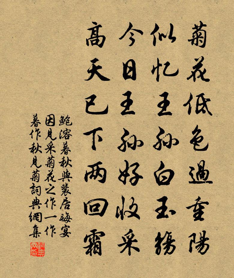 詩詞名句歷史字典書法欣賞書法字典國語詞典說文解字康熙字典古漢語字典標 題 作 者 詩 句 暮秋與裴居晦宴因見採菊花之作(一作暮作秋見菊)作者:鮑溶 朝代:唐代原文菊花低色過重陽,似憶王孫白玉觴。今日王孫好收采,高天已下兩回霜。詩詞問答問:《暮秋與裴居晦宴因見採菊花之作(一作暮作秋見菊)》的作者是誰?答:鮑溶問:該詩寫於哪個朝代?答:唐代書法欣賞暮秋與裴居晦宴因見採菊花之作(一作暮作秋見菊)書法作品詩詞推薦勤王第五十三文天祥〔宋代〕出師亘長雲,盡驅詣闕下。首唱恢大義,垂之俟來者。青玉案(至宜州次韻上酬七兄)黃庭堅〔宋代〕煙中一線來時路。極目送、歸鴻去。第四陽關雲不度。山胡新囀,子規言語。正在人愁處。憂能損性休朝暮。憶我泥滑滑毛直方〔宋代〕泥滑滑,日已西。泥深屨滑涴征衣,征衣涴盡不肯歸。分明數聲行不得,請君更聽鷓鴣啼。春村白居易〔唐代〕二月村園暖,桑間戴勝飛。農夫舂舊谷,蠶妾禱新衣。牛馬因風遠,雞豚過社稀。黃昏林下路,鼓笛賽神歸。游法華寺宋之問〔唐代〕薄游京都日,遙羨稽山名。分刺江海郡,朅來征素情。松露洗心眷,象筵敷念誠。薄雲界青嶂,皎日鶱朱甍。苔澗同韓郎中閒庭南望秋景韋應物〔唐代〕朝下抱餘素,地高心本閒。如何趨府客,罷秩見秋山。疏樹共寒意,游禽同暮還。因君悟清景,西望一開顏。赴調宋祁〔宋代〕編政黃堂碧鸛衣,遠餐周粟位猶卑。人推東魯丘園秀,吏得西京法令師。驪駕路長雲拂蓋,鵠歌亭曉桂凝卮。上書秦鏡張佐〔唐代〕樓上秦時鏡,千秋獨有名。菱花寒不落,冰質夏長清。龍在形難掩,人來膽易呈。升台宜遠照,開匣乍藏明。皎色與長孺共讀東坡詩,前用唐律,後用進退格二楊萬里〔宋代〕急性平生不少徐,讀書不喜喜觀書。十行俱下未心醒,兩目頓昏還月余。偶與兒曹翻故紙,共看詩句煮春蔬。問來子□林粹餉予雙雞劉克莊〔宋代〕空谷跫然聞足音,殷勤通守致家禽。陰晴不爽司晨□,□暮全無起舞心。夢短那堪眠警枕,脛長稍已怯□衾。可憐春秋戰國門淳于髡周曇〔唐代〕穰穰何禱手何齎,一呷村漿與只雞。以少求多誠可笑,還如輕幣欲全齊。去郡三思方岳〔宋代〕我思種明逸,與帝自賓友。歸眠青山雲,未醒紫宸酒。誰何敢譏彈,乃有此健守。天心本無私,以一調眾口。徙之楊武恭王輓詞樓鑰〔宋代〕勇氣真虓虎,仁心劇放麑。推鋒多折馘,解縛屢招攜。細柳門堅閉,長楊馬不嘶。夜深星忽墮,何處問撐犁。鷓鴣天(壽定庵運管兄)張榘〔宋代〕飽挹台城白鷺秋。又騎黃鵠上江州。恩波浩蕩三千里,多少人家願借留。□壽斝,菊香浮。姓名還喜到宸旒。片□葵窗送酒陳起〔宋代〕久藏斗酒謀諸婦,婢子倉皇錯授醯。解後芸居初止酒,小廚海錯旋開泥。樂仙觀若虛〔唐代〕樂氏騎龍上碧天,東吳遺宅尚依然。悟來大道無多事,真後丹元不值錢。老樹夜風蟲咬葉,古垣春雨蘚生磚。松傾進退吟邵雍〔宋代〕進退兩途皆曰賓,何煩坐上苦云云。低眉坐處當周物,掉臂行時莫顧人。齒髮既衰非少日,林泉能老是長春。行於夜意李復〔宋代〕山霧連城白,虛庭待月生。雨余秋葉潤,露重葛衣輕。陰壁鳴蟲澀,風枝宿鳥驚。淹留禾黍興,悵望故園情。拜訪陸處士曹松〔唐代〕萬卷書邊人半白,再來惟恐降玄纁。性靈比鶴爭多少,氣力登山較幾分。吟鬢漸無前度漆,寢衣猶有昨宵雲。將知興安縣傅若金〔元代〕亂峰如劍不知名,篁竹蕭蕭送驛程。轉粟未休灕水役,負戈猶發夜郎兵。百蠻日落朱旗暗,九嶺風來畫角清。空使名句推薦兩處春光同日盡,居人思客客思家。白居易《望驛台》 不知來歲牡丹時,再相逢何處。葉清臣《賀聖朝·留別》 千形萬象竟還空,映水藏山片復重。來鵠《雲》 小立紅橋柳半垂,越羅裙颺縷金衣。納蘭性德《山花子·小立紅橋柳半垂》 不教而誅,則刑繁而邪不勝;教而不誅,則奸民不懲。荀子《荀子·富國》 故人宿茅宇,夕鳥栖楊園。李白《之廣陵宿常二南郭幽居》 燕支長寒雪作花,蛾眉憔悴沒胡沙。李白《王昭君二首》 郎騎竹馬來,繞床弄青梅。李白《長干行二首》 笑殺陶淵明,不飲杯中酒。李白《嘲王歷陽不肯飲酒》 為誰醉倒為誰醒,到今猶恨輕離別。呂本中《踏莎行·雪似梅花》