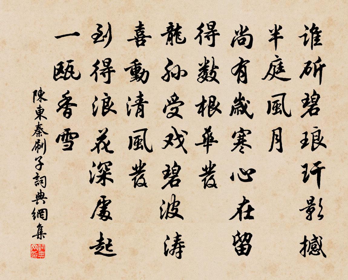 詩詞名句歷史字典書法欣賞書法字典國語詞典說文解字康熙字典古漢語字典標 題 作 者 詩 句 秦刷子作者:陳東 朝代:宋代秦刷子原文誰斫碧琅玕,影撼半庭風月。尚有歲寒心在,留得數根華發。龍孫受戲碧波濤,喜動清風發。到得浪花深處,起一甌香雪。詩詞問答問:秦刷子的作者是誰?答:陳東問:秦刷子寫於哪個朝代?答:宋代問:秦刷子是什麼體裁?答:詞陳東秦刷子書法欣賞秦刷子書法作品詩詞推薦蝶戀花 次前韻,答智仲敬劉敏中〔元代〕多病多愁心性軟。自上疏簾,怕隔雙飛燕。夢覺綠窗花影畔。起來翻喜茶甌淺。香壓玉爐消欲斷。情緒厭厭,猶傍雜題陸游〔宋代〕少談王霸謀身拙,晚好詩騷學道疏。賴有一籌差 * ,閉門不作子公書。念佛三昧詩釋遵式〔宋代〕融抱回曲照,熙如鑒中象。諦覽無遺心,虛求非滯想。追夢忘始終,通幽宛如往。藉此會神姿,逍遙期西賞。題城南書院三十四詠張栻〔宋代〕野艇新成尋丈許,柳堤詳觀總不偏。飛絮滿空春不盡,新荷帖水已田田。初還信州呈寓居諸公曾幾〔宋代〕萬事不稱意,一生長損心。稍知閒有味,又覺老相侵。田舍那能問,溪山未暇尋。清歌一杯酒,聊與故人斟。陪高計使柱史謝庾使刑郎登梅仙山丹青閣趙汝騰〔宋代〕侵雲祠宇絕荒涼,目眴憑虛興寄長。仙者遠遊非穆穆,天之視下亦蒼蒼。貴公業趁塵泥腐,小尉名爭日月光。此地賦得望遠山送客歸無可〔唐代〕遙山寒雨過,正向暮天橫。隱隱凌雲出,蒼蒼與水平。何時凝厚地,幾處映孤城。歸客秋風裡,回看傷別情。郊廟歌辭。祭汾陰樂章。舒和何鸞〔唐代〕樂奏雲闋,禮章載虔。禋宗於地,昭假於天。惟馨薦矣,既醉歆焉。神之降福,永永萬年。頌古釋道顏〔宋代〕綿州附子漢州姜,最好沉黎出麝香。魯子師僧才一嗅,鼻頭裂破眼睛黃。洪橋客窗枕上陳郁〔宋代〕桐葉飄零月似冰,並河燈火夜寒生。闌乾倦倚投床去,臥聽趨朝過馬聲。道中遣興曹彥約〔宋代〕遊宦何曾樂,佳時又出門。春深花處處,社近鼓村村。天地一羈旅,江山千吐吞。平生黃妳誤,今日麴生尊。半山寺三首楊萬里〔宋代〕霜松雪竹老重尋,南盪東陂水自深。鳳去宅存誰與住,不如作寺免傷心。寒食日題杜鵑花曹松〔唐代〕一朵又一朵,並開寒食時。誰家不禁火,總在此花枝。贈墨客呂雲叔姚勉〔宋代〕昔我花奏賦趨花南花,路花逢墨客回仙翁。筆端攪動雲霧起,裹送龍入天門中。薰風入對經前路,更覓仙翁一丸去初夏戴復古〔宋代〕紅紫光陰不久長,一聲啼鴃靜年芳。陰陰綠樹黃鸝語,將與人間作夏涼。句皇甫□〔宋代〕棹穿波底月。試院贈三同官陳造〔宋代〕果飣茶甌意未闌,獨慚衰鬢映朱顏。聚頭長作三更語,屈指惟餘兩日閒。食葉蠶聲行入聽,探珠驪頷不應慳。預憐梁三朝雅樂歌 寅雅沈約〔南北朝〕禮莫違。樂具舉。延藩辟。朝帝所。執桓蒲。列齊莒。垂袞毳。紛容與。升有儀。降有序。齊簪紱。忘笑語。始矜書懷寄李相如晃沖之〔宋代〕秋風吹畦蔬,農事亦已闌。黃黃杞下菊,佳色屍冢間。我生復何如,憔悴嘗照顏。清晨戴星出,薄莫及日還。骯髒淳熙已酉二月二日皇帝登寶位鎡獲廁廷紳輒成張鎡〔宋代〕黎庶曾何帝力知,七旬三入刈寧時。春寒誰怕妨花柳,一日東風萬國吹。名句推薦石溪久住思端午,館驛樓前看發機。盧肇《競渡詩 / 及第後江寧觀競渡寄袁州剌史成應元》 笙歌散盡遊人去,始覺春空。歐陽修《採桑子·群芳過後西湖好》 為人不做虧心事,半夜敲門心不驚。佚名《增廣賢文·上集》 名花傾國兩相歡,常得君王帶笑看。李白《清平調·名花傾國兩相歡》 惟順於父母,可以解憂。孟子《孟子·萬章章句上·第一節》 飛錫離鄉久,寧親喜臘初。錢起《送外甥懷素上人歸鄉侍奉》 朝落暮開空自許,竟無人解知心苦晏幾道《蝶戀花·笑艷秋蓮生綠浦》 眺聽良多感,徙倚獨沾襟。李密《淮陽感秋》 翠華想像空山里,玉殿虛無野寺中。杜甫《詠懷古蹟五首·其四》 君問歸期未有期,巴山夜雨漲秋池。李商隱《夜雨寄北》