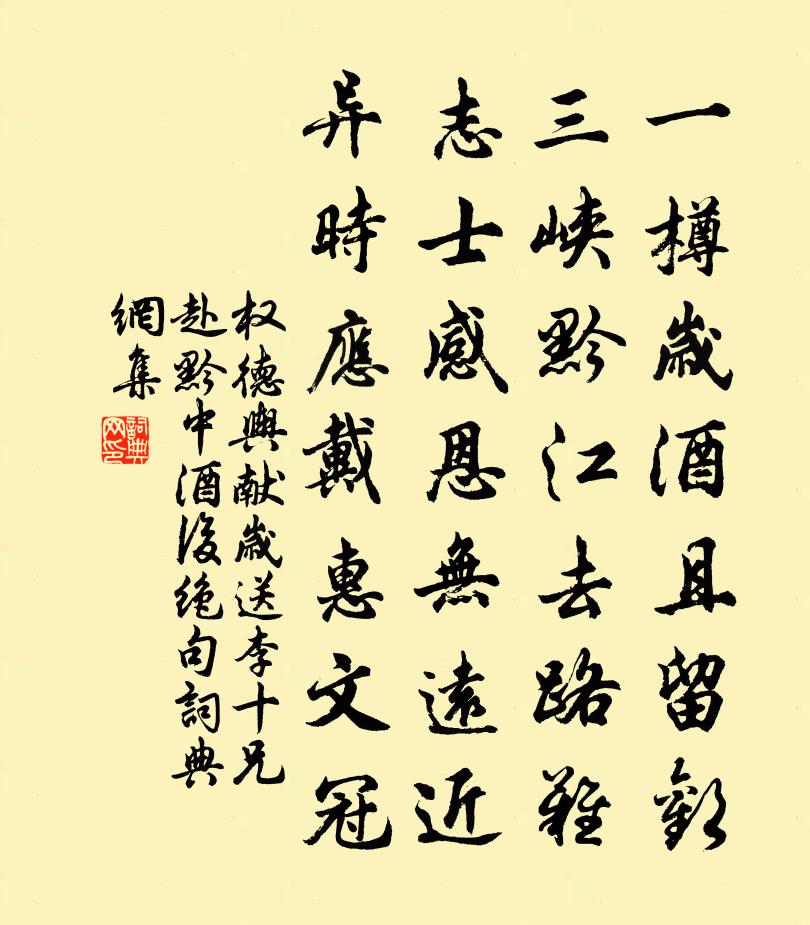 詩詞名句歷史字典書法欣賞書法字典國語詞典說文解字康熙字典古漢語字典標 題 作 者 詩 句 獻歲送李十兄赴黔中酒後絕句作者:權德輿 朝代:唐代原文一樽歲酒且留歡,三峽黔江去路難。志士感恩無遠近,異時應戴惠文冠。詩詞問答問:《獻歲送李十兄赴黔中酒後絕句》的作者是誰?答:權德輿問:該詩寫於哪個朝代?答:唐代問:該詩是什麼體裁?答:七絕書法欣賞獻歲送李十兄赴黔中酒後絕句書法作品注釋全唐詩:卷323-16詩詞推薦謁范參政並赴袁起岩,郡會坐中熾炭周圍,遂楊萬里〔宋代〕後炭前爐便是窯,饒君是鐵也教銷。不須泉下火山獄,新制人間法外條。今日晴明殊可喜,病夫意緒自無聊。看來游希夷觀李呂〔宋代〕楓老丹成葉,蘆輕雪作花。晚風何處備,疏柳欲棲鴉。絕壁生虛靄,晴天點片霞。莫教殘酒醒,客里易思家。自豫章南還江上作張九齡〔唐代〕歸去南江水,磷磷見底清。轉逢空闊處,聊洗滯留情。浦樹遙如待,江鷗近若迎。津途別有趣,況乃濯吾纓。蔬餐林泳〔宋代〕山人藜莧慣枯腸,上頓時憑般若湯。折項葫蘆初熟美,著毛蘿蔔久煨香。炊粱剪韭貧聊辦,煮餅澆蔥病未嘗。晦叔漸漸之石佚名〔先秦〕漸漸之石,維其高矣。山川悠遠,維其勞矣。武人東征,不遑朝矣。漸漸之石,維其卒矣。山川悠遠,曷其沒矣?和普公賦東園十題其五虛白堂梅堯臣〔宋代〕空堂絕纖塵,虛靜自生白。長風吹月東,窗戶如不隔。漆園茲趣深,赤水珠難索。端居繆鑒〔宋代〕修竹垂楊映戶栽,清風長送午陰來。門因好客時時歸,窗為看山面面開。此樂恐於兒輩覺,長貧能免俗情猜。儒衣感懷二首楊公遠〔宋代〕長吟抱膝更欷噓,較著前時迥不如。世事看來巢幕燕,人生勘破上竿魚。投非所好緣工瑟,見匪相知嫩曳裾。造物五歌食魚陸龜蒙〔唐代〕江南春旱魚無澤,歲晏未曾腥鼎鬲。今朝有客賣鱸魴,手提見我長於尺。呼兒舂取紅蓮米,輕重相當加十倍。且作句章縡〔宋代〕船尾淮山青未了,馬頭隋柳綠相迎。上天竺孫雄飛〔宋代〕行窮湖上徑,迤邐到林巒。地瘦馬蹄澀,水清山骨寒。樓台棲樹沙,鐘磬鬧雲端。自笑利名役,未能來掛冠。賣花聲·立春黃景仁〔清代〕獨飲對辛盤,愁上眉彎。樓窗今夜且休關。前度落紅流到海,燕子銜還。書貼更簪歡,舊例都刪。到時風雪滿千山懷寄寇元弼王文舉十首之七局中歸賀鑄〔宋代〕不見西街客,歸來即閉門。胡床面南樹,鳥鵲啅黃昏。偶懷寄台院孫端公棨鄭谷〔唐代〕才拙道仍孤,無何舍釣徒。班雖沾玉筍,香不近金爐。雨露瞻雙闕,煙波隔五湖。唯君應見念,曾共伏青蒲。鵲橋仙張鎡〔宋代〕暑雲猶在,澄空欲變,入夜俳徊庭際。新秋知是昨宵來,愛殘月、纖纖西墜。芭蕉老大,流螢衰倦,靜里細觀天意梅花馮時行〔宋代〕正是園林花木衰,冰姿玉潔出疏籬。月中瘦影道傍見,江上寒香人不知。時節驚心非故物,簿書滿眼欠新詩。碧雲蘇幕遮 誡道人相爭王處一〔元代〕出家兒,須決斷。自己搜尋,不論他人短。性命休令塵惹絆。謹謹修持,獨把頑心煉。養沖和,神不亂。點滴靈砂近重陽作蒲壽宬〔宋代〕滿城風雨近重陽,悟竹蕭蕭欲斷腸。敢望白衣來送酒,擬將 * 去為糧。擊萸安得山堪避,落帽豈無人在旁。千載出居十六詠飯牛庵方岳〔宋代〕寧與崖下人,煙雨耕牽確。讀書亦何為,謹勿累吾角。秋日入無量院高翥〔宋代〕僧閒甘寂寞,寺古絕紛華。鳥摘過牆棗,猿爭守樹樝。雨多溪沒井,藤老蔓緣笆。莫坐庭前石,怕傷苔蘚花。名句推薦零落成泥碾作塵,只有香如故。陸游《卜運算元·詠梅》 小山重疊金明滅,鬢雲欲度香腮雪。溫庭筠《菩薩蠻·小山重疊金明滅》 安危在出令,存亡在所任。司馬遷《史記·楚元王世家》 殷勤昨夜三更雨,又得浮生一日涼。蘇軾《鷓鴣天·林斷山明竹隱牆》 遙望洞庭山水色,白銀盤裡一青螺劉禹錫《望洞庭》 天山雪雲常不開,千峰萬嶺雪崔嵬。岑參《天山雪歌送蕭治歸京》 君疑臣則臣必死。羅貫中《三國演義·第一百一十九回》 不畏浮雲遮望眼,自緣身在最高層。王安石《登飛來峰》 獨立小橋風滿袖,平林新月人歸後。馮延巳《鵲踏枝·誰道閒情拋擲久》 千里之行,始於足下。老子《老子·德經·第六十四章》