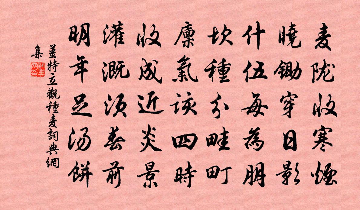 詩詞名句歷史字典書法欣賞書法字典國語詞典說文解字康熙字典古漢語字典標 題 作 者 詩 句 觀種麥作者:姜特立 朝代:宋代觀種麥原文麥隴收寒煙,曉鋤穿日影。什伍每為朋,坎種分畦町。廩氣該四時,收成近炎景。灌溉須春前,明年足湯餅。詩詞問答問:觀種麥的作者是誰?答:姜特立問:觀種麥寫於哪個朝代?答:宋代姜特立觀種麥書法欣賞觀種麥書法作品詩詞推薦至日有感二首張耒〔宋代〕兩逢至日驚身老,遠寄周南覽物悲。佳節風煙長慘慘,他鄉人物自熙熙。荊榛崤澠秦關破,草樹芳華隋苑隳。悵望講教洞高予文〔宋代〕一官羈絆混黃埃,壯抱雄懷久未開。我若有山如此好,掛冠即日賦歸來。宮詞一百首岳珂〔宋代〕奎躔五緯驗連珠,瑞紀人文啟聖符。一札鐵衣天下誦,千山黑處起金烏。定泉井高頤〔宋代〕方師鑿破天地髓,碧龍吹出冰霜寒。一泓清澄絕泥滓,萬竅號勛無波瀾。倒海翻江俱是幻,貯風留月得真觀。我來塞垣春張先〔宋代〕野樹秋聲滿。對雨壁、風燈亂。雲低翠帳,煙銷素被,簽動重幔。甚客懷、先自無消遣。更籬落、秋蟲嘆。嘆樊川句滕岑〔宋代〕老屋險不仆,寒袍半欲紪。舟中風雪五絕蘇轍〔宋代〕濁醪粗飯不成歡,白浪飛花雪作團。窗外時來一雙鴨,沉浮笑我不禁寒。南溪上種芙蓉楊萬里〔宋代〕夾水芙蓉密密栽,緣溪斜立照溪開。放教十里紅將去,不盡溪流不要回。題王瓛王圭母郭氏義節記方回〔宋代〕老儒致聘女師儒,二十言歸四十夫。令弟階庭駢兩玉,賢郎門戶儼雙珠。摽梅迨吉年雖淺,泛柏維儀志不逾。冠帔偕蹈中過書塢歸二十韻周南〔宋代〕我塢須君到,茲行說幾時。喜來衣裹少,勇出岸頭維。篙節探渠溜,燈籠上酒瓻。亂蛙嘈沮洳,警犬候笆籬。闕白題潤州鶴林寺張祜〔唐代〕古寺名僧多異時,道情虛遣俗情悲。千年鶴在市朝變,來去舊山人不知。代書寄張司封吟邵雍〔宋代〕天機時事不相差,老後□□□□□。□□□□去□□,□□□□□□□。□□□□□□□,□□□□□可嗟。唯有聞延平水沴陳宓〔宋代〕延平山水東南冠,連歲何辜致許災。積雨堤防宜有素,後時悔懊謾興哀。簡子崧時丞建德趙蕃〔宋代〕石田渡口鉦鼓鳴,憶同居民送君行。至今是邦數廉吏,君與韋陸俱其名。別來憶君已騰趠,故人無復思漁釣。豈知皇甫岳雲溪雜題五首鸕鶿堰王維〔唐代〕乍向紅蓮沒,復出清蒲颺。獨立何褵褷,銜魚古查上。和永叔思滁州幽谷韓維〔宋代〕滁陽山水翳荒榛,公為開治物物新。自作嘉名遍華榜,連題秀句入青岷。泉聲尚記岩寒夜,花思偏憐谷暖春。絕境群荷晁公溯〔宋代〕群荷醫清瀾,不受明月光。明月每下照,但見露瀼瀼。炯如翠蓋中,珠璣爛熒煌。我起欲挹之,傾瀉入方塘。六言吾首贈李相士景春劉克莊〔宋代〕眼有紫棱安用,眉無黃色何妨。自斷非封侯相,尚堪作牧牛郎。題大安池亭雍陶〔唐代〕幽島曲池相隱映,小橋虛閣半高低。好風好月無人宿,夜夜水禽船上棲。偈頌二百零五首釋正覺〔宋代〕三世諸佛不知有,忉忉怛怛揚家醜。狸奴白牯卻知有,跛跛挈挈能自守。弄鱉鼻兮憶南山,透法身兮藏北斗。風飄名句推薦最喜小兒亡賴,溪頭臥剝蓮蓬。辛棄疾《清平樂·村居》 日夕涼風至,聞蟬但益悲。孟浩然《秦中感秋寄遠上人 / 秦中寄遠上人》 君實欲民之眾而惡其寡,當蓄私不可不節。墨子《墨子·06章 辭過》 又酒趁哀弦,燈照離席。梨花榆火催寒食。周邦彥《蘭陵王·柳》 文章本天成,妙手偶得之。陸游《文章》 鄉書何處達?歸雁洛陽邊。王灣《次北固山下》 黃葉古祠寒雨積,清山荒冢白雲多。于謙《岳忠武王祠》 莫辭秉燭通霄坐,明日相思隔隴煙。王守仁《諸門人送至龍里道中二首》 居必擇鄉,游必就士。荀子《荀子·勸學》 大禹理百川,兒啼不窺家李白《公無渡河》