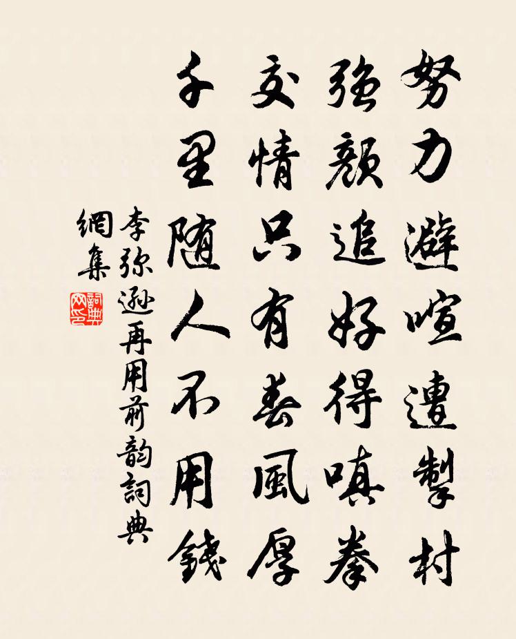 詩詞名句歷史字典書法欣賞書法字典國語詞典說文解字康熙字典古漢語字典標 題 作 者 詩 句 再用前韻作者:李彌遜 朝代:宋代再用前韻原文努力避喧遭掣村,強顏追好得嗔拳。交情只有春風厚,千里隨人不用錢。詩詞問答問:再用前韻的作者是誰?答:李彌遜問:再用前韻寫於哪個朝代?答:宋代李彌遜再用前韻書法欣賞再用前韻書法作品詩詞推薦念奴嬌辛棄疾〔宋代〕少年握槊,氣憑陵、酒聖詩豪餘事。縮手旁觀初未識,兩兩三三而已。變化須臾,鷗飛石鏡,鵲抵星橋□。搗殘秋沁園春 (原作沁春元,據丁藏精鈔本改)無謝應芳〔元代〕借問黃花,過了重陽,如何始開。為客中陶令,逢他初度,尊前杜舉,要我相陪。十日秋香,百年晚景,一笑今朝竹枝詞二首黃庭堅〔宋代〕塞上柳枝且莫歌,夔州竹枝奈愁何。虛心相待莫相誤,歲寒望君一來過。寄李子粲王冕〔元代〕白頭自笑潛夫拙,卻憶風流李謫仙。對客每言齊物論,移家只有廣文氈。赤雞白狗看兒戲,綠水青山作畫傳。慷慨送張端明赴召周必大〔宋代〕歸粟招提刻翠珉,羯胡稽首嘆名臣。今聞整轡登廊廟,應有先聲讋四隣。明道元年章獻明肅皇太后朝會十五首佚名〔宋代〕燁燁靈芝,生於殿於。照映華拱,紛敷玉蕤。感召元和,光符聖期。祥篇協吉,百福鹹宜。浣溪沙(壽程將)管鑒〔宋代〕小小梅花巧耐寒。曛曛晴日醉醒間。茶甌金縷鷓鴣斑。三壽作朋須共醉,一杯留客未應慳。酒腸如海壽如山。楊文甫主簿頃惠佳篇今赴松溪次韻送別周必大〔宋代〕投林倦翼久知還,尚客君家伯仲間。入市每嫌妨杖屨,臨岐那忍問河山。家聲好在金陵簿,人物爭看玉筍班。他日漣漪亭賞梅陸游〔宋代〕判為梅花倒玉卮,故人幽夢憶疏籬。寫真妙絕橫窗影,徹骨清寒蘸水枝。苦節雪中逢漢使,高標澤畔見湘纍。詩成已亥雜詩 178龔自珍〔清代〕兒談梵夾婢談兵,訊息都防老父驚。賴是搖鞭吟好句,流傳鄉里只詩名。晏殊奉禮歸寧楊億〔宋代〕垂髫婉變便能文,驥子蘭筋逈不羣。南國生芻人比玉,梁園修竹賦凌雲。堵牆看試三公府,反哺知乾萬乘君。賜告萍徐夤〔唐代〕為實隨流瑞色新,泛風縈草護游鱗。密行碧水澄涵月,澀滯輕橈去采蘋。比物何名腰下劍,無根堪並鏡中身。平湖贈石先生陳師道〔宋代〕多方作計老如期,百疾交攻遽得衰。晚有勝緣逢異士,生須快意闕前知。迫人鬢頷紛紛白,臨事回迂種種遲。分我西江月惠洪〔宋代〕入骨風流國色,透塵種性真香。為誰風鬢涴新妝。半樹入村春暗。雪壓枝低籬落,月高影動池塘。高情數筆寄微茫絕市無糯旋挼青穗日熬以釀戲成虞儔〔宋代〕種秫無多望歲穰,無功何日果還鄉。尚無彭澤五十畝,安得謫仙三萬場。挼穗昔聞今始見,撥醅未熟且先嘗。今年偈十六首釋行瑛〔宋代〕湛露重重灑紺園,衰殘何以報君恩。白雲堆里焚香坐,耀古騰今不二門。與兒輩泛舟游西湖一日間晴陰屢易陸游〔宋代〕逢著園林即款扉,酌泉鬻筍欲忘歸。楊花正與人爭路,鳩語還催雨點衣。古寺題名那復在,後生識面自應稀。傷心古樂府釋斯植〔宋代〕蘭死根亦香,人死不知處。人死不堪悲,蘭香化為霧。侄宰與外甥蔡駰下第東歸梅堯臣〔宋代〕事莫必有勝,必勝難可持。邇來罕相見,世上多夸馳。黃金鑄佩印,白玉刻佩龜。朝見恃赫赫,夕見同蚩蚩。方得木蘭花慢(壽)黃機〔宋代〕政胡塵滿野,問誰與、作堅城。有老子行年,平頭六十,無限聲名。向來試陳大略,便群兒、啁哳耳邊鳴。爭識規名句推薦淚彈不盡臨窗滴。就硯旋研墨。晏幾道《思遠人·紅葉黃花秋意晚》 馬影雞聲,諳盡倦郵荒館。張翥《陌上花·有懷》 鳥雀呼晴,侵曉窺檐語。周邦彥《蘇幕遮·燎沉香》 相攜及田家,童稚開荊扉。李白《下終南山過斛斯山人宿置酒》 吳酒一杯春竹葉,吳娃雙舞醉芙蓉。白居易《憶江南詞三首》 野者上,園者次。陸羽《茶經·一之源》 寺憶曾游處,橋憐再渡時。杜甫《後游》 立身不嫌家世貧賤,但能忠厚老成,所行無一毫苟且處,便為鄉黨仰望之人。王永彬《圍爐夜話·第十七則》 夫治身與治國,一理之術也。呂不韋《呂氏春秋·覽·審分覽》 五嶽尋仙不辭遠,一生好入名山游。李白《廬山謠寄盧侍御虛舟》