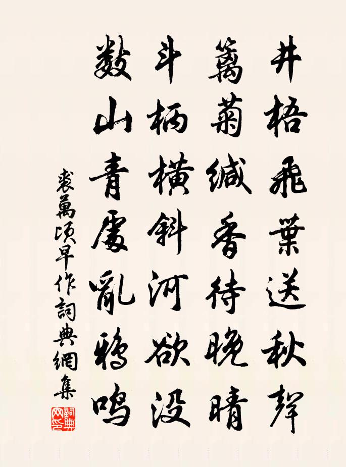 詩詞名句歷史字典書法欣賞書法字典國語詞典說文解字康熙字典古漢語字典標 題 作 者 詩 句 早作作者:裘萬頃 朝代:宋代早作原文井梧飛葉送秋聲,籬菊緘香待晚晴。斗柄橫斜河欲沒,數山青處亂鴉鳴。詩詞問答問:早作的作者是誰?答:裘萬頃問:早作寫於哪個朝代?答:宋代裘萬頃早作書法欣賞早作書法作品詩詞推薦滾繡球王實甫〔元代〕恨相見得遲,怨歸去得疾。柳絲長玉驄難系,恨不倩疏林掛住斜暉。馬兒遲遲的行,車兒快快的隨,卻告了相思回和王覺民民松軒詩王之道〔宋代〕蒼髯綠髮三四椽,茅齋高下輕且軒。清風入夜可人意,來與夫子調朱弦。連日秋陰盪殘暑,抖擻煩襟欲輕舉。簡編送洪司令赴闕吳泳〔宋代〕曾記嘉陵共艤舟,江風又是荻花秋。三年長別不一見,十事欲言還九休。頫聘交馳淮水濁,行程不定隴雲愁。鳳鳴失題二首蘇軾〔宋代〕山行似覺鳥聲殊,漸近神仙簡寂居。門外長溪容淨足,山腰苦筍耿盤蔬。喬松定有藏丹處,大石仍存拜斗余。弟子猿文同〔宋代〕岷嶺高無敵,來從第幾層。攀緣殊不倦,趫捷爾誠能。晚嘯思危石,晴懸憶古藤。王孫非汝類,只可以文憎。越中懷古魏庭堅〔宋代〕句無亭下駐驂騑,鑒水寒光照客衣。綁翠鄂君舟上去,浣紗西子網中歸。禹祠草樹空春色,秦望風煙半夕暉。王謝蓼蕭佚名〔先秦〕蓼彼蕭斯,零露湑兮。既見君子,我心寫兮。燕笑語兮,是以有譽處兮。蓼彼蕭斯,零露瀼瀼。既見君子,為龍為司馬遷秦觀〔宋代〕子長少不羈,發軔遍丘壑。晚遭李陵禍,憤悱思遠托。高辭振幽光,直筆誅隱惡。馳騁數千載,貫穿百家作。至今次楊樂道韻六首其一——後殿朝次偶題王安石〔宋代〕百年文物士優遊,萬國今方似綴旒。發策東堂招儁乂,回輿北苑罷倡優。忽隨諸彥登龍尾,尚憶當年應鵠頭。獨望歲日元稹〔唐代〕一日今年始,一年前事空。淒涼百年事,應與一年同。減字木蘭花黃庭堅〔宋代〕乍晴秋好。 * 敧烏帽。不見清談人絕倒。更憶添丁小小。蜀娘漫點花酥。酒槽空滴真珠。兄弟四人別住,他年同有傷王禹偁〔宋代〕壁上時牌催晝夜,案頭朝報見存亡。懸車又喪司空相,延閣新薨賈侍郎。陶鑄官資經化筆,品題名姓在文場。繐帷偈頌一百三十六首釋惟一〔宋代〕浴冰橋畔,伏虎岩前。雪消松杪,春到梅邊。古佛眼睛突出,瞿曇面目昭然。認著依前隔大千。摩訶池陸游〔宋代〕摩訶古池苑,一過一消魂。春水生新漲,煙蕪沒舊痕。年光走車轂,人事轉萍根。猶有宮梁燕,衛銜泥入水門。調笑/調笑令洪适〔宋代〕音樂。傳佳作。蓋海旌幢開觀閣。綺霞飛渡青油幕。好是登臨行樂。當時朝漢心傾藿。望斷長安城郭。宣州送裴坦判官往舒州時牧欲赴官歸京杜牧〔唐代〕日暖泥融雪半銷,行人芳草馬聲驕。九華山路雲遮寺,清弋江村柳拂橋。君意如鴻高的的,我心懸旆正搖搖。同來五貺詩太湖硯皮日休〔唐代〕求於花石間,怪狀乃天然。中瑩五寸劍,外差千疊蓮。月融還似洗,雲濕便堪研。寄與先生後,應添內外篇。贈衡陽簿林士愷趙汝騰〔宋代〕吾黨仲容,行修能通。而志卓然,以慕直躬。嘗儕扣閽,力摧奸鋒。上旌其言,擢第南官。府庠諸生,坐斥匆匆。清心鏡 予在終南,居於環堵,颵腿赤腳,並馬鈺〔元代〕信步雲遊,西至華亭投宿於窯崆。偶中土津火毒,吐血發嗽,病勢來之甚緊。眾道友饋藥,拜而受之,不敢嘗。又思故人邵雍〔宋代〕芳酒一樽雖甚滿,故人千里奈思何。柳挼池閣條偏細,花近檐楹香更多。名句推薦辛勤好似蠶成繭,繭老成絲蠶命休。馮夢龍《醒世恆言·卷三十五》 黃河曲里沙為岸,白馬津邊柳向城。高適《夜別韋司士》 痛飲狂歌空度日,飛揚跋扈為誰雄。杜甫《贈李白》 驚鳥去無際,寒蛩鳴我傍。馬戴《楚江懷古三首》 暗昧處見光明世界,此心即白日青天。王永彬《圍爐夜話·第七八則》 龍噓氣成雲,雲固弗靈於龍也。韓愈《雜說一·龍說》 渡江天馬南來,幾人真是經綸手。辛棄疾《水龍吟·甲辰歲壽韓南澗尚書》 春未綠,鬢先絲。人間別久不成悲。姜夔《鷓鴣天·元夕有所夢》 幾多情,無處說,落花飛絮清明節。魏承班《漁歌子·柳如眉》 但箭雁沈邊,梁燕無主。劉辰翁《蘭陵王·丙子送春》