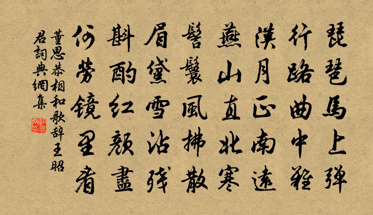 詩詞名句歷史字典書法欣賞書法字典國語詞典說文解字康熙字典古漢語字典標 題 作 者 詩 句 相和歌辭·王昭君作者:董思恭 朝代:唐代相和歌辭·王昭君原文琵琶馬上彈,行路曲中難。漢月正南遠,燕山直北寒。髻鬟風拂散,眉黛雪沾殘。斟酌紅顏盡,何勞鏡里看。詩詞問答問:相和歌辭·王昭君的作者是誰?答:董思恭問:相和歌辭·王昭君寫於哪個朝代?答:唐代問:相和歌辭·王昭君是什麼體裁?答:樂府董思恭相和歌辭·王昭君書法欣賞相和歌辭·王昭君書法作品注釋全唐詩:卷19_46詩詞推薦村居(四首選二)王冕〔元代〕其 一英雄在何處?氣概屬山家。蟻布出入陣,蜂排早晚衙;野花團部伍,溪村擁旗牙。抱膝長吟罷,天邊日又斜與伯順飯於文緯大光出宋漢傑畫秋山陳與義〔宋代〕焚香消午睡,開畫逢秋山。皇都馬聲中,有此四士閒。離離南國樹,閃閃湘水灣。悠悠孤鳥去,澹澹晨輝還。屐士旅悶十首方回〔宋代〕彼姝復此粲,人面外堪看。鸚鵡雖能語,芙蓉豈耐寒。舌酣元可畏,背毀更多端。昵昵徒為耳,雲龍許控摶。道傍田家司馬光〔宋代〕道傍田家翁嫗俱垂白,敗屋蕭條無壯息。翁攜鎌索嫗攜箕,自向薄田收黍稷。靜夜偷舂辟債家,比明門外已如麻。詠史下蜀先主陳普〔宋代〕如流歲月幾沾襟,侍立霜嚴劇苦心。說與劉璋無怨怒,有人驅虎入山林。簇水趙長卿〔宋代〕長憶當初,是他見我心先有。一鉤才下,便引得魚兒開口。好是重門深院,寂寞黃昏後。廝覷著、一面兒酒。試撋花雨亭釋智愚〔宋代〕昔人曾此談空有,花雨紛紛繞座寒。堪笑空生無伎兩,不曾開口被人瞞。城西二首韓維〔宋代〕西城馳道直如弦,百頃晴波御柳邊。韶樂鏗轟羅帳殿,春旗偃蹇近樓船。曲江未賜唐家燕,靈沼空思鎬邑篇。幾日次韻郭明叔長歌黃庭堅〔宋代〕君不見懸車劉屯田,騎牛澗壑弄潺湲。八十唇紅眼點漆,金鍾舉酒不留殘。君不見征西徐尚書,為國捐軀矢石間。送弟禹臣赴官江南梅堯臣〔宋代〕昔與子同歸,夜向瓜洲泊。持杯月正清,遄水平如削。爾來蘆岸深,須防虎潛搏。行行無朋友,遇事自斟酌。酒藥陸游〔宋代〕愁憑酒破除,病藉藥枝梧。焦革死已久,宋清今亦無。幽情寄魚鳥,小艇雜菰蒲。海上秋風早,懸知肺渴蘇。冬日寄洛中楊少尹馬戴〔唐代〕黃河岸柳衰,城下度流澌。年長從公懶,天寒入府遲。家山望幾遍,魏闕赴何時。懷古心誰識,應多謁舜祠。再和十首蘇轍〔宋代〕養生尤復要功圓,溜滴南溪石自穿。近見牢山陳道士,微言約我更三年。秋日野步和王覺民十六首王之道〔宋代〕雨晴庭戶生秋意,潮落溪橋見水痕。稻熟人家得相向,兵余眼底兩三村。寄僧尚顏裴說〔唐代〕曾居五老峰,所得共誰同。才大天全與,吟精楚欲空。客來庭減日,鳥過竹生風。早晚搖輕拂,重歸瀑布中。和汪正夫梅鄭獬〔宋代〕好花賦與本天才,料得靈根天上來。應為長安惡風土,故教北地不栽梅。送蕭德起赴召鄭剛中〔宋代〕□□□□□,□□□中原。人駿涉沙漠,春風移十年。壯士磨寶劍,怒氣常裂肝。荊湘跨閩浙,米貴仍無錢。徵求布袋贊釋普度〔宋代〕兜率內宮不肯住,杖挑布袋紅塵去。不知開口笑何人,待你下生人笑你。阿呵呵,寬著肚皮等著他。感發落白居易〔唐代〕昔日愁頭白,誰知未白衰。眼看應落盡,無可變成絲。夜杜甫〔唐代〕絕岸風威動,寒房燭影微。嶺猿霜外宿,江鳥夜深飛。獨坐親雄劍,哀歌嘆短衣。煙塵繞閶闔,白首壯心違。名句推薦離多最是,東西流水,終解兩相逢。晏幾道《少年游·離多最是》 寒禽與衰草,處處伴愁顏。司空曙《賊平後送人北歸》 烽火平安夜,歸夢到家山。崔與之《水調歌頭·題劍閣》 一曲高歌一樽酒,一人獨釣一江秋。王士禎《題秋江獨釣圖》 天時懟兮威靈怒,嚴殺盡兮棄原野。屈原《國殤》 雨後寒輕,風前香軟,春在梨花。仲殊《柳梢青·吳中》 二月湖水清,家家春鳥鳴。孟浩然《春中喜王九相尋 / 晚春》 起望衣冠神州路,白日銷殘戰骨。辛棄疾《賀新郎·用前韻送杜叔高》 大堤欲上誰相伴,馬踏春泥半是花。竇鞏《襄陽寒食寄宇文籍》 商人重利輕別離,前月浮梁買茶去。白居易《琵琶行 / 琵琶引》