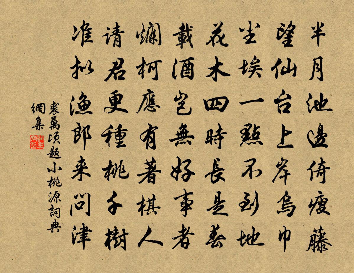 詩詞名句歷史字典書法欣賞書法字典國語詞典說文解字康熙字典古漢語字典標 題 作 者 詩 句 題小桃源作者:裘萬頃 朝代:宋代題小桃源原文半月池邊倚瘦藤,望仙台上岸烏巾。塵埃一點不到地,花木四時長是春。載酒豈無好事者,爛柯應有著棋人。請君更種桃千樹,準擬漁郎來問津。詩詞問答問:題小桃源的作者是誰?答:裘萬頃問:題小桃源寫於哪個朝代?答:宋代裘萬頃題小桃源書法欣賞題小桃源書法作品詩詞推薦雜曲歌辭。行路難翁綬〔唐代〕行路艱難不復歌,故人榮達我蹉跎。雙輪晚上銅梁雪,一葉春浮瘴海波。自古要津皆若此,方今失路欲如何。君看點絳唇·時霎清明吳文英〔宋代〕時霎清明,載花不過西園路。 * 綠樹。正是春留處。燕子重來,往事東流去。征衫貯。舊寒一縷。淚濕風簾絮。大酺(春陰懷舊)周密〔宋代〕又子規啼,荼蘼謝,寂寂春陰池閣。羅窗人病酒,奈牡丹初放,晚風還惡。燕燕歸遲,鶯鶯聲懶,閒罥鞦韆紅索。袁家渴泊舟樂雷發〔宋代〕姜夔劉過竟何為,空向江湖老布衣。造物忌名從古有,詩人得位似君稀。聖朝自要求參術,吾道何應賤蕨薇。晚節留別陳明叔兼屬胡仲威五首趙蕃〔宋代〕我去孰君友,君留誰我游。定應緣宿契,不待分今投。年事鬢俱白,時名詩獨優。未知茲日別,重見又何由。句降黃龍舞洪适〔宋代〕鹹駐目於垂螺,將應聲而曳繭。豈無本事,願吐妍辭。答眄流席上,發水調於歌唇;色授裾邊,屬河東之才子。未觀稼楊萬里〔宋代〕井字行都整,花香遠已甜。穗肥黃俯首,芒勁紫掀髯。風攪平雲陣,聲松缺月鎌。不愁禾把減,高廉卻愁添。自詒釋祖先〔宋代〕宴坐白雲里,經行碧嶂中。遊人窮不到,幽鳥自匆匆。次韻和王鞏六首蘇軾〔宋代〕少年帶刀劍,但識從軍樂。老大服犁鋤,解佩付熔鑠。雖無獻捷功,會賜力田爵。敲冰春搗紙,刈葦秋織箔。櫟林和楊公維二首廖行之〔宋代〕楊侯胸中萬卷書,瀾翻騷興輒三閭。文成素藁富柱腹,詞有餘鋒須賈予。俊逸誰追新軌轍,溫純端擬古璠璵。我漸挽鄭甥主學二首劉克莊〔宋代〕北轍心猶銳,南廊策不遷。美芹干將相,采藻淑生徒。賦鵩方強仕,聞雞漫壯圖。未應精爽盡,丹穴有雙雛。雜記十首劉克莊〔宋代〕相國私英倩,將軍嬖子都。可憐洛陽令,只問主家奴。過魯墟先太傅舊隱陸游〔宋代〕桑竹蕭條帶夕陽,故居依約古河傍。頹垣壤甃伙尋處,父老猶言學士莊。山居詩釋延壽〔宋代〕息業怡神道最孤,藏名匿跡合良圖。冥心難使龍神見,出語須教海岳枯。雲駐庵前疑有意,鳥鳴庭際似相呼。資持歡喜吟邵雍〔宋代〕歡喜又歡喜,喜歡更喜歡。吉士為我友,好景為我觀。美酒為我飲,美食為我餐。此身生長老,盡在太平間。南堂五首蘇軾〔宋代〕他時夜雨困移床,坐厭愁聲點客腸。一聽南堂新瓦響,似聞東塢小荷香。次韻春日即事六首洪皓〔宋代〕如膏細雨沐輕紅,更有催花少女風。薄暮濃雲橫漢外,西山數點有無中。次韻元肅兄三題汴渠夜泛鄭獬〔宋代〕汴渠夜泛亦快意,月射長波如斷冰。不見湘靈揮寶瑟,空教水怪避犀燈。煙雲疊影相虧蔽,星斗翻芒互降升。好蓄次姜君玉韻且駕北固新居劉宰〔宋代〕車來流水馬如龍,北上精藍西復東。雅意只貧山在近,高標誰與子相同。門開正好來三益,文就何妨送五窮。擬向以椰子香爐花瓶為大人壽項安世〔宋代〕石湖居士虞衡志,椰子之身本棕類。葉間各結三四子,大者能容五升器。初如青纈美少年,漸久漸黃堅且緻。有穰名句推薦想牧之、千載尚神遊,空山冷。吳潛《滿江紅·齊山繡春台》 令之有漸,軌之有度,寵之有節房玄齡《晉書·列傳·第六十二章》 幽微靈秀地,無可奈何天。曹雪芹《紅樓夢·第五回》 春色邊城動,客思故鄉來。何遜《邊城思》 美人梳洗時,滿頭間珠翠。鄭遨《富貴曲》 砌下落花風起,羅衣特地春寒。馮延巳《清平樂·雨晴煙晚》 我來圯橋上,懷古欽英風。李白《經下邳圯橋懷張子房》 帝里重清明,人心自愁思。孟浩然《清明即事》 龍噓氣成雲,雲固弗靈於龍也。韓愈《雜說一·龍說》 人傷則離散,農傷則國貧。李大師、李延壽《南史·列傳·卷三十九》