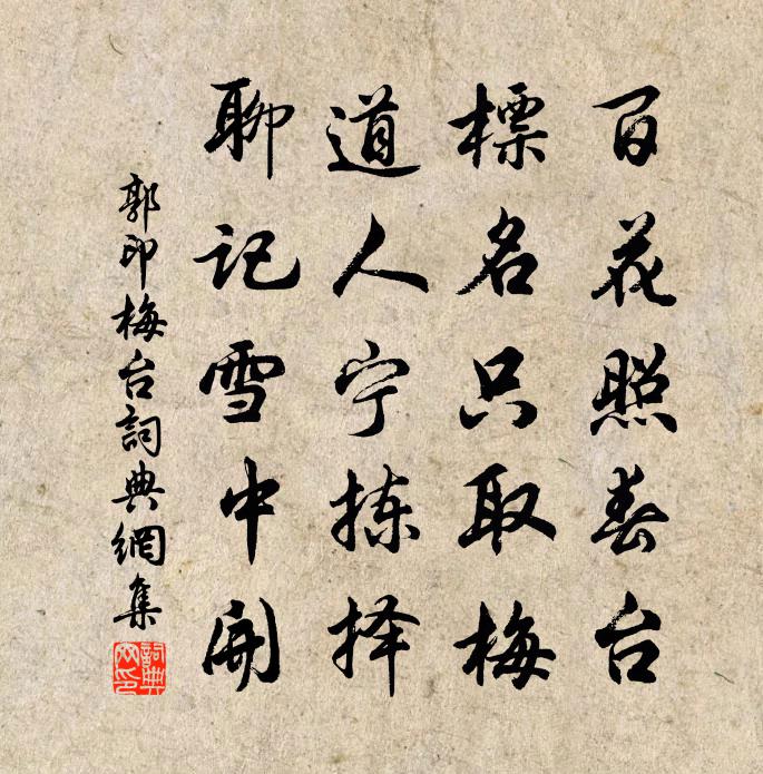 詩詞名句歷史字典書法欣賞書法字典國語詞典說文解字康熙字典古漢語字典標 題 作 者 詩 句 梅台作者:郭印 朝代:宋代梅台原文百花照春台,標名只取梅。道人寧揀擇,聊記雪中開。詩詞問答問:梅台的作者是誰?答:郭印問:梅台寫於哪個朝代?答:宋代郭印梅台書法欣賞梅台書法作品詩詞推薦開梅山晁補之〔宋代〕開梅山,梅山開自熙寧之五年。其初連峰上參天,巒崖盤嶮閡群蠻。南北之帝鑿混元,此山不圯藏雲煙。躋攀鳥道還余朝綱雜編陳棣〔宋代〕胸中渾渾乏新奇,虛辱熊羆百萬師。較藝昔嘗窮五技,還書今復墮三痴。退飛頗愧一為甚,盡銳那知再愈衰。自計左右生題名李石〔宋代〕蜀地雖遠天之涯,蜀人只隔一水巴。自從文翁建此學,此俗化為齊魯家。泮林春風桑椹熟,集鼓坎坎聞晨撾。諸生弟茝家醉中趁筆陳著〔宋代〕前山屏開照檐綠,後山如坐膝抱屋。數畝山園半畝池,松影參差庇梅竹。九月九日天氣清,銀白金黃百種菊。詩人頌古釋雲〔宋代〕大隱居鄽,小隱居山。各得其所,隨分安閒。織素謠於濆〔唐代〕貧女苦筋力,繰絲夜夜織。萬梭為一素,世重韓娥色。五侯初買笑,建章方落籍。一曲古涼州,六親長血食。勸爾送邢芻甫入閩陸游〔宋代〕兩窮相值每相憐,聞子南遊一愴然。莫道此行非久別,衰翁何敢望明年!次韻程堯仲風雨詩項安世〔宋代〕浩浩陰風徹屋號,霏霏寒雨一天毛。撼醒花柳經年眼,潤透郊原百尺膏。鼓舞孰知神物妙,沾濡方表化工勞。遊人濠州水館張祜〔唐代〕高閣去煩燠,客心遂安舒。清流中浴鳥,白石下游魚。秋樹色凋翠,夜橋聲裊虛。南軒更何待,坐見玉蟾蜍。於中好·別緒如絲夢不成納蘭性德〔清代〕別緒如絲夢不成,那堪孤枕夢邊城。因聽紫塞三更雨,卻憶紅樓半夜燈。書鄭重,恨分明,天將愁味釀多情。起來絕句六十四首張伯端〔宋代〕赤龍黑虎各西東,四象交加戊己中。復姤自茲能運用,金丹誰道不成功。次韻張當進題神君廟李石〔宋代〕桂楫方東泛,荷衣已出塵。曲江尋相業,猶是姓張人。少微樓方岳〔宋代〕不奈梅花爾許愁,天寒孤倚夕陽樓。近城鷗鷺逢人慣,肯與漁蓑共釣舟。湖州歌九十八首 其八十二汪元量〔宋代〕金屋妝成物色新,三宮日用御廚珍。其餘宮女千餘個,分嫁幽州老斲輸。同臨漳紀明府孤雁盧照鄰〔唐代〕三秋違北雁。萬里向南翔。河洲花稍白,關塞葉初黃。避繳風霜勁,懷書道路長。水流疑箭動,月照似弓傷。橫夭送許耀卿監丞同年赴靜江倅四絕范成大〔宋代〕官塗真有上竿魚,玉筍翻乘別駕車。聞道留行有公論,從今日日看除書。次韻叔孝郎中送游黃山見一老之作二首李彌遜〔宋代〕居士逢場了世終,卻尋機語凋天然。我來不問三三句,乘覓康壺炷暖泉。皇帝閣春帖子趙湘〔唐代〕迎氣來歸祚,宜春祝降祥。皇心勤治切,應喜寸陰長。生查子洪适〔宋代〕四月到盤洲,長是黃梅雨。屐齒滿莓苔,避濕開新路。極望綠陰成,不見烏飛處。雲采列奇峰,絕勝看廬阜。偈頌三十八首釋如淨〔宋代〕一番雨,一番風,風雨湖山圖書中。風搖水色瑠璃滑,雨潑山光翡翠濃。咄,杜鵑啼血滴花紅。名句推薦只要你見性志誠,念念回首處,即是靈山。吳承恩《西遊記·第二十四回》 綠楊芳草長亭路。年少拋人容易去。晏殊《玉樓春·春恨》 君行逾十年,孤妾常獨棲。曹植《明月上高樓》 黃葉覆溪橋,荒村唯古木。柳宗元《秋曉行南谷經荒村》 所謂伊人,在水一方。佚名《蒹葭》 孤舟向廣武,一鳥歸成皋。岑參《鞏北秋興寄崔明允》 不知則問,不能則學,雖能必讓,然後為德。荀子《荀子·非十二子》 夸而有節,飾而不誣劉勰《文心雕龍·誇飾》 女蘿發馨香,菟絲斷人腸。李白《古意》 相思休問定何如。情知春去後,管得落花無。晁沖之《臨江仙·憶昔西池池上飲》
