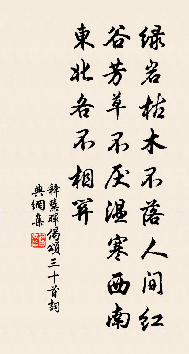 詩詞名句歷史字典書法欣賞書法字典國語詞典說文解字康熙字典古漢語字典標 題 作 者 詩 句 偈頌三十首作者:釋慧暉 朝代:宋代偈頌三十首原文綠岩枯木,不落人間。紅谷芳草,不厭溫寒。西南東北,各不相關。詩詞問答問:偈頌三十首的作者是誰?答:釋慧暉問:偈頌三十首寫於哪個朝代?答:宋代釋慧暉偈頌三十首書法欣賞偈頌三十首書法作品詩詞推薦菩薩蠻曹勛〔宋代〕蕭蕭還是秋容暮。爐薰已冷氳香注。猶記踏香塵。東風滿院春。冷煙迷望處。聲斷闌乾雨。無計問行雲。黃昏空掩次韻羅偉正寺丞見遺之什李彌遜〔宋代〕鵰鶚逢秋已恨遲,公才如此尚誰羈。江城樽俎未三月,世路干戈方百為。去馬便如千里別,斷葭已作十分披。它年臨水亭施肩吾〔唐代〕只怪素亭黏黛色,溪煙為我染莓苔。欲知源上春風起,看取桃花逐水來。聞王員外新恩有寄齊己〔唐代〕欲退無因貴逼來,少儀官美右丞才。青袍早許淹花幕,霜簡方聞謝柏台。金諾靜宜資講誦,玉山寒稱奉尊罍。西峰春情四首高翥〔宋代〕深院沈沈照落暉,寶香熏徹舊時衣。一春行樂誰為伴,羞見花前蛺蝶飛。道過京師二首曹勛〔宋代〕離離禾黍滿東郊,秋入鴉聲處處嬌。敗壁斷垣成悵望,一鞭又過懊來橋。訪銛朴翁不遇二首高翥〔宋代〕亂花飛絮趁長髯,來訪西湖竹裹庵。行盡白雲三十里,詩人又在白雲南。掃除小園未竟歸臥陸游〔宋代〕竹葉掃仍落,莎根鋤更生。陰陽常代謝,今昔各施行。勳業須時至,衰榮忌力爭。徑歸差省事,高枕聽蟬聲。十用喜雨韻三首吳潛〔宋代〕喜極夫何恨不禁,五更霜角夜聲沈。滴殘塞北征夫淚,點碎江南遊子心。久客情懷愁似織,休官時候夢非簪。寶陀橫浦十詠周程三先生書院劉黻〔宋代〕千載斯文冷,先生以道鳴。山川師友趣,日月弟兄情。門靜一松在,源深雙浦橫。兒童游里巷,猶喜說周程。口占洪咨夔〔宋代〕秋風已颯梧猶碧,宿雨才收稗亦花。天著工夫供醉眼,東鄰有酒不堪賒。暮坐中庭楊萬里〔宋代〕蚊子因涼減,蟬聲入暮多。有愁無處著,不飲欲如何。登師姑岩見城中大閱恍如陣蟻因思舊從戎吏亦蒲壽宬〔宋代〕晨起捫層巔,蒼茫見塵市。鼙鼓生遠陴,壺蠭在幽耳。遙知細柳屯,於時閱軍士。俯彼萬鎧群,微哉一窖蟻。初集次韻陳履常張公龍潭蘇軾〔宋代〕經明宣城宰,家此百尺瀾。鄭翁不量力,敢以非意乾。玄黃雜兩戰,絳青表雙蟠。(事見《龍公碑》。)烈氣斃強泛舟登弁山祥應宮之絕頂望太湖窺黃龍洞過倪程公許〔宋代〕苹浪蹴帆移別浦,筍輿邀我度遙岑。雲開辰澤水銀溢,風掠洞庭螺翠深。神井千尋龍起蟄,幽岩四面石成林。蘇仙雜劇·鯁直張千替殺妻佚名〔元代〕楔子(外一折雲了)(正末扮張千上,開)小人是屠家張千的便是。家貧親老,不多近遠有個員外,待要結義小人書後湖集趙蕃〔宋代〕我懷蘇養直,不作漢三公。隱墅人安在,春溪草自豐。遺文尚亡恙,斯道未應窮。會與吾尊友,青燈話此翁。戚氏蘇軾〔宋代〕 * 山。東皇靈媲統群仙。絳闕岧嶢,翠房深迥,倚霏煙。幽閒。志蕭然。金城千里鎖嬋娟。當時穆滿巡狩。翠華送人宰永泰方乾〔唐代〕北人雖泛南流水,稱意南行莫恨賒。道路先經毛竹嶺,風煙漸近刺桐花。舟停漁浦猶為客,縣入樵溪似到家。下馬少年行三首·其三李白〔唐代〕君不見淮南少年遊俠客,白日球獵夜擁擲。呼盧百萬終不惜,報仇千里如咫尺。少年遊俠好經過,渾身裝束皆綺羅名句推薦盧家少婦鬱金堂,海燕雙棲玳瑁梁。沈佺期《古意呈補闕喬知之 / 古意 / 獨不見》 笑綠鬟鄰女,倚窗猶唱,夕陽西下。蔣捷《女冠子·元夕》 富貴必從勤苦得,男兒須讀五車書。杜甫《柏學士茅屋》 月有盈虧花有開謝,想人生最苦離別。張鳴善《普天樂·詠世》 休別有魚處,莫戀淺灘頭。佚名《增廣賢文·上集》 與君別。相思一夜梅花發。房舜卿《憶秦娥·與君別》 白髮悲花落,青雲羨鳥飛。岑參《寄左省杜拾遺》 人有短,切莫揭。人有私,切莫說。李毓秀《弟子規·泛愛眾》 登高望蓬流,想像金銀台。李白《游泰山六首》 安而不忘危,存而不忘亡,治而不忘亂佚名《易傳·繫辭傳下·第五章》