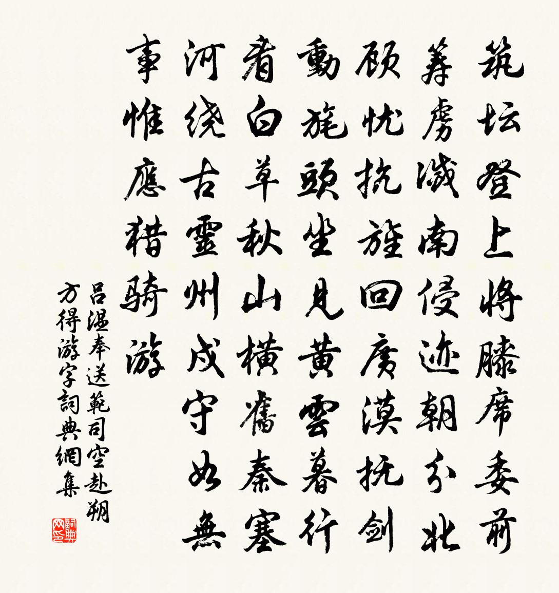 詩詞名句歷史字典書法欣賞書法字典國語詞典說文解字康熙字典古漢語字典標 題 作 者 詩 句 奉送范司空赴朔方(得游字)作者:呂溫 朝代:唐代原文築壇登上將,膝席委前籌。虜滅南侵跡,朝分北顧憂。抗旌回廣漠,撫劍動旄頭。坐見黃雲暮,行看白草秋。山橫舊秦塞,河繞古靈州。戍守如無事,惟應獵騎游。詩詞問答問:《奉送范司空赴朔方(得游字)》的作者是誰?答:呂溫問:該詩寫於哪個朝代?答:唐代問:該詩是什麼體裁?答:五排書法欣賞奉送范司空赴朔方(得游字)書法作品注釋全唐詩:卷371-18詩詞推薦黃宰致江西詩雙井茶方岳〔宋代〕黃侯授我以江西詩禪之宗派,瀹我以雙井老仙之雪香。磚爐春著兔毫玉,石鼎月翻魚眼湯。夜窗搜攪十年讀,候蟲送歐陽辯監澶州酒蘇軾〔宋代〕汗血駕鼓車,何從致千里。紛紛糟曲間,欲試賢公子。君家江南英,濯足滄浪水。卻渡舊黃河,漲沙埋馬耳。由來凝雲堂詩次文賀州韻劉子翬〔宋代〕君家遙借我家山,我亦時來一笑看。縹緲雲扶千疊秀,空濛翠滴兩州寒。已將老目供秋晚,未覺豪心怯酒闌。文伯西湖競渡遊人有蹂踐之厄高斯得〔宋代〕杭州城西二月八,湖上處處笙歌發。行都士女出如雲,驊騮塞路車聯轄。龍舟競渡數千艘,紅旗綠棹紛相戛。有似經費征君舊居齊己〔唐代〕高眠當新地,雲鳥未為孤。天子征不起,閒人親得無。猿猱狂欲墜,水石怪難圖。寂寞荒齋外,松杉相倚枯。對雪有寄宋庠〔宋代〕芳歷崢嶸歲,平台沆漭天。初驚飛礫集,坐覺雨花妍。未夜珠還乘,非春玉作田。何嘗甘絮後,正是占梅前。亂影雜興張鎡〔宋代〕山川萬代留,人物有時盡。慷慨羊叔子,登臨重嗟憫。功名垂橐來,老去載倉囷。焉有利在民,轉盼聲即泯。非真【越調】柳營曲 范蠡佚名〔元代〕一葉舟,五湖游,鬧垓垓不如歸去休。紅蓼灘頭,白鷺沙鷗,正值著明月洞庭秋。進西施一捻風流,起吳越兩處冤頌古四首釋祖欽〔宋代〕九九八十一,窮漢受罪畢。才擬展腳眠,蚊蟲獦蚤出。龍母廟范成大〔宋代〕孝龍分職隸湘西,天許寧親歲一歸。風雹春春損桃李,山中寒食尚冬衣。次韻程正輔游碧落洞蘇軾〔宋代〕空山不難到,絕境未易名。何時謫仙人,來作鈞天聲。胸中幾雲夢,餘地方恢宏。長庚與北斗,錯落綴冠纓。黃公病中口占舒邦佐〔宋代〕拂枕投床鼻息鳴,鄰雞報午夢還驚。一春已過半春了,十日曾無五日晴。喚客難同藉草飲,隔牆虛認賣花聲。十年冬日小齋即事仇遠〔宋代〕蘆葦周遭舊楮糊,就中穴地砌磚爐。儒酸官冷渾相稱,草臥氈眠本不拘。窗外十分西日照,簾間半點北風無。一瓶秋懷三十六首邵雍〔宋代〕九月氣乍肅,衰柳猶有蟬。霜外疏鍾斷,風余清籟傳。千山亂遠月,一鶚摩高天。自非出世人,而敢危行言。用宇文龍圖韻贈龍華印老李流謙〔宋代〕少年一口吸西江,聖處端能走季鹹。淨觀清冷橫一水,遠懷孤秀揖千岩。溪雲臥久看頻度,山日談余訝半銜。便欲北窗閒坐白居易〔唐代〕虛窗兩叢竹,靜室一爐香。門外紅塵合,城中白日忙。無煩尋道士,不要學仙方。自有延年術,心閒歲月長。箕斗歌楊維楨〔元代〕計孛怯檮杌,紫木背文章。我迕一宿直箕斗,不愁斟酌愁簸揚。斗之柄,實司天;箕之風,由犯月。箕胡為,張口貽九華上人齊己〔唐代〕一法傳聞繼老能,九華閒臥最高層。秋鍾盡後殘陽暝,門掩松邊雨夜燈。食黍行王安石〔宋代〕周公兄弟相殺戮,李斯父子夷三族。富貴常多患禍嬰,貧賤亦復難為情。身隨衣食南與北,至親安能常在側。謂言會昌小峴亭有碑侍郎陸公作也今通守蓋公之孫曾豐〔宋代〕小峴豐碑大陸書,摩挲蠆尾掃龜趺。機雲宗派公家是,晉宋文章此外無。方被春牽時夢草,豈為秋動輒思鱸。行藏名句推薦松花釀酒,春水煎茶。張可久《人月圓·山中書事》 草螢有耀終非火,荷露雖團豈是珠。白居易《放言五首·其一》 小憐初上琵琶,曉來思繞天涯。王安國《清平樂·春晚》 落日無情最有情,遍催萬樹暮蟬鳴。楊萬里《初秋行圃》 去年五月黃梅雨,曾典袈裟糴米歸。與恭《思母》 百囀無人能解,因風飛過薔薇。黃庭堅《清平樂·春歸何處》 仁之實,事親是也;義之實,從兄是也。孟子《孟子·離婁章句上·第二十七節》 兵強勝人,人強勝天佚名《逸周書·卷三·文傳解》 日暮蒼山遠,天寒白屋貧。劉長卿《逢雪宿芙蓉山主人》 蘇小門前柳萬條,毿毿金線拂平橋。溫庭筠《楊柳八首·其三》