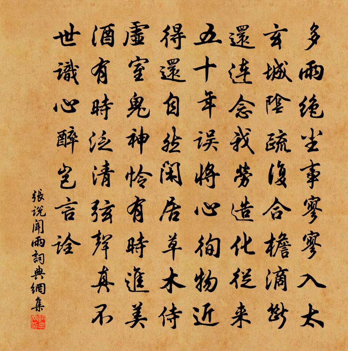 詩詞名句歷史字典書法欣賞書法字典國語詞典說文解字康熙字典古漢語字典標 題 作 者 詩 句 聞雨作者:張說 朝代:唐代聞雨原文多雨絕塵事,寥寥入太玄。城陰疏複合,檐滴斷還連。念我勞造化,從來五十年。誤將心徇物,近得還自然。閒居草木侍,虛室鬼神憐。有時進美酒,有時泛清弦。聲真不世識,心醉豈言詮。詩詞問答問:聞雨的作者是誰?答:張說問:聞雨寫於哪個朝代?答:唐代問:聞雨是什麼體裁?答:五排張說聞雨書法欣賞聞雨書法作品注釋全唐詩:卷86_53詩詞推薦題族弟道卿貧樂齋楊萬里〔宋代〕雪茹冰餐入骨香,帽欹驢瘦盡詩狂。人傳幼婦皆稱絕,鬼笑家兄不姓方。細雨寒燈初夢短,斷絲枯木一聲長。上天寓嘆陸游〔宋代〕眼底誰為耐久朋,倚肩按膝一烏藤。虛名但可欺橫目,薄俗何時復結繩?浮世百年悲冉冉,閒身萬事付騰騰。年來永州守王公慥寄九岩亭記雲此地疑是柳子厚所梅堯臣〔宋代〕天地磨今古,賢愚為埃塵。草樹易變改,山川無故新。眷言零陵守,白髮駕朱輪。間來問遺老,俯跡哀昔人。昔人深春許渾〔唐代〕故里千帆外,深春一雁飛。乾名頻慟哭,將老欲何歸。未谷拋還憶,交親晚更稀。空持望鄉淚,沾灑寄來衣。窺開吟邵雍〔宋代〕物理窺開後,人情照破時。正如攜寶劍,切玉過如泥。送韓侍御之廣德李白〔唐代〕昔日繡衣何足榮,今宵貰酒與君傾。暫就東山賒月色,酣歌一夜送泉明。滿江紅張孝祥〔宋代〕秋滿漓源,瘴雲淨、曉山如簇。動遠思、空江小艇,高丘喬木。策策西風雙鬢底,暉暉斜日朱欄曲。試側身、回首壽五一弟四首廖行之〔宋代〕哲命天年本自貽,若為五福具期頤。義方端是長生藥,安用金丹與玉芝。八聲甘州(壬子餞帥機沈好問)李曾伯〔宋代〕正蓴鱸佳夢繞吳鄉,牙檣忍輕離。向仲宣樓上,憑高舉酒,幾共燈棋。曾記少陵留詠,出幕合持麾。飛蓋長安去,金神夜獵圖二首姜夔〔宋代〕夜半金神羽獵,奔走山川百靈。雲氣旌旗來下,颯然已入青冥。句李拱〔宋代〕琴彈終日得古調,印鎖經秋帶蘚痕。送龐簽判王安石〔宋代〕北都兩去不辭勤,仕路論材況出群。一相關藩嘗負弩,三年通籍更從軍。清談猶得當時事,遺愛應從此日聞。我憶又贈筠仙一幅曾國藩〔清代〕人生有乖隔,咫尺成關山。我心田百轉,從來輸石頑。日吞語戴侯,君在張李間。為君畫新竹,幽淡不容攀。我家人之初王應麟〔宋代〕人之初,性本善。性相近,習相遠。苟不教,性乃遷。教之道,貴以專。子不學,非所宜。幼不學,老何為。玉不奉和竟陵王經劉瓛墓詩沈約〔南北朝〕表閭欽逸軌。軾墓禮真魂。化塗終眇默。神理曖猶存。塵經未輟幌。高衡已委門。日蕪子云舍。徒望董生園。華陰走筆和曾無逸掌故約觀玉照堂梅詩六首張鎡〔宋代〕才晴便是看花時,自看何如與客期。亦有數篇花下句,苦無風味怕人知。春晴二首郭印〔宋代〕二月垂楊長綠柯,漁村春塢景融和。沙邊細浪搖芳藻,水上紅雲映綠波。風裊釣絲時蕩漾,日移花影更婆娑。徑須寶相花董嗣杲〔宋代〕誰趲珍芳態度呈,風香露色謾敷榮。縱矜百媚留春色,難壓群花殿晚名。暗綠園林黃鳥靜,嫣紅籬落粉機明。禁持嘉泰昭陽大淵獻築室董孝君祠之西下有湖焉某楊簡〔宋代〕惜也天然一段奇,如何萬古罕人知。只今山色連深翠,孔子明言是孝慈。新月二首袁燮〔宋代〕至精那得久沈淪,造化迴環自有神。滿意只須三五夜,十分全體見天真。名句推薦無端和淚拭胭脂,惹教雙翅垂張泌《蝴蝶兒·蝴蝶兒》 白日放歌須縱酒,青春作伴好還鄉。杜甫《聞官軍收河南河北》 春田龜坼苗不滋,猶賴立春三日雪。王士禎《春不雨》 紅橋路,正一派、畫船蕭鼓中流住。納蘭性德《摸魚兒·午日雨眺》 黃塵清水三山下,更變千年如走馬。李賀《夢天》 對此懷素心,千里共明月德隱《新秋晚眺》 公乎躍馬揚玉鞭,滅沒高蹄日千里。溫庭筠《拂舞詞 / 公無渡河》 道不遠人。人之為道而遠人,不可以為道。子思《中庸·第十三章》 天行有常,不為堯存,不為桀亡。荀子《荀子·天論》 丈夫不能再辱。班固《漢書·傳·李廣蘇建傳》