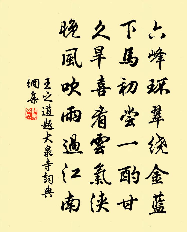 詩詞名句歷史字典書法欣賞書法字典國語詞典說文解字康熙字典古漢語字典標 題 作 者 詩 句 題大泉寺作者:王之道 朝代:宋代題大泉寺原文六峰環翠繞金藍,下馬初嘗一酌甘。久旱喜看雲氣浹,晚風吹雨過江南。詩詞問答問:題大泉寺的作者是誰?答:王之道問:題大泉寺寫於哪個朝代?答:宋代王之道題大泉寺書法欣賞題大泉寺書法作品詩詞推薦飛仙吟送張道士白玉蟾〔宋代〕夜騎玉鰲採明月,蘂殿瑤台寒徹骨。三十六天不閉門,風吹琪花散飛雪。簫韶鳴處隊仗多,八萬霓裳歌一闋。紫皇與謬栓法同行口占分水嶺詩駱羅憲〔宋代〕勉強驅馳力不堪,筍車肱曲睡方酣。思歸夢逐來時路,無奈杜鵑聲兩三。次韻外舅喜王正仲三丈奉詔禱南嶽回至襄陽舍黃庭堅〔宋代〕語言少味無阿堵,冰雪相看有此君。燈火詩書如夢寐,麒麟圖畫屬浮雲。平章息女能為婦,歡喜兒曹解綴文。憂樂滿江紅 和王實之韻送鄭伯昌劉克莊〔宋代〕怪雨盲風,留不住、江邊行色。煩問訊、冥鴻高士,釣鰲詞客。千百年傳吾輩話,二三子系斯文脈。聽王郎、一曲游古仙岩劉過〔宋代〕白苹風裡步清秋,來作靈岩古洞游。笑倚飛雲訪仙跡,夕陽無語伴人愁。諸公載酒賀余休致水村農卿有詩次韻劉克莊〔宋代〕聖世鳥巢可俯窺,乞身豈必避危機。牛車徑駕史儋出,麟筆曾嘉季友歸。迂叟相邀入真率,乖崖安肯慕輕肥。山林次韻仇仁近有懷見寄十首方回〔宋代〕寄來詩卷了無塵,想見家貧道不貧。真復遠追前輩味,頗驚頓異去來人。驅車蕩蕩行須至,破的遙遙見已親。換骨滿江紅佚名〔宋代〕一葉知秋,正玉律、新砍夷則。遲三日、雙星齊會,又逢七夕。先送天孫來乞巧,姓氏已在長生籍。喜華堂、今日惱自澄李群玉〔唐代〕常聞天女會,玉指散天花。莫遣春風裡,紅芳點袈裟。不貪姜特立〔宋代〕人間五福少,世事罕兼全。將此不貪寶,延予有限年。即事六言四首劉克莊〔宋代〕有時眼花落井,有時鼻孔撩天。工詩只是少黠,說禪莫是大顛。和王主簿陳宓〔宋代〕朅來十日佳眠食,為愛溪山似客清。我亦本無三宿戀,中年可奈故人情。寄朱滄洲陳紀〔宋代〕不見滄洲已十霜,夢中炯炯此靈光。青山拄杖尚能否,華發與秋俱老蒼。夜雨豐湖吟浩蕩,夕陽鶴觀吊興亡。通家呈李漕劉過〔宋代〕默禱神仙政隱憂,天心人意已周流。旱苗已杭七八月,甘雨如期十五州。風月冷吹雲夢晚,水花新浸武昌秋。異時酹江月 嗚鶴餘音卷一回陽子林自然長生指要皇甫真人〔元代〕鑿開混沌,見錢塘、南控長江凝碧。今古詞人圖景,誰解推原端的。歲去年來,日庚月甲,因甚無差忒。如今說破畫石菖蒲釋寶曇〔宋代〕太湖與雁盪,相去二千里。六月吾幾間,風雨一彈指。次韻蔣德言壁間舊題樓鑰〔宋代〕一鈴檐角自吟風,兩面松篁翠掃空。山卉更藏無盡意,枝頭未作去年紅。遺衣壇宋煜〔宋代〕駕鶴乘鸞歸紫府,仙凡從此不相干。要傳當日飛升事,收拾遺衣為結壇。三峽橋高翥〔宋代〕倦遊華發冷蕭騷,長夏來登三峽橋。山吐濕云何日盡,溪流凍雪幾時消。陸公泉在猶堪汲,五老峰高不易招。客子偈二十二首釋洵〔宋代〕榕溪脈脈,鹿嶺巉巉。龍象蹴踏,前三後三。二人一見便歸去,何待山堂更指南。名句推薦暗教愁損蘭成,可憐夜夜關情張炎《清平樂·候蛩淒斷》 胡馬依北風,越鳥巢南枝。佚名《行行重行行》 方慚不耕者,祿食出閭里。韋應物《觀田家》 易其田疇,薄其稅斂,民可使富也。孟子《孟子·盡心章句上·第二十三節》 立身不高一步立,如塵里振衣、泥中濯足,如何超達?洪應明《菜根譚·概論》 愁絕行人天易暮,行向鷓鴣聲里住納蘭性德《菊花新·用韻送張見陽令江華》 天與三台座,人當萬里城。張九齡《奉和聖制送尚書燕國公赴朔方》 捐軀赴國難,視死忽如歸!曹植《白馬篇》 看破的,遁入空門;痴迷的,枉送了性命。曹雪芹《紅樓夢·第五回》 滿目山河空念遠,落花風雨更傷春。晏殊《浣溪沙·一向年光有限身》