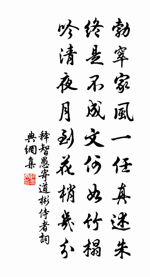 詩詞名句歷史字典書法欣賞書法字典國語詞典說文解字康熙字典古漢語字典標 題 作 者 詩 句 寄道彬侍者作者:釋智愚 朝代:宋代寄道彬侍者原文勃窣家風一任真,述朱終是不成文。何如竹榻吟清夜,月到花梢幾分。詩詞問答問:寄道彬侍者的作者是誰?答:釋智愚問:寄道彬侍者寫於哪個朝代?答:宋代釋智愚寄道彬侍者書法欣賞寄道彬侍者書法作品詩詞推薦送粲上人兼寄梁鎮員外郎士元〔唐代〕季月還鄉獨未能,林行溪宿厭層冰。尺素欲傳三署客,雪山愁送五天僧。連空朔氣橫秦苑。滿目寒雲隔灞陵。借問種花二首蘇轍〔宋代〕築室力已盡,種花功尚疏。山丹得春雨,艷色照庭除。末品何曾數,群芳自不如。今秋接千葉,試取洛人余。贈耕堂梔子花蘇泂〔宋代〕六出英英九夏寒,短叢香玉映清湍。主人自出無人管,輸與泠然隔岸看。次韻答頓起二首蘇軾〔宋代〕十二東秦比漢京,去年古寺共題名。早衰怪我遽如許,苦學憐君太瘦生。茅屋擬歸田二頃,金丹終掃雪千莖。何人之零陵郡次新亭范雲〔南北朝〕江乾遠樹浮,天末孤煙起。江天自如合,煙樹還相似。滄流未可源,高帆去何已。雪方惟深〔宋代〕剪水飛花著地乾,世間顏色比應難。謝家兒女空才思,只作因風柳絮看。寓嘆陸游〔宋代〕千載前人每暗同,眼邊俗客馬牛風。作文要可張子布,飲酒思從陳孟公。半世氛埃成潦倒,幾時蓑釣入空濛?一庵和雒酒十二弟見降羌赴闕晁補之〔宋代〕二鳥蒙恩豈有知,車書混一是昌期。知君不化伊川祭,右倚門牆恐見麾。八月五日喜雨,初陽台上作楊維楨〔元代〕敲門空過太史宅,曳杖卻上初陽台。雷從葛仙井底起,雨自黃妃塔上來。官軍捷報銅鉈陌,山人酒瀉白螺杯。憑誰送劉允叔還浙東劉過〔宋代〕樹倒群公尚不飛,先生於此獨知幾。殺身無益事成敗。閉口不言心是非。吳渚蓴鱸張翰去,鑑湖風月賀章歸。從教次洪景伯韻曾惇〔宋代〕午夜崩騰玉馬飛,春前臘後未為遲。正憐灞上詩無繼,似與山陰客有期。搖盪江花迷遠渚,埋藏海嶠失多岐。誰能獨腳令/憶王孫莫將〔宋代〕絳唇初點粉紅新。鳳鏡臨妝已逼真。苒苒釵頭香趁人。惜芳晨。玉骨冰姿別是春。舟行三章劉學箕〔宋代〕容與兮扁舟,長吟兮閒情。白石兮離離,秋雲兮霙霙。我思兮先廬,水潭兮山屏。賬空兮鶴怨,人去兮猿驚。早賦涼夜有懷 自此後詩並為應舉時作。白居易〔唐代〕清風吹枕席,白露濕衣裳。好是相親夜,漏遲天氣涼。送翼之過天台趙汝鐩〔宋代〕天台山水窟,人道是仙家。白鶴掛寒溜,赤城飛暮霞。獨攜筇杖過,莫畏石橋斜。牢記經行處,歸來向我夸。客懷李燾〔宋代〕雨意忽如此,客愁將奈何。出門誰可詣,掩卷獨高歌。塵世兔三穴,古人蓬一窠。區區奚足道,默默幸無它。次韻張子華寄示正月四日與其兄及俞叔可兄弟陳著〔宋代〕兩家昆季賀正來,投轄留連肯放回。恰第四朝春正好,合三百歲老相語。有光西洛菜羹社,同醉東坡蕉葉杯。何似記雜畫嘗醋圖劉克莊〔宋代〕釀者不沾唇,旁觀吸者顰。翁真堪宰相,嫗亦可夫人。苦寒歌韓愈〔唐代〕黃昏苦寒歌,夜半不能休。豈不有陽春,節歲聿其周,君何愛重裘。兼味養大賢,冰食葛制神所憐。填窗塞戶慎勿曲池陪宴即事上竇中丞熊孺登〔唐代〕水自山阿繞坐來,珊瑚台上木綿開。欲知舉目無情罰,一片段預告流酒一杯。名句推薦靜女其孌,貽我彤管。佚名《靜女》 城上高樓接大荒,海天愁思正茫茫。柳宗元《登柳州城樓寄漳汀封連四州》 拱把之桐梓,人苟欲生之,皆知所以養之者。孟子《孟子·告子章句上·第十三節》 無善而致人譽,不如無惡而致人毀。洪應明《菜根譚·概論》 竹柏皆凍死,況彼無衣民。白居易《村居苦寒》 盡道豐年瑞,豐年事若何羅隱《雪》 赤壁磯頭落照,肥水橋邊衰草,渺渺喚人愁張孝祥《水調歌頭·和龐佑父》 正見空江明月來,雲水蒼茫失江路。歐陽修《晚泊岳陽》 烹羊宰牛且為樂,會須一飲三百杯。李白《將進酒》 致人於死,莫逾構其反也;誘人以服,非刑之無得焉。來俊臣《羅織經·刑罰卷第十一》