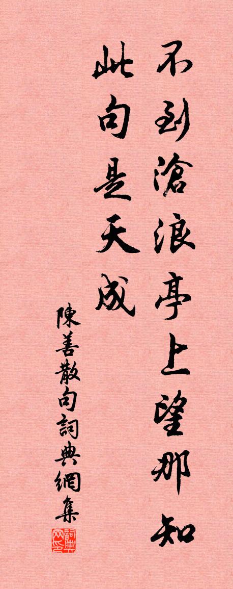 詩詞名句歷史字典書法欣賞書法字典國語詞典說文解字康熙字典古漢語字典標 題 作 者 詩 句 句作者:陳善 朝代:宋代句原文不到滄浪亭上望,那知此句是天成。詩詞問答問:句的作者是誰?答:陳善問:句寫於哪個朝代?答:宋代陳善句書法欣賞句書法作品詩詞推薦送蔡君知入蜀二首孔德紹〔唐代〕金陵已去國,銅梁忽背飛。失路遠相送,他鄉何日歸。靈關九折險,蜀道二星遙。乘槎若有便,希泛廣陵潮。和彥沖胡寅〔宋代〕詩腑五字城,酒腸九曲灣。興來摧高堅,觴至輸潺湲。眷此山澗曲,素緇邀畿寰。人境俱寄陶,陋巷同樂顏。新黍侍太夫人拜掃先塋季直弟有詩因次其韻喻良能〔宋代〕東郊雲氣曉疏疏,十里相攜霽色初。林幄盡頭聞杜宇,荇絲深處見王餘。提壺相勸仍沽酒,扶杖來觀或荷鋤。不向過漁浦王冕〔元代〕十八里河船不行,江頭日日問潮生。未同待詔於金馬,卻異看花在錦城。萬里春風歸思好,四更寒雨一燈明。故人和董伯玉不向東山久韻吳芾〔宋代〕野外少過從,出門欲何向。所幸得夫君,相與樂閒曠。年來既倦遊,老去那病忘。且復對酒樽,尚須時一訪。舍北搖落景物殊佳偶作陸游〔宋代〕路擁新霜葉,溪余舊漲沙。棲烏初滿樹,歸鴨各知家。世事元堪笑,吾生固有涯。南村聞酒熟,試遣小僮賒。寄餘干徐隱甫黃庭堅〔宋代〕江行長邅回,風水憂索米。相逢解人頤,高士徐孺子。鸕鶿葭葦間,煮茗當酌醴。夜船餉蒸鵝,白髮厭甘旨。東江送洪內翰知太平府沈繼祖〔宋代〕文章有正派,此派公獨傳。中絕僅如線,鸞膠真續弦。自有乘法累,吾道幾棄捐。相挻入茫昧,一律爭談玄。誰洗綠珠渡徐噩〔宋代〕早出綠蘿村,晚過綠珠渡。日落白州城,草荒梁女墓。江水流古今,滔滔不相顧。今人不見古時人,依舊青山路如光相寺范成大〔宋代〕峰頂四時如大冬,芳花芳草春自融。苔痕新曦六月雪,木勢舊偃千年風。雲物為人布世界,日輪同我行虛空。浮生舟行五絕張耒〔宋代〕獵獵西風秋水清,野花寒草傍流生。沙邊水鶴待魚立,石底暗蛩先夜鳴。游張公祠二首李曾伯〔宋代〕十年重過石橋行,松下清流載濯纓。洞隔煙霞知地遠,壇連仙佛信天成。人如雲意俱閒適,山帶霜容似瘦生。步出秋夕池上錢惟演〔宋代〕珪月上金塘,煙容帶水光。朱華接蘭坂,綠荇溢魚防。叢暗禽棲密,林疏露下涼。秋懷已潘鬢,無柰更啼螿。句張釜〔宋代〕其如衰病只傷神。挽觀登使鄭尚書李曾伯〔宋代〕許史推華閱,歐韓策雋名。風流接南渡,步武到西清。玉帳勞籌筆,彤墀識履聲。壯懷馳萬里,誰壞國金城。較藝書事再呈永叔並同院諸公王珪〔唐代〕小雨班班拂曉除,新禽格礫靜相呼。眼窺夜卷千花碧,肺渴春盤幾露珠。只見樓頭飄落絮,不知門外長青蕪。玉階梅釋行海〔宋代〕玉門關外雜塵埃,白帝城邊對酒杯。今日孤山尤可惜,已無和靖在時梅。糖多令 釋懷寄友人曹伯啟〔元代〕衰境日匆匆。浮生一夢中。笑愁懷、萬古皆同。越水燕山南北道,來不盡,去無窮。萍水偶相逢。晴天接遠鴻。似奉寄崔伯易王令〔宋代〕功業嘗聞亦有時,可能天命出依違。終看世態真何道,不得吾心自合歸。廊廟得逢應有義,草茅雖老尚知非。秋來次韻郭季勇機宜雪觀席上留別范成大〔宋代〕勝絕尊前萬事休,縱非吾土且登樓。山迎雨腳俄飛過,風約江聲欲倒流。名句推薦佇立傷神。無奈輕寒著摸人。朱淑真《減字木蘭花·春怨》 美不美,鄉中水;親不親,故鄉人。佚名《增廣賢文·上集》 內外相應也,言行相稱韓非及後人《韓非子·解老》 八月寒葦花,秋江浪頭白。李頎《送劉昱》 從善如登,從惡如崩司馬光《資治通鑑·魏紀·魏紀三》 一夕輕雷落萬絲,霽光浮瓦碧參差。秦觀《春日》 白兔搗藥秋復春,嫦娥孤棲與誰鄰?李白《把酒問月·故人賈淳令予問之》 紅豆不堪看,滿眼相思淚。牛希濟《生查子·新月曲如眉》 蛇無頭而不行,鳥無翅而不飛。施耐庵《水滸傳·第六十回》 彩線輕纏紅玉臂,小符斜掛綠雲鬟。蘇軾《浣溪沙·端午》