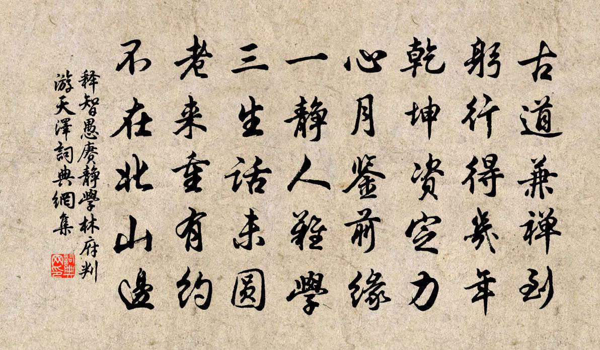 詩詞名句歷史字典書法欣賞書法字典國語詞典說文解字康熙字典古漢語字典標 題 作 者 詩 句 賡靜學林府判游天澤作者:釋智愚 朝代:宋代賡靜學林府判游天澤原文古道兼禪到,躬行得幾年。乾坤資定力,心月鑒前緣。一靜人難學,三生話未圓。老來重有約,不在北山邊。詩詞問答問:賡靜學林府判游天澤的作者是誰?答:釋智愚問:賡靜學林府判游天澤寫於哪個朝代?答:宋代釋智愚賡靜學林府判游天澤書法欣賞賡靜學林府判游天澤書法作品詩詞推薦郴江百詠並序藏春亭阮閱〔宋代〕百紫千紅一徑深,臙脂為地粉為林。有人來問春何在,向道花間無處尋。會真詩三十韻元稹〔唐代〕微月透簾櫳,螢光度碧空。遙天初縹緲,低樹漸蔥蘢。龍吹過庭竹,鸞歌拂井桐。羅綃垂薄霧,環佩響輕風。絳節折菊杜牧〔唐代〕籬東菊徑深,折得自孤吟。雨中衣半濕,擁鼻自知心。木犀初發呈張功父又和六首楊萬里〔宋代〕分得吳剛斫處林,鵝兒酒色不須深。系從犀首名乾木,泒別黃香字子金。衣濺薔薇兼水麝,韻如月杵應霜砧。余芬次韻木蘊之狀元義烏道中一首喻良能〔宋代〕奔走塵埃老未休,每思上下兩岩稠。關心簿領三書考,回首家山兩換秋。搘腹自憐鷦鼴小,江湖誰計雁鳧留。又遮雪後尋梅偶得絕句十首陸游〔宋代〕青帝宮中第一妃,寶香熏徹素綃衣。定知謫墮不容久,萬斛玉塵來聘歸。花洞王之道〔宋代〕浮渡竟何處,欲游未能游。夢寐金谷岩,神往形獨留。異哉城市中,芳菲自春秋。長紅雜團綠,結成岩穴幽。靜晁說之〔宋代〕蕭然一室靜,樂只復何如。子晉吹笙罷,孫登長嘯余。兒童奔入學,賓客遠回車。更願干戈息,殘年老弊廬。歌兩淮員興宗〔宋代〕君不見北風吹淮風浪黑,鐵馬千群凝一色。當時廟論孰鬼,將相無言潛動魄。或雲南紀當何憂,今代諸葛身姓劉。又三絕文天祥〔宋代〕世事蒙蒙醉不知,南山秋意滿東籬。黃花何故無顏色,應為元嘉以後詩。西江月 贈安靜散人俱守極馬鈺〔元代〕休要尋龍尋虎,不須搜奼搜嬰。勿勞講論汞鉛精。儘是虛名惑恁。只要心中清靜。無為便是功成。慈悲相助氣神凝林下五吟邵雍〔宋代〕有物輕醇號太和,半醺中最得春多。靈丹換骨還如否,白日升天似得麽。侭快意時仍起舞,到忘言處只謳歌。賓朋黃鴉吟陸游〔宋代〕嗟哉黃鴉一何陋!性喜隱翳藏荒囿。煙深翅重飛不起,鳴聲穀穀知雨候。夜與妖鵩群,又似惡白晝。羽毛不足辱彈送張伯起入都二首方回〔宋代〕西湖風景異,因仕住桐川。太守令求宅,諸生為買田。冷官清可喜,遠道老堪憐。何似嚴灘守,投簪二十年。九月初十日值宿玉堂七絕劉克莊〔宋代〕轉枕依然夢不成,小窗頗覺曉寒生。昏花卻怕宮蓮照,垂下紗幮聽六更。採桑子納蘭性德〔清代〕那能寂寞芳菲節,欲話生平。夜已三更。一闋悲歌淚暗零。須知秋葉春花促,點鬢星星。遇酒須傾,莫問千秋萬歲柳梢青 以上四首,許楨步其父許有壬韻,附許楨〔元代〕山遠生嵐。溪清呈底,剡棹收帆。風物依然,爛紅茶樹,回色青柑。暗香寒阻梅庵。把楮穎、權收墨籃。曖閣紅爐端午帖子太上皇后閣周必大〔宋代〕檻有榴花沼有蓮,瑤池歡宴晚涼天。一年一度為重午,此去應須過萬年。朝中措張掄〔宋代〕碧波深處錦鱗游。波面小漁舟。不為來貪香餌,如何賺得吞鉤。緣蓑青箬,吾生自斷,終老汀洲。買斷一江風月,秋雷嘆范成大〔宋代〕立秋之雷損萬斛,吳儂記此占年縠。汰哉豐隆無籍在,政用此時鳴孛轤。向來夏旱連三月,吁嗟抗訴聲滿屋。訟風名句推薦我有一罇酒,欲以贈遠人。佚名《舊題蘇武詩 / 別詩四首·其一》 花明柳暗繞天愁,上盡重城更上樓。李商隱《夕陽樓》 逢郎欲語低頭笑,碧玉搔頭落水中。白居易《採蓮曲》 未晚先投宿,雞鳴早看天。佚名《增廣賢文·上集》 草樹知春不久歸,百般紅紫斗芳菲。韓愈《晚春》 以德就列,以官服事,以勞殿賞,量功而分祿。墨子《墨子·08章 尚賢(上)》 孤燈寒照雨,濕竹暗浮煙。司空曙《雲陽館與韓紳宿別》 一味學吃虧,是處事良方。王永彬《圍爐夜話·第五四則》 婦人依倚子與夫,同居貧賤心亦舒。張籍《征婦怨》 君子不怨天,不尤人。孟子《孟子·公孫丑章句下·第十三節》