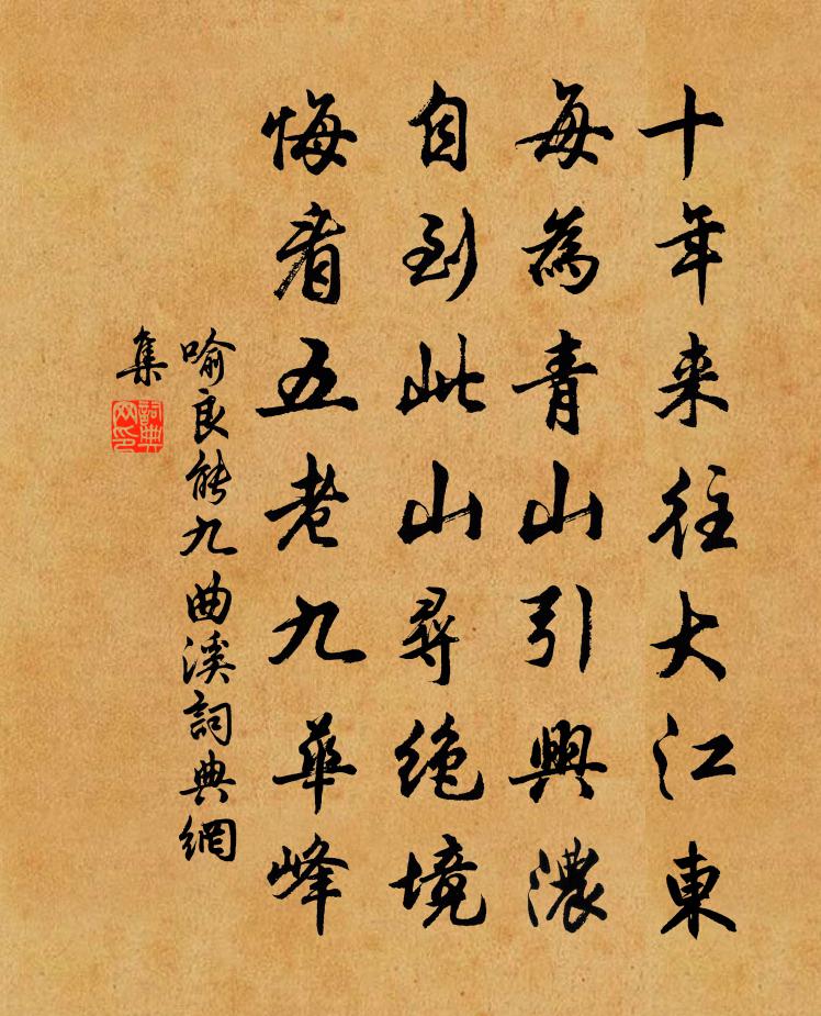 詩詞名句歷史字典書法欣賞書法字典國語詞典說文解字康熙字典古漢語字典標 題 作 者 詩 句 九曲溪作者:喻良能 朝代:宋代九曲溪原文十年來往大江東,每為青山引興濃。自到此山尋絕境,悔看五老九華峰。詩詞問答問:九曲溪的作者是誰?答:喻良能問:九曲溪寫於哪個朝代?答:宋代喻良能九曲溪書法欣賞九曲溪書法作品詩詞推薦與諸子登峴山孟浩然〔唐代〕人事有代謝,往來成古今。江山留勝跡,我輩復登臨。水落魚梁淺,天寒夢澤深。羊公碑尚在,讀罷淚沾襟。桂州黃潭舜祠宋之問〔唐代〕虞世巡百越,相傳葬九疑。精靈游此地,祠樹日光輝。禋祭忽群望,丹青圖二妃。神來獸率舞,仙去鳳還飛。日暝卜運算元(燕)劉克莊〔宋代〕已怪社愆期,尚喜巢如故。過了清明未肯來,莫被春寒誤。常傍畫檐飛,忽委空梁去。忘卻王家與謝家,別有銜泥晚飯後步至門外並溪而歸陸游〔宋代〕徐行摩腹出荊扉,掠面風尖酒力微。市步空船迎荻去,湖堤輕擔賣魚歸。潺潺沙竇鳴殘水,莽莽平蕪襯落暉。商略吊林和靖二首 其一朱淑真〔宋代〕不見孤山處士星,西湖風月為誰清。當時寂寞冰霜下,兩句詩成萬古名。昌化道中連文鳳〔宋代〕水因來此地,不識別山春。幾處墳無主,多年樹有神。聞猨驚落日,畏虎問行人。忽到孤峰頂,白雲飛滿身。初度寓郡楊公遠〔宋代〕得失榮枯付分休,康強之外復何求。靈台洞徹天無夜,銀海精明月正秋。謾賦律章酬誕節,旋沽官醞破羈愁。生來臨濟大師贊釋如珙〔宋代〕得馬祖百丈黃檗之旨,發自己胸中本有底光明。見僧入門便喝,謂之臨濟一宗。三世諸佛構不著,狸奴白牯鬼不著贈孫次山周必大〔宋代〕南澗有奇松,歲晚郁青蒼。北隴有寒梅,同傲雪與霜。實大華更榮,二美乃相望。我從采樵歸,聞此百步香。不辭頌古釋慧空〔宋代〕馬師瞎卻亮師眼,一入西山更不返。我有二十二藤條,寄與山中這擔板。卜運算元(初十日海棠宋十一哥家飲)韓淲〔宋代〕煙雨海棠花,春夜沈沈酌。寒食清明數日間,人也須行樂。不怕笛聲長,只怕風兒惡。燭影紅酣寶篆香,樓上黃昏贈少室山麻襦僧姚合〔唐代〕只辮麻為衲,此中經幾春。庵前多猛獸,徑小絕行人。泉近濆瓶履,山深少垢塵。想師 * 指,喻我獨迷津。春雪韓愈〔唐代〕片片驅鴻急,紛紛逐吹斜。到江還作水,著樹漸成花。越喜飛排瘴,胡愁厚蓋砂。兼雲封洞口,助月照天涯。暝見醜奴兒/採桑子王仲甫〔宋代〕牡丹不好長春好,有個因依。一兩枝兒。但是風光總屬伊。當初祗為嫦娥種,月正明時。教恁芳菲。伴著團圓十二雪樓鑰〔宋代〕丙午九月才入冬,晦日忽驚雪墮空。傳聞都城更復早,萬官入賀明光宮。自從開霽更不雨,和氣直似青春濃。斗柄醉鄉陸游〔宋代〕醉鄉卜築亦佳哉,但苦無情白髮催。痴欲煎膠黏日月,狂思入海訪蓬萊。辭巢歸燕先秋去,泣露幽花近社開。莫惜送徐季純趙蕃〔宋代〕觸目偽耶真,先生金玉人。須知託交契,不特為情親。謁告歸何遽,連環夢豈頻。還有已春服,采戲不妨新。一經堂為王亦顏題王之道〔宋代〕我生非我有,天地暫委形。諦觀子若孫,相值如浮萍。崔昭與李兼,甚矣愚不靈。積錢遺芸窟,轉手還星星。何如雲羅鄴〔唐代〕紛紛靄靄遍江湖,得路為霖豈合無。莫使悠颺只如此,帝鄉還更暖蒼梧。聞李十一出牧澧州,崔二十二出牧果州,因寄絕句白居易〔唐代〕平生相見即眉開,靜念無如李與崔。各是天涯為刺史,緣何不覓九江來?名句推薦忽如一夜春風來,千樹萬樹梨花開。岑參《白雪歌送武判官歸京》 不枉東風吹客淚。相思難表,夢魂無據,惟有歸來是。歐陽修《青玉案·一年春事都來幾》 輕汗微微透碧紈,明朝端午浴芳蘭。蘇軾《浣溪沙·端午》 二人同心,其利斷金。同心之言,其臭如蘭。佚名《易傳·繫辭傳上·第八章》 兒孫自有兒孫福,莫為兒孫做馬牛。佚名《增廣賢文·上集》 今宵絕勝無人共,臥看星河盡意明。陳與義《雨晴·天缺西南江面清》 不要人夸顏色好,只留清氣滿乾坤。王冕《墨梅》 清明時節雨紛紛,路上行人慾斷魂。杜牧《清明》 辭君向天姥,拂石臥秋霜。李白《別儲邕之剡中》 春無蹤跡誰知。除非問取黃鸝。黃庭堅《清平樂·春歸何處》