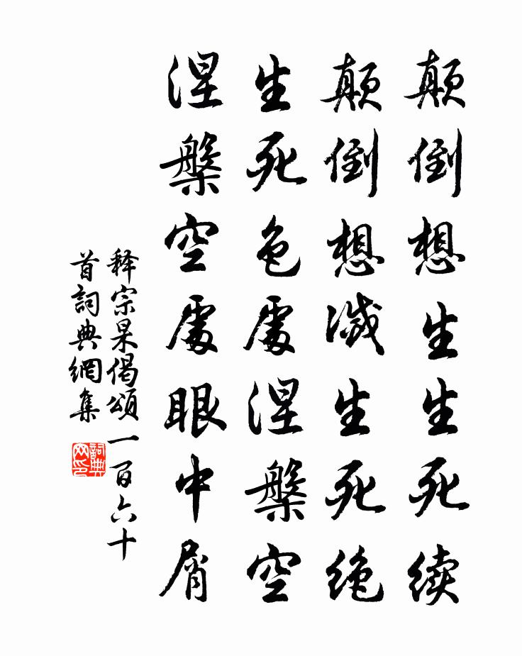 詩詞名句歷史字典書法欣賞書法字典國語詞典說文解字康熙字典古漢語字典標 題 作 者 詩 句 偈頌一百六十首作者:釋宗杲 朝代:宋代偈頌一百六十首原文顛倒想生生死續,顛倒想滅生死絕。生死色處涅槃空,涅槃空處眼中屑。詩詞問答問:偈頌一百六十首的作者是誰?答:釋宗杲問:偈頌一百六十首寫於哪個朝代?答:宋代釋宗杲偈頌一百六十首書法欣賞偈頌一百六十首書法作品詩詞推薦興福寺真山民〔宋代〕為厭市喧雜,攜詩來此吟。鳥聲山路靜,花影寺門深。樓閣莊嚴界,池塘清淨心。松風亦好事,送客出前林。虞美人蘇軾〔宋代〕深深庭院清明過。桃李初紅破。柳絲搭在玉闌乾。簾外瀟瀟微雨、做輕寒。晚晴台榭增明媚。已拼花前醉。更闌人高宗郊祀前廟朝享太廟三十首真宗〔宋代〕赫赫明明,維祖維宗。鑒於文孫,維德之同。日靖四方,亦同其功。億萬斯年,以承家邦。晏成續太祝遺雙井茶五品茶具四枚近詩六十篇梅堯臣〔宋代〕始於歐陽永叔席,乃識雙井絕品茶。次逢江東許子春,又出鷹爪與露芽。鷹爪斷之中有光,蹍成雪色浮乳花。晏公或遺木瓜有雙實者香甚戲作陸游〔宋代〕宣城繡瓜有奇香,偶得並蔕置枕傍。六根互用亦何常?我以鼻嗅代舌嘗。再和時習五章取禮記一句月令上丁習舞釋菜袁甫〔宋代〕聖道洋洋滄海如,不流天下只流洙。上丁釋菜今非古,喚起遺鳳屬我徒。與吳侍御春遊元稹〔唐代〕蒼龍闕下陪驄馬,紫閣峰頭見白雲。滿眼流光隨日度,今朝花落更紛紛。西樓晚望張伯玉〔宋代〕疊岫斂餘霞,輕舠簇遠沙。斜陽媚城郭,細柳雜汀花。兩兩聯歸騎,蕭蕭起暮鴉。誰知故園興,閒在使君家。齊桓晉文之事佚名〔先秦〕齊宣王問曰:“齊桓、晉文之事,可得聞乎?” 孟子對曰:“仲尼之徒,無道桓、文之事者,是以後世無傳焉使君次韻再賦二首劉克莊〔宋代〕當年雙璧甲科郎,未羨燕山五桂芳。奏賦何曾因狗監,諫書直乞罷鷹坊。聚螢窗冷韋編蠹,下馬陵蕪宰樹蒼。不是次韻寄史彥明牟巘五〔宋代〕等閒看盡弁衡毗,旁郡聊從捧檄馳。候管乍披新定志,郵筒忽見故人詩。君方清絕行明鏡,我正摧頹據槁枝。為喜漁父詞/漁父薛師石〔宋代〕平明霧靄雨初晴。兒子敲針作釣成。香餌小,繭絲輕。釣得魚兒不識名。寄劉方平皇甫冉〔唐代〕坐憶山中人,窮棲事南畝。煙霞相親外,墟落今何有。潘郎作賦年,陶令辭官後。達生遺自適,良願固無負。田取老翁吟邵雍〔宋代〕皤然一老翁,凡百事皆慵。舊物不盡記,故人難得逢。幽花渾在霧,殘夢半隨風。只且願天下,時和與歲豐。採蓮女李中〔唐代〕晚涼含笑上蘭舟,波底紅妝影欲浮。陌上少年休植足,荷香深處不回頭。感蛙錢時〔宋代〕翠蟾戛戛鬧黃昏,反手為妖覆手祥。明月夜光遭按劍,可憐箕子學佯狂。張翰惠書告窘朱翌〔宋代〕伯龍營什一,撫掌鬼在側。燕公鑄橫財,地下萬爐執。貧富有物司,得失難智索。我今竟日餐,或待門生設。圾園四時白紵歌 冬白紵沈約〔南北朝〕寒閨晝密羅幌垂。婉容麗色心相知。雙去雙還誓不移。長袖拂面為君施。翡翠羣飛飛不息。願在雲間長比翼。佩服劉有詩再次韻四首陳造〔宋代〕此君高韻已蕭然,更向新詩得媚川。誰遣小家藏二妙,為君時炷水沉煙。竹奴曾幾〔宋代〕霧帳桃笙晝寢餘,此君那可一朝無。秋來冷落同班扇,歲晚溫柔是錫奴。名句推薦春近寒雖轉,梅舒雪尚飄。陰鏗《雪裡梅花詩》 花繁柳密處,撥得開,才是手段;風狂雨急時,立得定,方見腳根。陳繼儒《小窗幽記·集醒篇》 獨倚危欄,神遊無際,天地猶嫌隘。朱栴《念奴嬌·雪霽夜月中登樓望賀蘭山作》 白馬金羈遼海東,羅帷繡被臥春風。李白《春怨》 朝來嗔寂寞,不肯試新衣。馮夢龍《喻世明言·卷一》 一場愁夢酒醒時,斜陽卻照深深院。晏殊《踏莎行·小徑紅稀》 寒雨連江夜入吳,平明送客楚山孤。王昌齡《芙蓉樓送辛漸》 朱弦已為佳人絕,青眼聊因美酒橫。黃庭堅《登快閣》 何處望神州?滿眼風光北固樓。辛棄疾《南鄉子·登京口北固亭有懷》 晚年唯好靜,萬事不關心。王維《酬張少府》