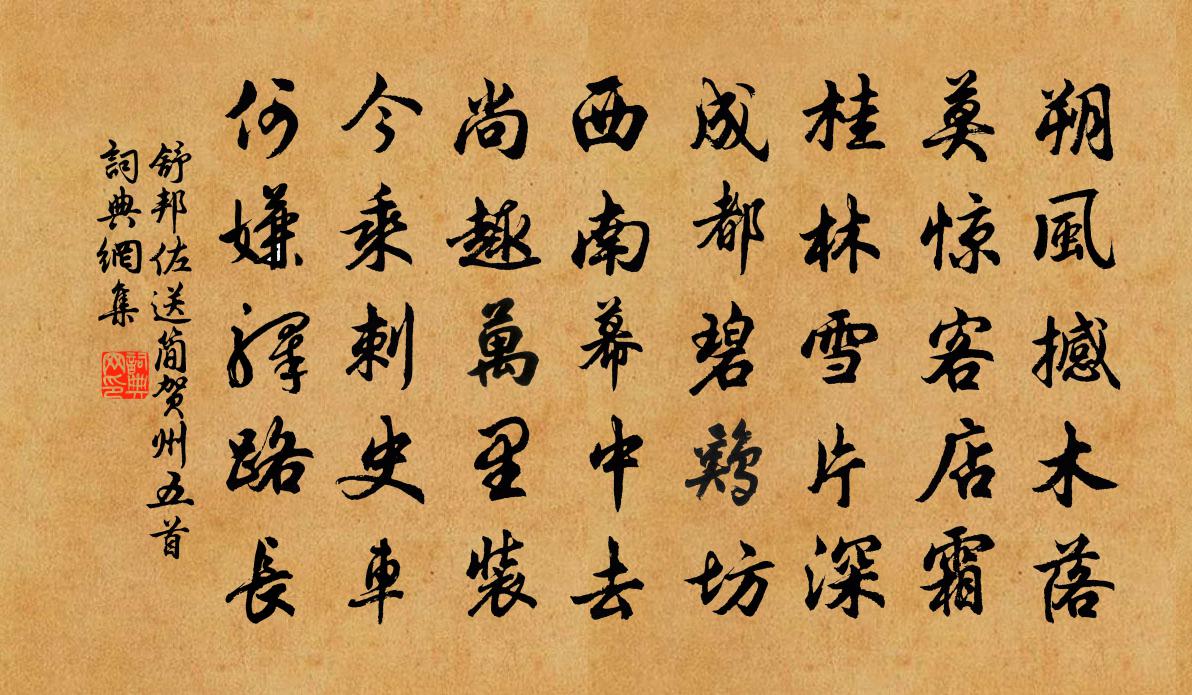 詩詞名句歷史字典書法欣賞書法字典國語詞典說文解字康熙字典古漢語字典標 題 作 者 詩 句 送簡賀州五首作者:舒邦佐 朝代:宋代送簡賀州五首原文朔風撼木落,莫驚客店霜。桂林雪片深,成都碧雞坊。西南幕中去,尚趣萬里裝。今乘刺史車,何嫌驛路長。詩詞問答問:送簡賀州五首的作者是誰?答:舒邦佐問:送簡賀州五首寫於哪個朝代?答:宋代舒邦佐送簡賀州五首書法欣賞送簡賀州五首書法作品詩詞推薦經故丁補闕郊居許渾〔唐代〕死酬知己道終全,波暖孤冰且自堅。鵩上承塵才一日,鶴歸華表已千年。風吹藥蔓迷樵徑,雨暗蘆花失釣船。四尺中秋月項安世〔宋代〕素娥行處與誰同,玉斧修成幾許功。空里若安丹桂木,雲中應有白銀宮。蟾行萬里惟三足,兔滿千山望一雄。海闊餘姚胡氏繡觀音求頌釋正覺〔宋代〕線蹊密密度金針,一一針針觀世音。妙淨莊嚴成相好,光明感應發身心。江橫練色月浮水,雨灌華枝春在林。聞見金蹄樓鑰〔宋代〕金蹄垂耳小韓盧,飾以重鐶馴可呼。誰擊冬青碧陰下,恍然如見擊梧圖。宋江三十六贊龔開〔宋代〕古人用智,義國安民。惜哉所予,酒色粗人。秋日閒居二首潘璵〔宋代〕西風挾雨地江來,水樹煙村罨畫開。待得夜晴窗有月,橫斜只欠數枝梅。漁父辭毛直方〔宋代〕黃昏船泊有鄰居,明朝船散又還無。君笑我如浮萍草,我看君似水井鳧。江神子/江城子李之儀〔宋代〕惱人天氣雪消時。落梅飛。日初遲。小閣幽窗,時節聽黃鸝。新洗頭來嬌困甚,才試著,夾羅衣。木梨花拂淡燕脂新筍釋德輝〔宋代〕竹筍初生牛犢角,蕨芽新長小兒拳。旋挑野菜炊香飯,便是江南二月天。水龍吟(癸丑二月襄陽得捷,和劉制參韻)李曾伯〔宋代〕黃旗吉語飛來,胡兒已落將軍手。吾皇神武,一新城郭,斷謨天授。鐵騎才臨,雕戈競逐,擊蛇先首。快風驅雨洗聞杜鵑陳著〔宋代〕帝魂舊話是耶非,知得安危動處幾。自出蜀啼隨地氣,直過洛去泄天機。春風萬古此心在,雲樹千山何日歸。聽到誰將王安石〔宋代〕誰將石黛染春潮,復捻黃金作柳條。西崦東溝從此好,筍輿追我莫辭遙。風入松趙聞禮〔宋代〕麴塵風雨亂春晴。花重寒輕。珠簾卷上還重下,怕東風、吹散歌聲。棋倦杯頻晝永,粉香花艷清明。十分無處著閒寒食夜寄姚侍郎張籍〔唐代〕貧官多寂寞,不異野人居。作酒和山藥,教兒寫道書。五湖歸去遠,百事病來疏。況憶同懷者,寒庭月上初。送郝同知方回〔宋代〕仆昔塵忝歲壬戌,甲科為首降為乙。宰相謂己□□□,□實見怒出私臆。漢東掌教大洪山,寄名帥幕□□。□陵還峴山蘇軾〔宋代〕遠客來自南,游塵昏峴首。過關無百步,曠盪吞楚藪。登高忽惆悵,千載意有偶。所憂誰復知,嗟我生苦後。團團石華表徐宗斗〔宋代〕仙人窀穸古,山寂自崔嵬。一柱華天表,千年壯壑隈。春深青薜荔,雨足綠蒼苔。世遠空遺蹟,令威何日回。喜雨三首呈景仁侍郎兼獻在尹宣徽司馬光〔宋代〕麥田正塵坌,桑徑忽滂沱。比屋起相告,荷鋤行且歌。園林半扃鎖,車馬絕經過。大尹愛民物,何妨喜更多。謝傅監倉陳宓〔宋代〕昔年常侍紫樞仙,風骨森然在眼前。一覽十行俱默誦,三更殘卷尚朱箋。詩書自古稱難繼,衣缽於今信有傳。每拜和范景仁王景彝殿中雜題三十八首並次韻其十梅堯臣〔宋代〕重說已經旬,應懷獨寢人。通宵彈玉枕,白晝拂床塵。幾想迎雕輦,何當快倦身。門前車馬立,疑是角生輪。名句推薦以權利合者,權利盡而交疏。司馬遷《史記·鄭世家》 車遙遙兮馬洋洋,追思君兮不可忘。傅玄《車遙遙篇》 獨憐幽草澗邊生,上有黃鸝深樹鳴。韋應物《滁州西澗》 人生天地之間,若白駒之過隙,忽然而已。莊子《莊子·外篇·知北游》 一年之計在於春,一日之計在於寅。佚名《增廣賢文·上集》 桃根桃葉終相守,伴殷勤、雙宿鴛鴦。納蘭性德《一叢花·詠並蒂蓮》 金帶連環束戰袍,馬頭沖雪度臨洮。馬戴《出塞詞》 幾處早鶯爭暖樹,誰家新燕啄春泥。白居易《錢塘湖春行》 言之易,行之難呂不韋《呂氏春秋·論·不苟論》 明日隔山嶽,世事兩茫茫。杜甫《贈衛八處士》